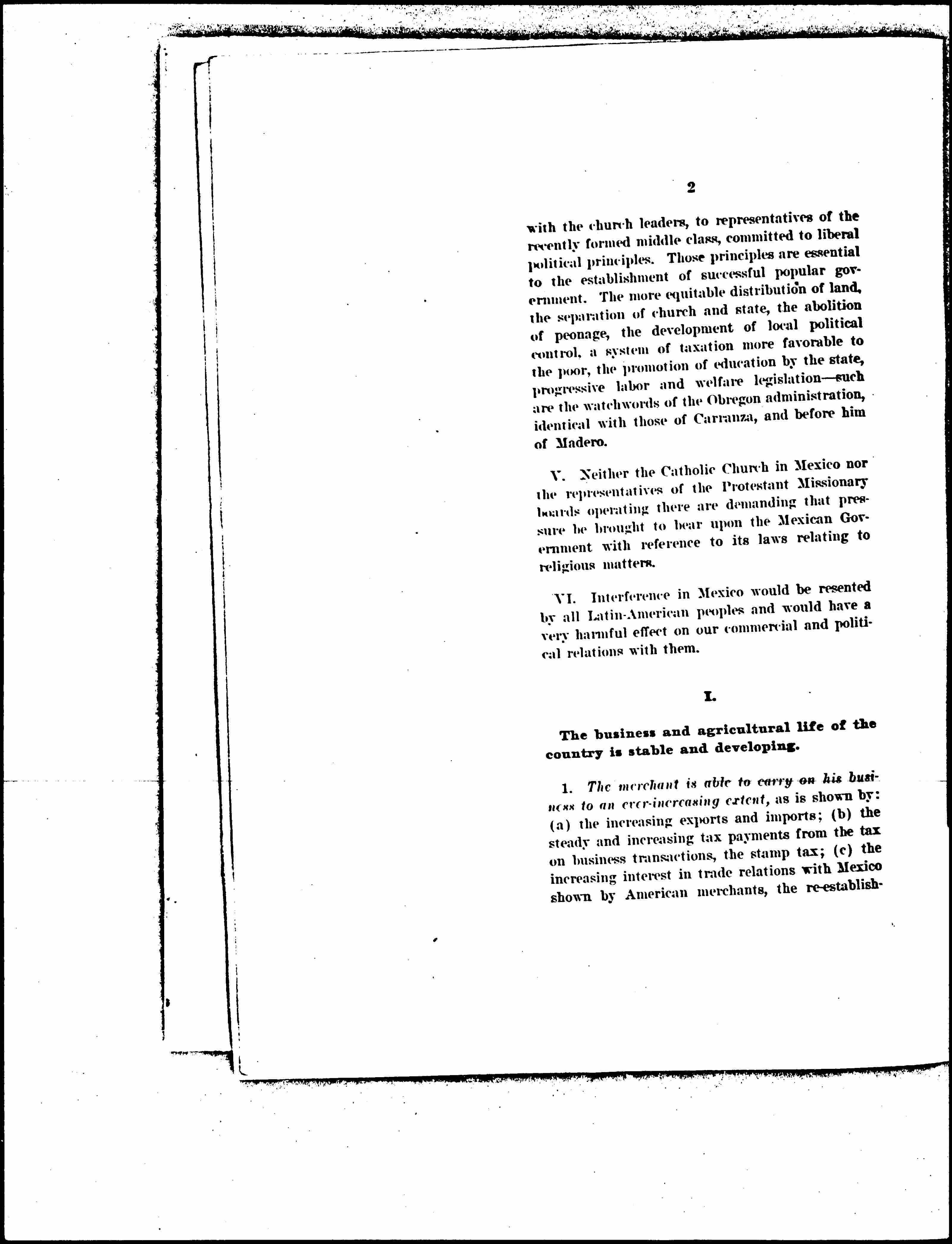 II. The government is everywhere recognized; no revolutionary movement threatening the permanence of the government is under way. The return of normal relations between the United States and Mexico -- political, commercial and financial -- the last of these in particular depending on the first, would assure great advantages to American business, and would, we believe, insure the firm establishment of the present Mexican administration, thus banishing the fear of and reason for intervention.