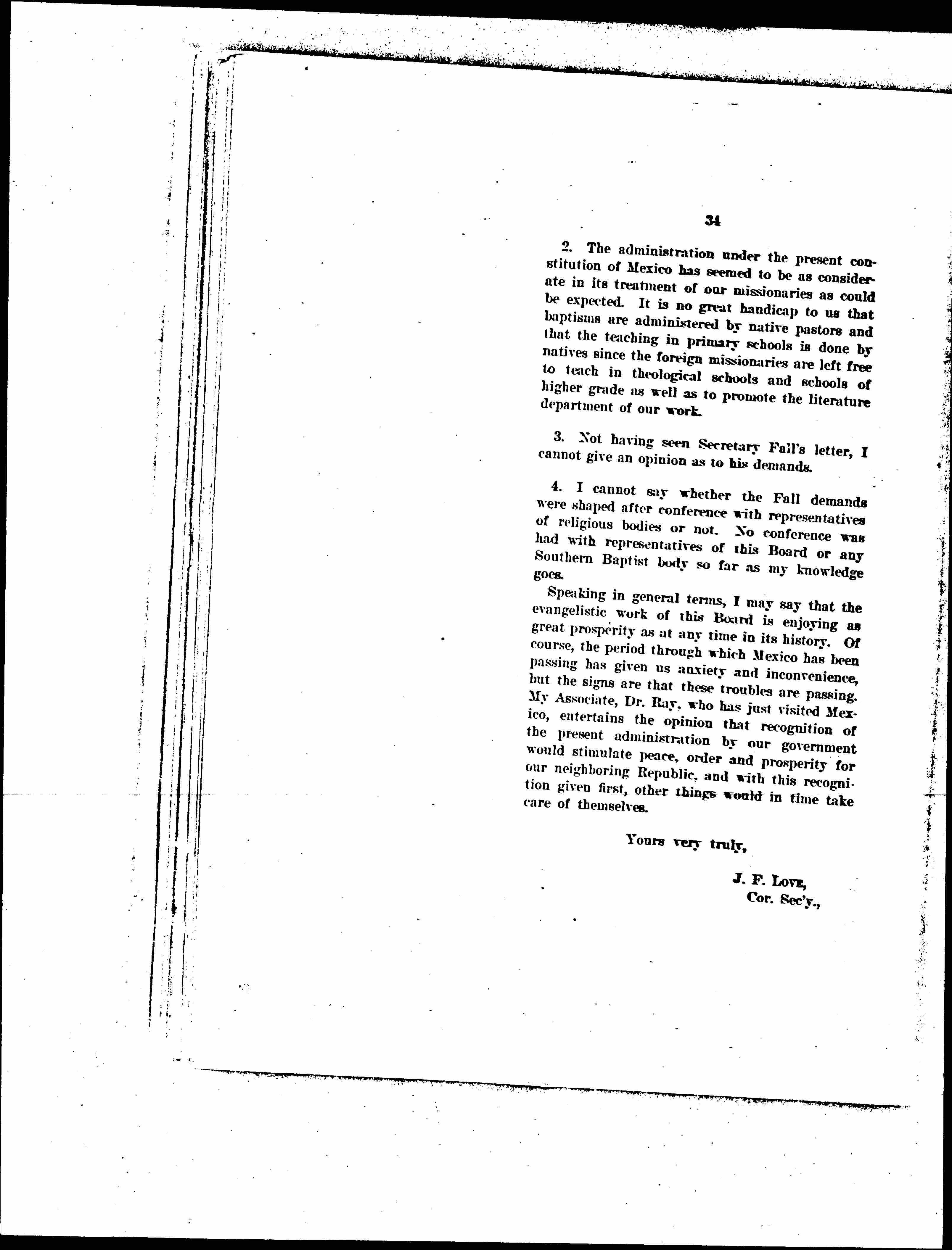 2. The administration under the present constitution of Mexico has seemed to be as considerate in its treatment of our missionaries as could be expected. It is no great handicap to us that baptisms are administered by native pastors and that the teaching in primary schools is done by natives since the foreign missionaries are left free to teach in theological schools and schools of higher grade as well as to promote the literature department of our work.