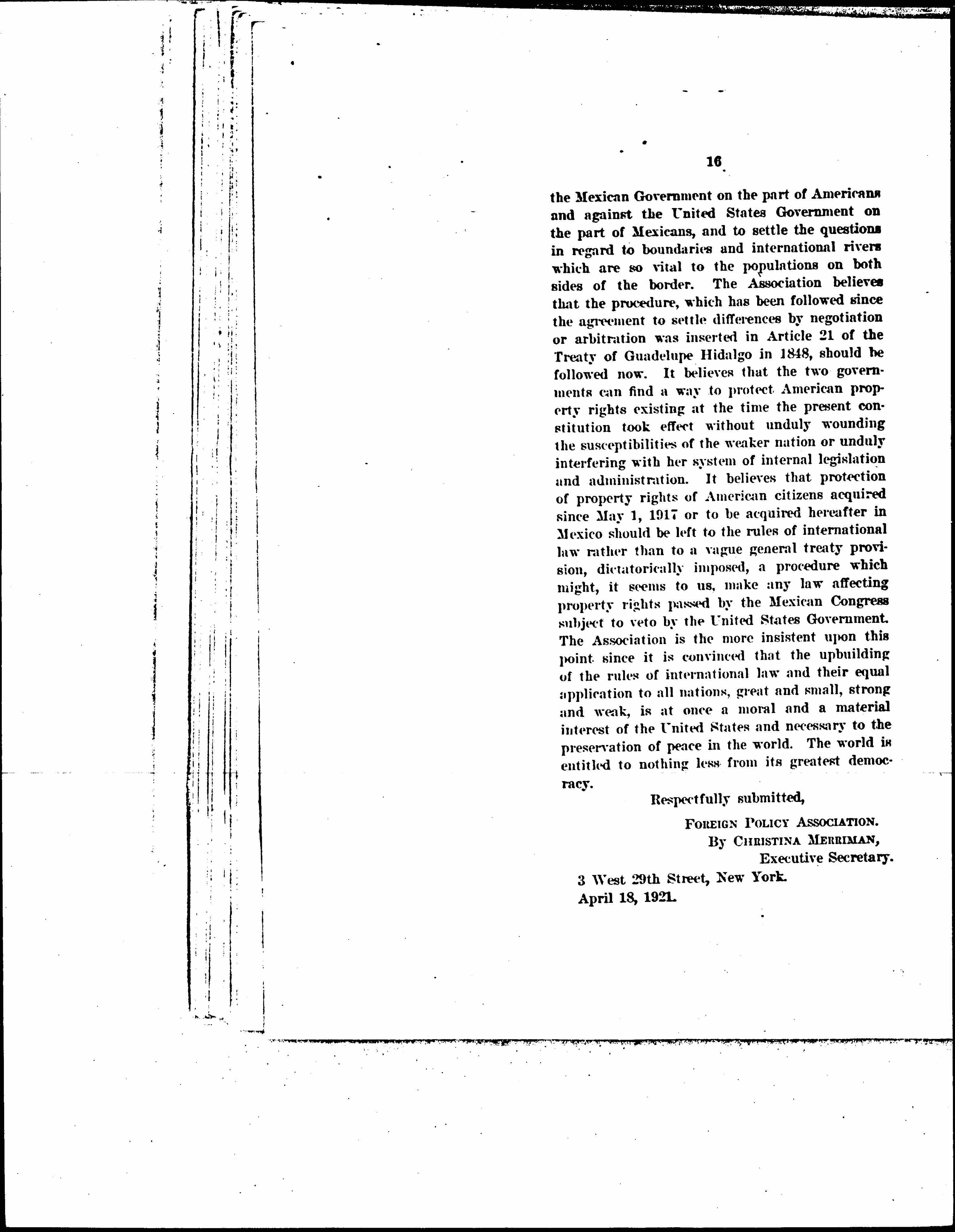 The Association believes that joint commissions should be set up to fix claims for damages against [page 17] the Mexican Government on the part of Americans and against the United States Government on the part of Mexicans, and to settle the questions in regard to boundaries and international rivers which are so vital to the populations on both sides of the border. The Association believes that the procedure, which has been followed since the agreement to settle differences by negotiation or arbitration was inserted in Article 21 of the Treaty of [Guadalupe] Hidalgo in 1848, should be followed now. It believes that the two governments can find a way to protect American property rights existing at the time the present constitution took effect without unduly wounding the susceptibilities of the weaker nation or unduly interfering with her system of internal legislation and administration. It believes that protection of property rights of American citizens acquired since May 1, 1917 or to be acquired hereafter in Mexico should be left to the rules of international law rather than to a vague general treaty provision, [dictatorially] imposed, a procedure which might, it seems to us, make any law affecting property rights passed by the Mexican Congress subject to veto by the United States Government. The Association is the more insistent upon this point since it is convinced that the upbuilding of the rules of international law and their equal application to all nations, great and small, strong and weak, is at once a moral and a material interest of the United States and necessary to the preservation of peace in the world. The world is entitled to nothing less from its greatest democracy.