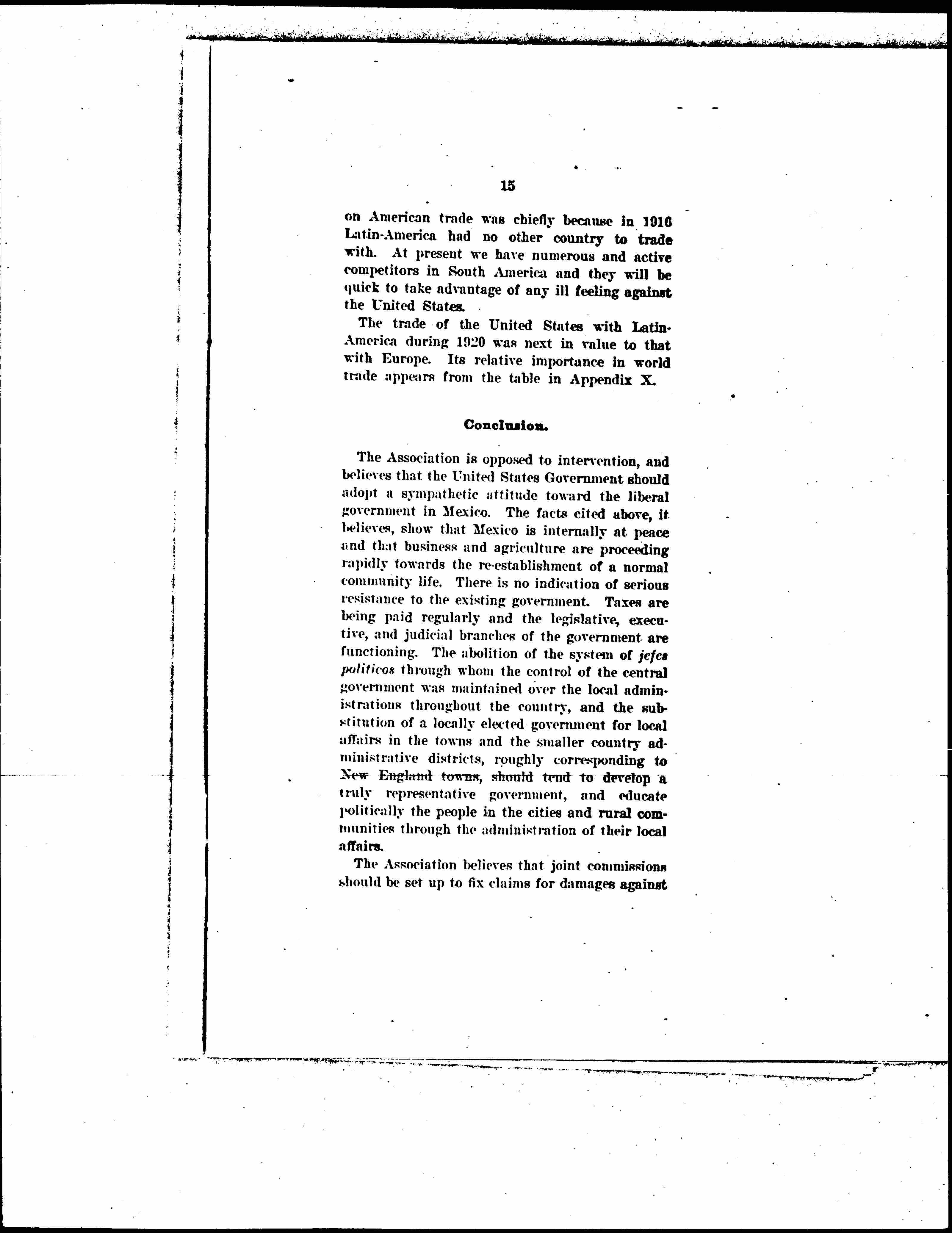 The Association is opposed to intervention, and believes that the United States Government should adopt a sympathetic attitude toward the liberal government in Mexico. The facts cited above, it believes, show that Mexico is internally at peace and that business and agriculture are proceeding rapidly towards the [reestablishment] of a normal community life. There is no indication of serious resistance to the existing government. Taxes are being paid regularly and the legislative, executive, and judicial branches of the government are functioning. The abolition of the system of jefes politicos through whom the control of the central government was maintained over the local administrations throughout the country, and the substitution of a locally elected government for local affairs in the towns and the smaller country administrative districts, roughly corresponding to New England towns, should tend to develop a truly representative government, and educate politically the people in the cities and rural communities through the administration of their local affairs.