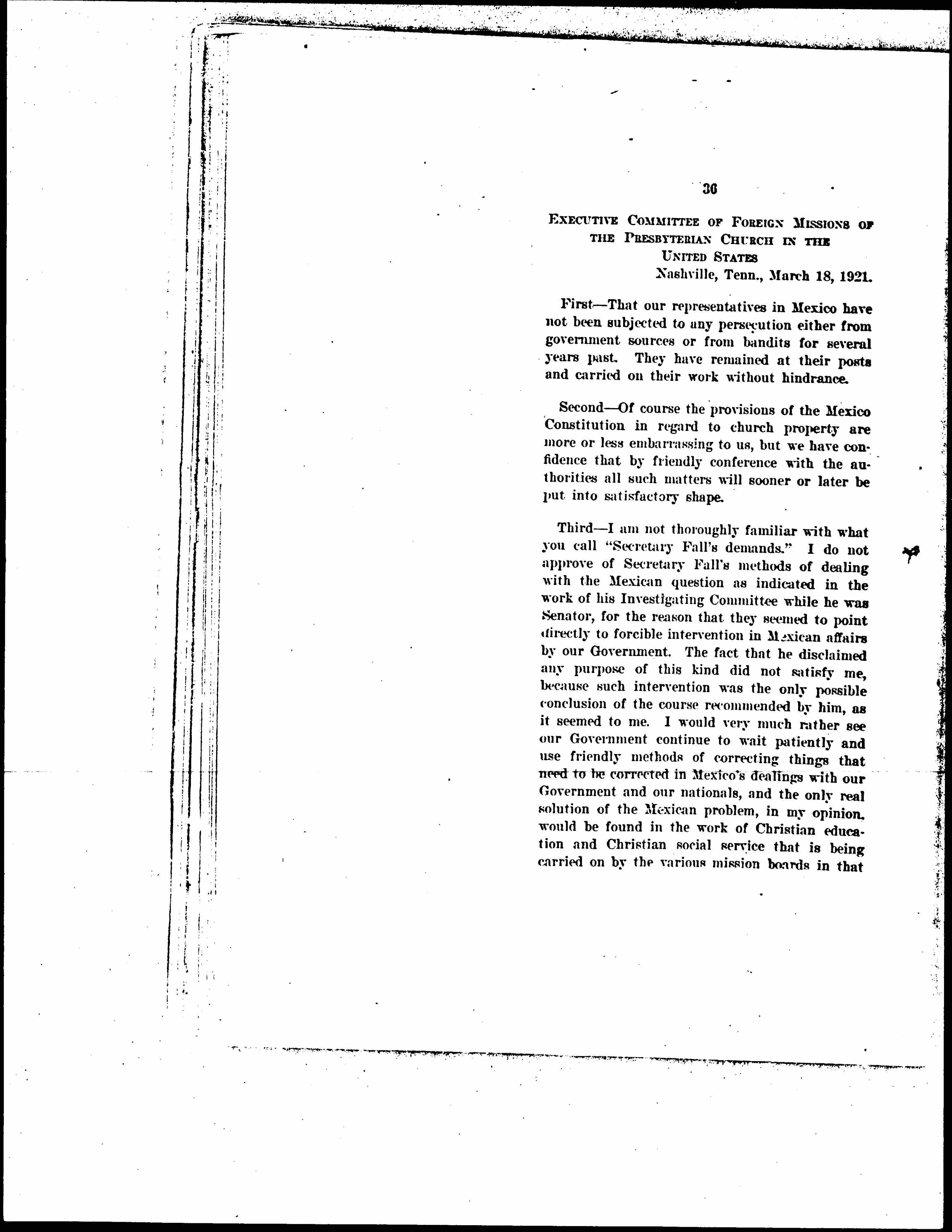 Third -- I am not thoroughly familiar with what you call "Secretary Fall's demands." I do not approve of Secretary Fall's methods of dealing with the Mexican question as indicated in the work of his Investigating Committee while he was Senator, for the reason that they seemed to point directly to forcible intervention in Mexican affairs by our Government. The fact that he disclaimed any purpose of this kind did not satisfy me, because such intervention was the only possible conclusion of the course recommended by him, as it seemed to me. I would very much rather see our Government continue to wait patiently and use friendly methods of correcting things that need to be corrected in Mexico's dealings with our Government and our nationals, and the only real solution of the Mexican problem, in my opinion, would be found in the work of Christian education and Christian social service that is being carried on by the various mission boards in that [page 38] country. At the mission stations where this work has been conducted for as long a period as twenty or twenty-five years you will find no "Mexican problem" left to deal with. On the contrary you will find an intelligent middle-class of people who can read and write and who are living in respectable and sanitary homes and who are not amenable to the appeals of either political or military demagogues. I would like to see great patience exercised towards Mexico while this kind of work is being done, whether by churches or other philanthropic agencies. It would be cheaper financially for the Government to buy out every American investor, giving him full value for his holdings, than it would to wage war on Mexico for the purpose of protecting these holdings in that way. I would state finally that in my own judgment it is the purpose of President Obregón to pursue a conciliatory policy towards this country rather than the stubborn anti-American policy that was pursued by his predecessor.