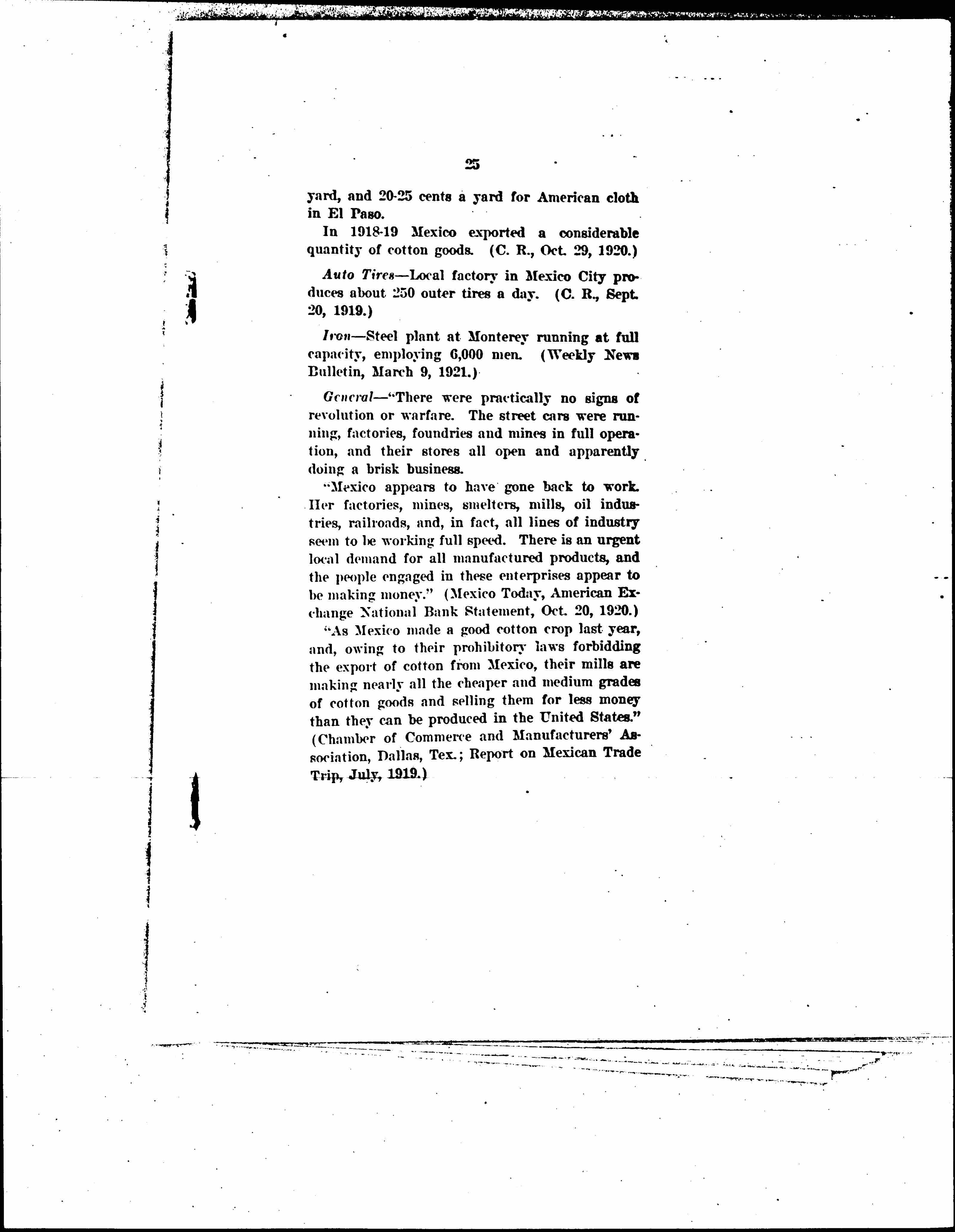 7. Mexico is now on a gold basis and exchange with the United States is about on a parity with the pre-war figure, so that there is no unfavorable exchange rate against American merchants, and there is not the danger of being obliged to take paper currency of fluctuating value in payment, a statement which can be made of very few important customers of the United States at the present time.