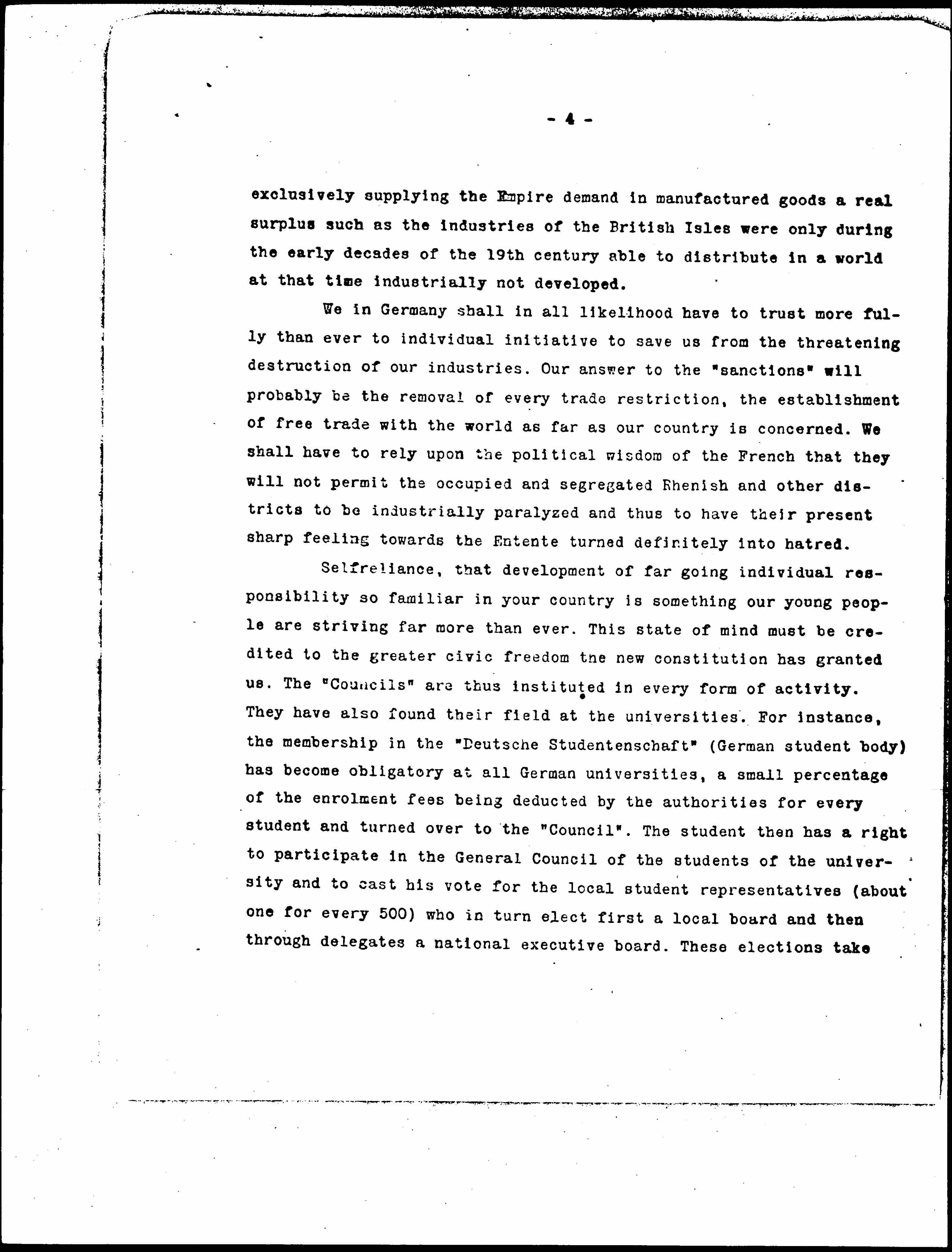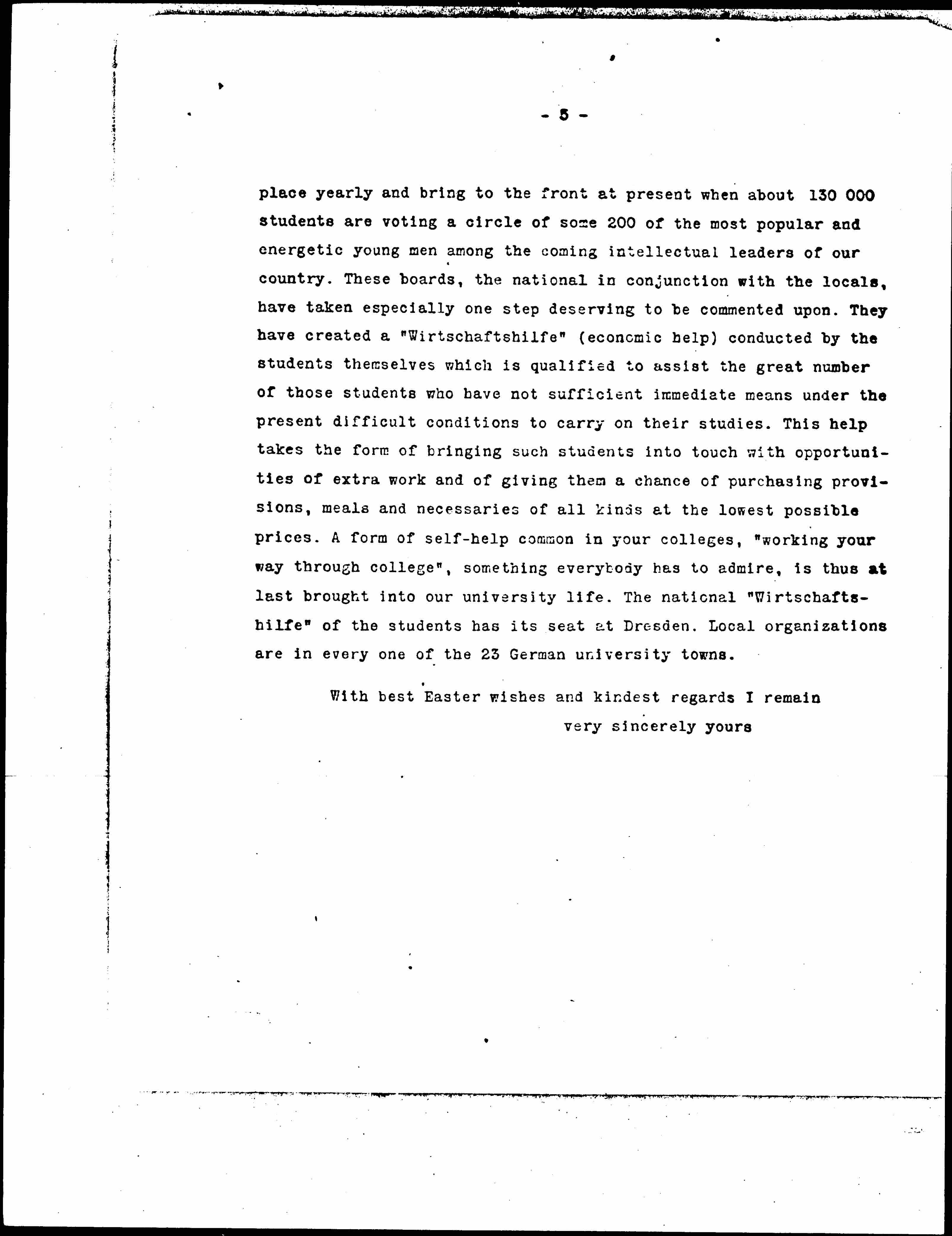 [Self-reliance] , that development of far going individual responsibility so familiar in your country is something our young people are striving far more than ever. This state of mind must be credited to the greater civic freedom the new constitution has granted us. The "Councils" are thus instituted in ever form of activity. They have also found their field at the universities. For instance, the membership in the "Deutsch Studentenschaft" (German student body) has become obligatory at all German universities, a small percentage of the [enrollment] fees being deducted by the authorities for every student and turned over to the "Council". The student then has a right to participate in the General Council of the students of the university and to cast his vote for the local student representatives (about one for every 500) who in turn elect first a local board and then through delegates a national executive board. These elections take [page 5] place yearly and bring to the front at present when about 130,000 students are voting a circle of some 200 of the most popular and energetic young men among the coming intellectual leaders of our country. These boards, the national in conjunction with the locals, have taken especially one step deserving to be commented upon. They have created a "Wirtschaftshilfe" (economic help) conducted by the students themselves which is qualified to assist the great number of those students who have not sufficient immediate means under the present difficult conditions to carry on their studies. This help takes the form of bringing such students into touch with opportunities of extra work and of giving them a chance of purchasing provisions, meals and necessaries of all kinds at the lowest possible prices. A form of self-help common in your colleges, "working your way through college", something everybody has to admire, is thus at last brought into our university life. The national "Wirtschaftshilfe" of the students has its seat at Dresden. Local organizations are in every one of the 23 German university towns.