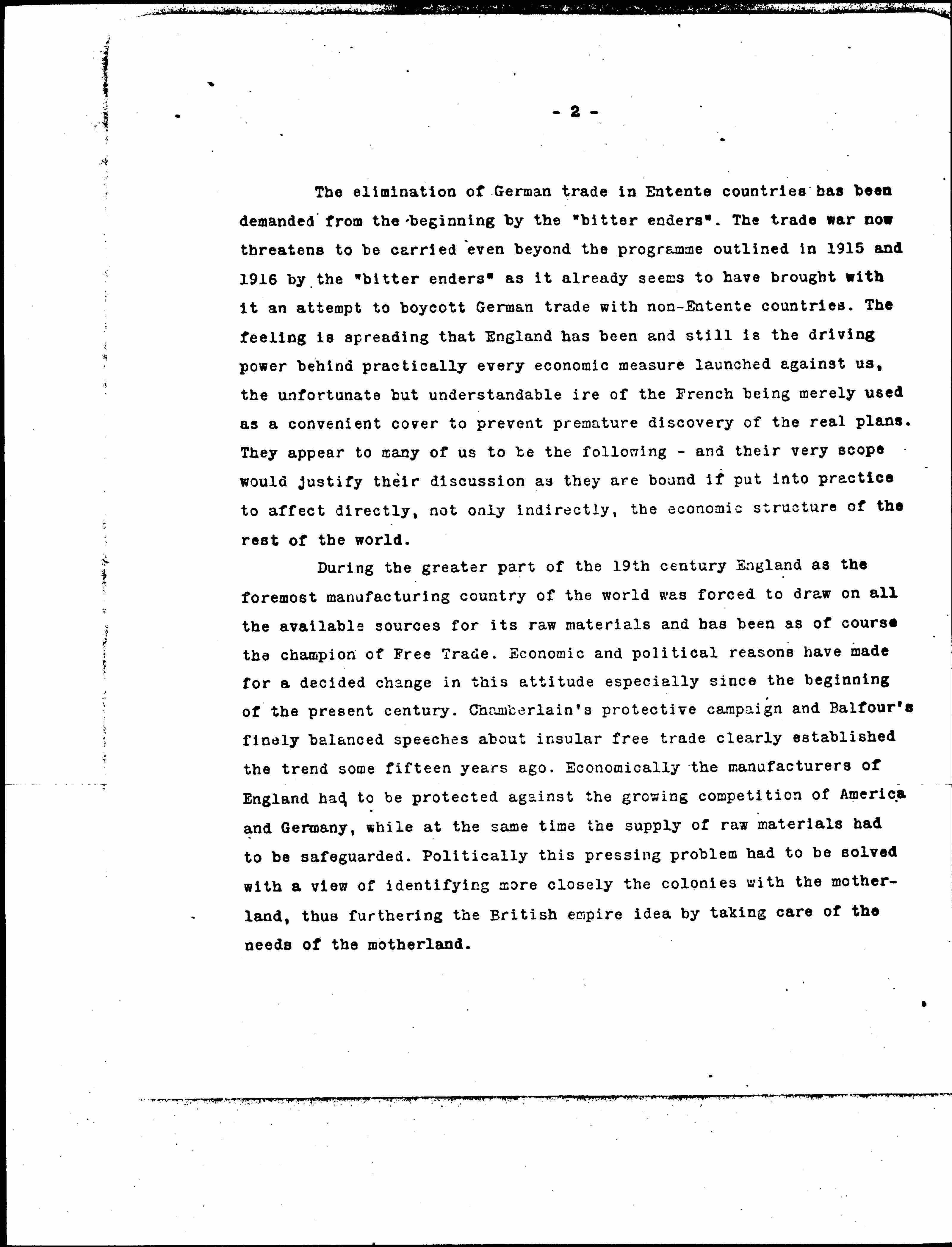 The elimination of German trade in Entente countries has been demanded from the beginning by the "bitter enders". The trade war now threatens to be carried even beyond the [program] outlined in 1915 and 1916 by the "bitter enders" as it already seems to have brought with it an attempt to boycott German trade with non-Entente countries. The feeling is spreading that England has been and still is the driving power behind practically every economic measure launched against us, the unfortunate but understandable ire of the French being merely used as a convenient cover to prevent premature discovery of the real plans. They appear to many of us to be the following -- and their very scope would justify their discussion as they are bound if put into practice to affect directly, not only indirectly, the economic structure of the rest of the world.