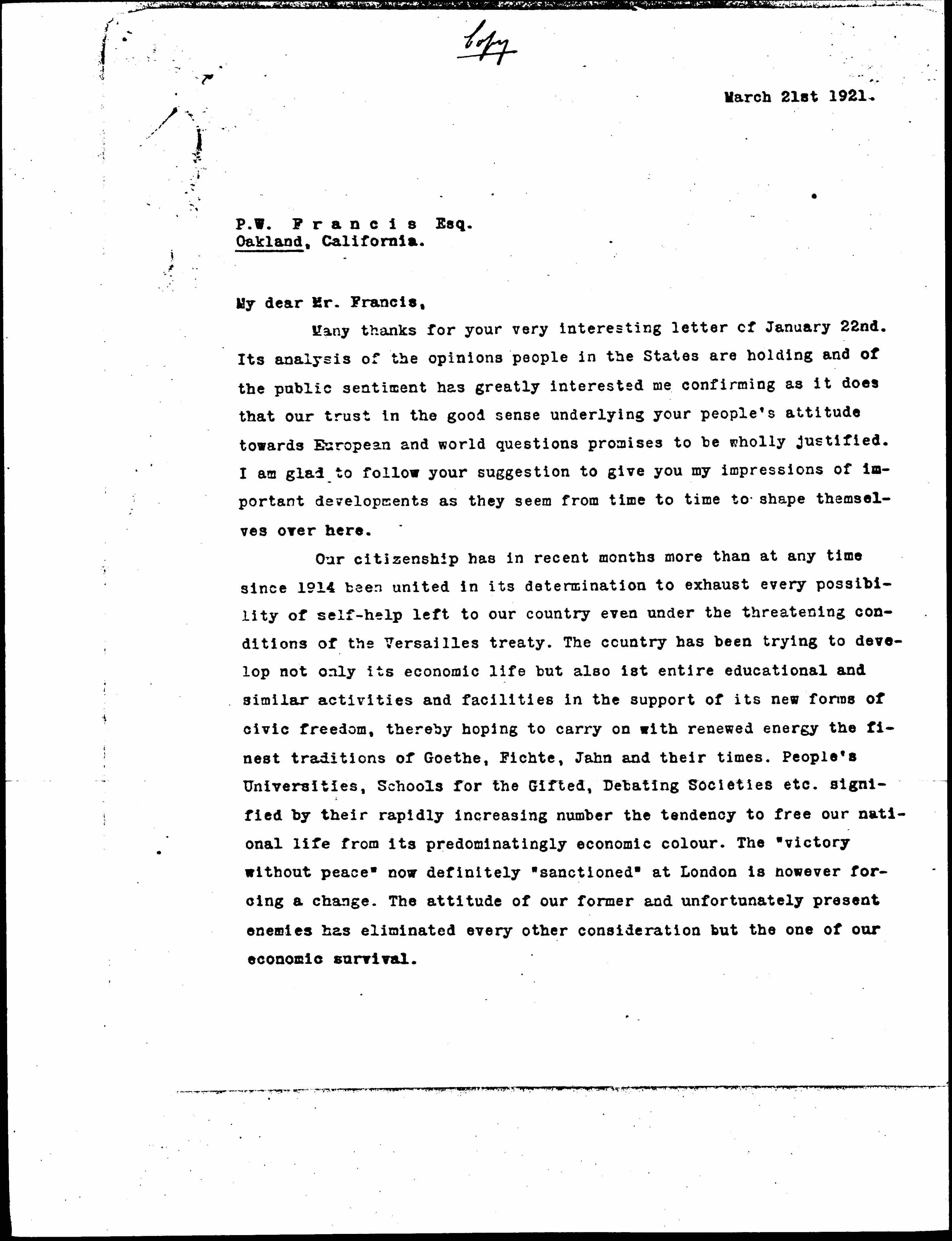 Our citizenship has in recent months more than at any time since 1914 been united in its determination to exhaust every possibility of self-help left to our country even under the threatening conditions of the Versailles treaty. The country has been trying to develop not only its economic life but also its entire educational and similar activities and facilities in the support of its new forms of civic freedom, thereby hoping to carry on with renewed energy the finest traditions of Goethe, Fichte, Jahn and their times. People's Universities, Schools for the Gifted, Debating Societies etc. signified by their rapidly increasing number the tendency to free our national life from its predominatingly economic [color]. The "victory without peace" now definitely "sanctioned" at London is now ever forcing a change. The attitude of our former and unfortunately present enemies has eliminated every other consideration but the one of our economic survival. [page 2]