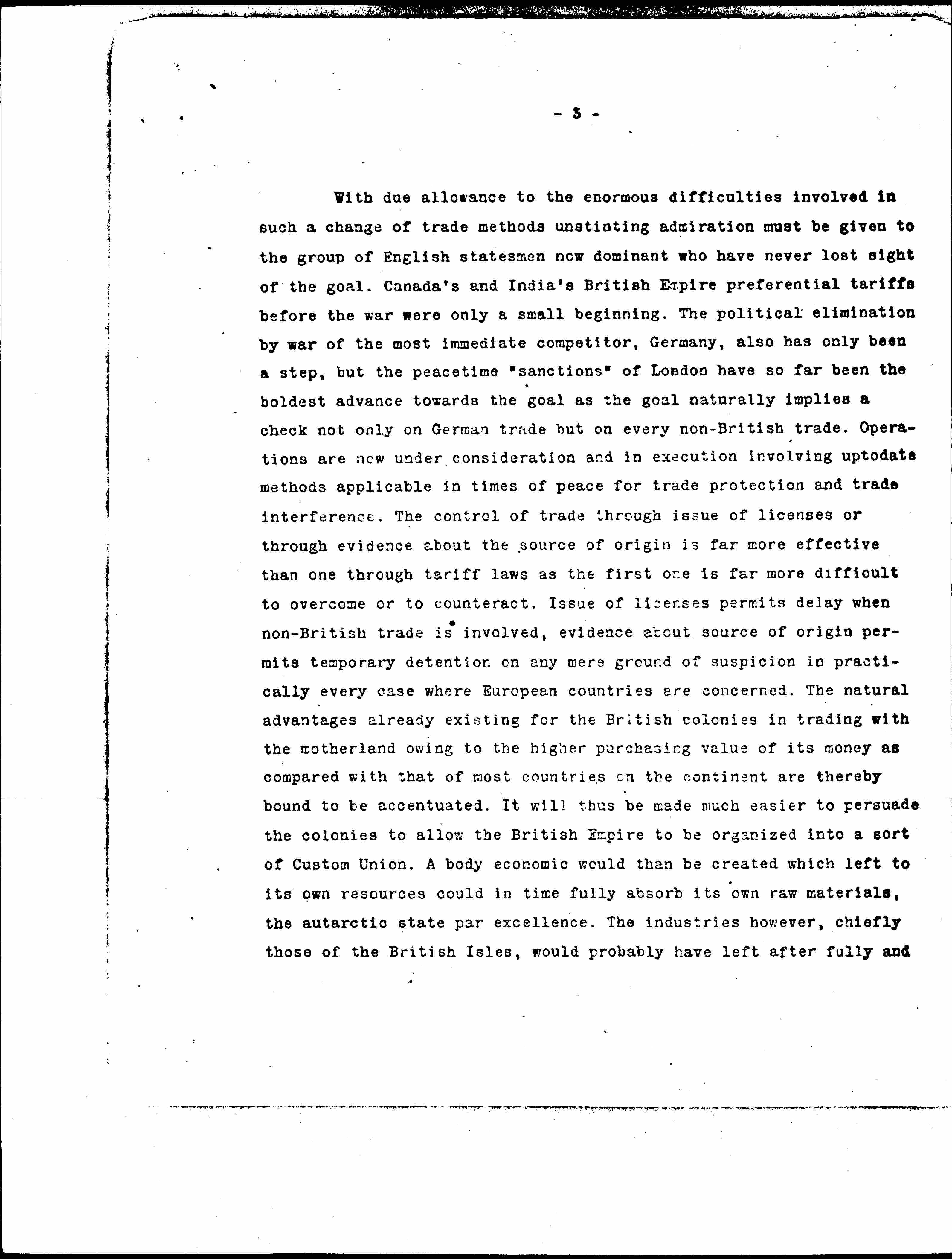 With due allowances to the enormous difficulties involved in such a change of trade methods unstinting admiration must be given to the group of English statesmen now dominant who have never lost sight of the goal. Canada's and India's British Empire preferential tariffs before the war were only a small beginning. The political elimination by war of the most immediate competitor, Germany, also has only been a step, but the peacetime "sanctions" of London have so far been the boldest advance towards the goal as the goal naturally implies a check not only on German trade but on every non-British trade. Operations are now under consideration and in execution involving [up-to-date] methods applicable in times of peace for trade protection and trade interference. The control of trade through issue of licenses or through evidence about the source of origin is far more effective than one through tariff laws as the first one is far more difficult to overcome or to counteract. Issue of licenses permits delay when non-British trade is involved, evidence about source of origin permits temporary detention on any mere ground of suspicion in practically every case where European countries are concerned. The natural advantages already existing for the British colonies in trading with the motherland owing to the higher purchasing value of its money as compared with that of most countries on the continent are thereby bound to be accentuated. It will thus be made much easier to persuade the colonies to allow the British Empire to be organized into a sort of Custom Union. A body economic would then be created which left to its own resources could in time fully absorb its own raw materials, the [autarkic] state par excellence. The industries, however, chiefly those of the British Isles, would probably have left after fully and [page 4] exclusively supplying the Empire demand in manufactured goods a real surplus such as the industries of the British Isles were only during the early decades of the 19th century able to distribute in a world at that time industrially not developed.