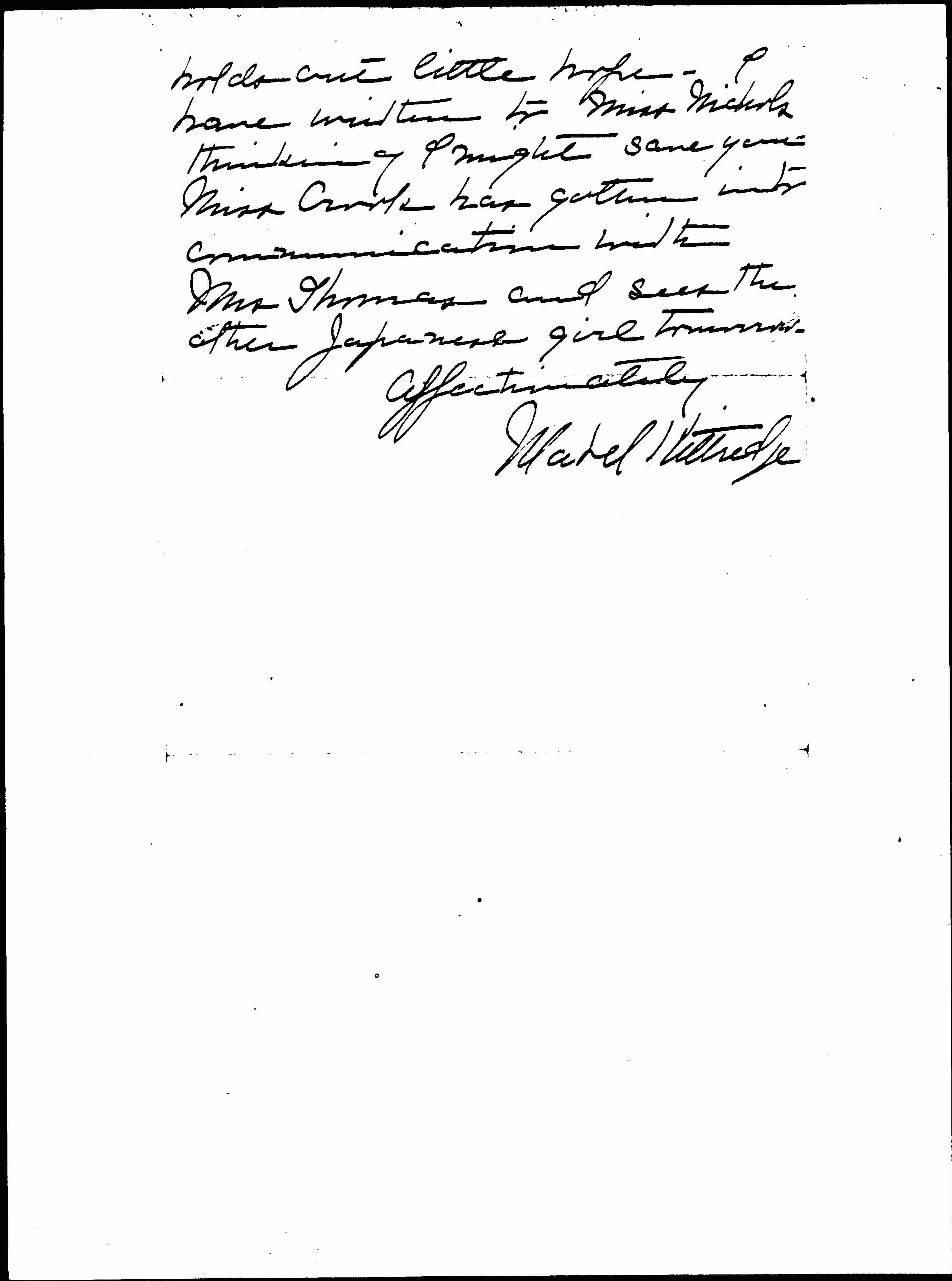 I can get the Japanese girl from Wellesley on the Imperator June 30th. At least four of the delegates are going at that time so she will be well looked after. But it is quite necessary to know about her return. Do you want her to come back directly after the Congress? The Steamship passage is $150. -- What shall I do about paying? I have an appointment tomorrow with the East and West Bureau but Mrs Cothren [page 2] holds out little hope. I have written to Miss Nichols thinking I might save you. Miss Crook has gotten into communication with Mrs Thomas and sees the other Japanese girl tomorrow.