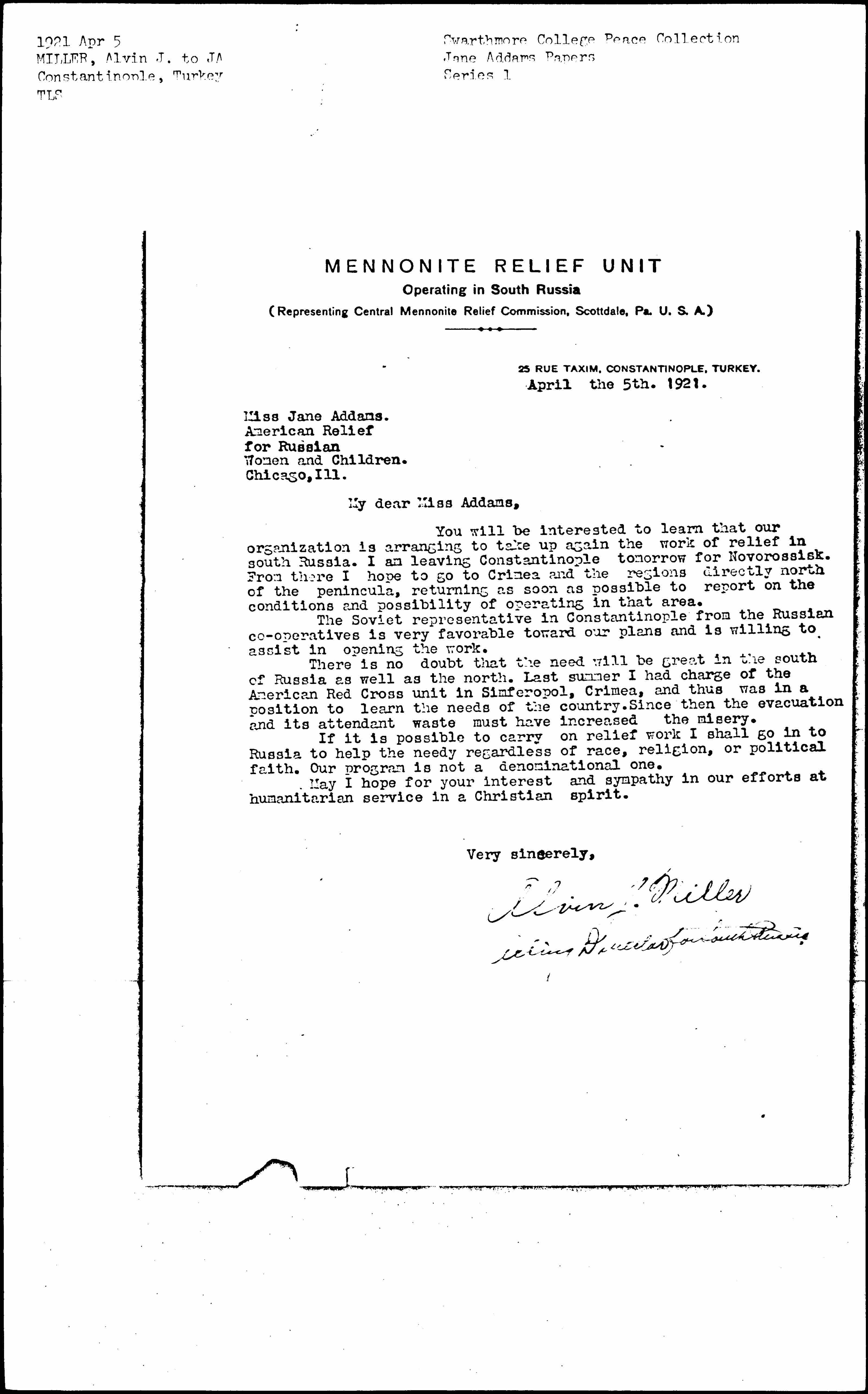 You will be interested to learn that our organization is arranging to take up again the work of relief in south Russia. I am leaving Constantinople tomorrow for [Novorossiysk]. From there I hope to go to Crimea and the regions directly north of the peninsula, returning as soon as possible to report on the conditions and possibility of operating in that area.