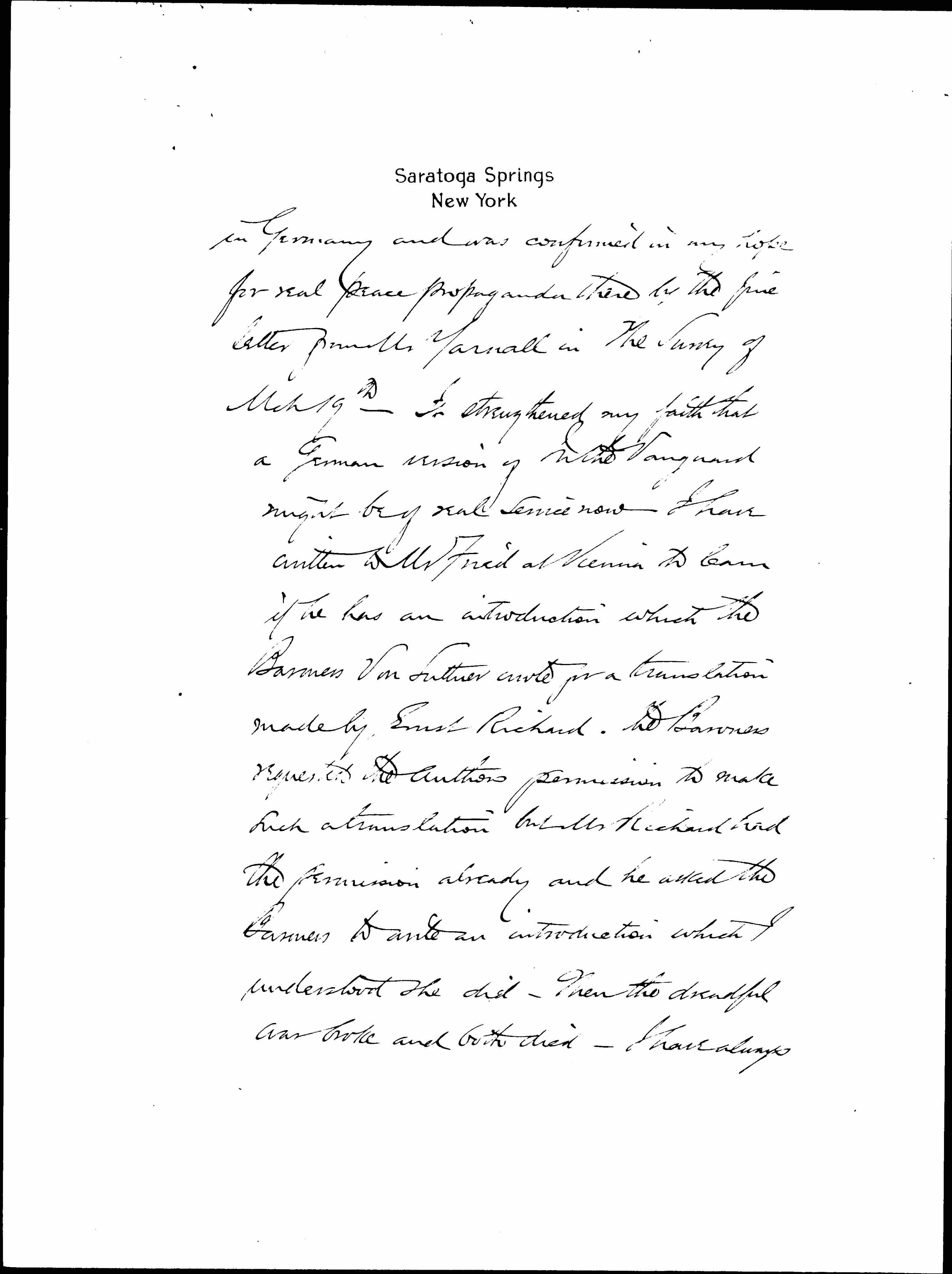 I have been much impressed by the reports from the noble work which the Friends have been doing [page 3] in Germany and was confirmed in my hope for real peace propaganda there by the fine letter from Mr Yarnall in The Survey of March 19th -- It strengthened my faith that a German version of In the Vanguard might be of real service now. I have written to Mr Fried at Vienna to learn if he has an introduction which the Baroness Von Suttner wrote for a translation made by Ernst Richard. The Baroness requested the author permission to make such a translation but Mr Richard had the permission already and he asked the Baroness to write an introduction which I understood she did -- then the dreadful war broke and both died -- I have always [page 4] felt that their hearts were both broken by the war.