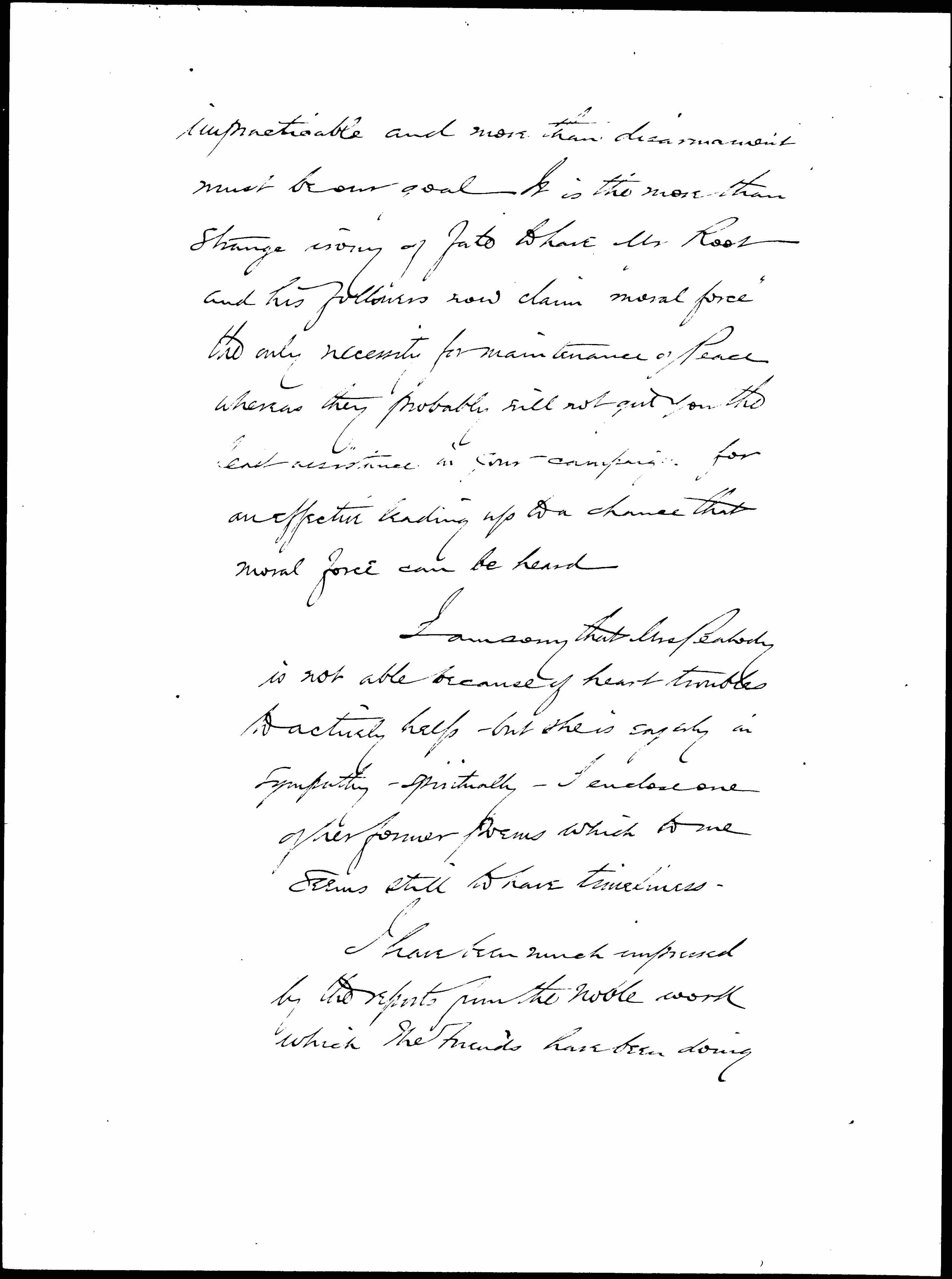 I assume you did not see my letter to The World three months ago and enclose it because I have still faith that the suggestion I make is not [page 2] impracticable and more than disarmament must be our goal. It is the more than strange irony of fate to have Mr Root and his followers now claim "moral force" the only necessity for maintenance of Peace whereas they probably will not get you the least assistance in your campaign for an effective leading up to a chance that moral force can be heard.