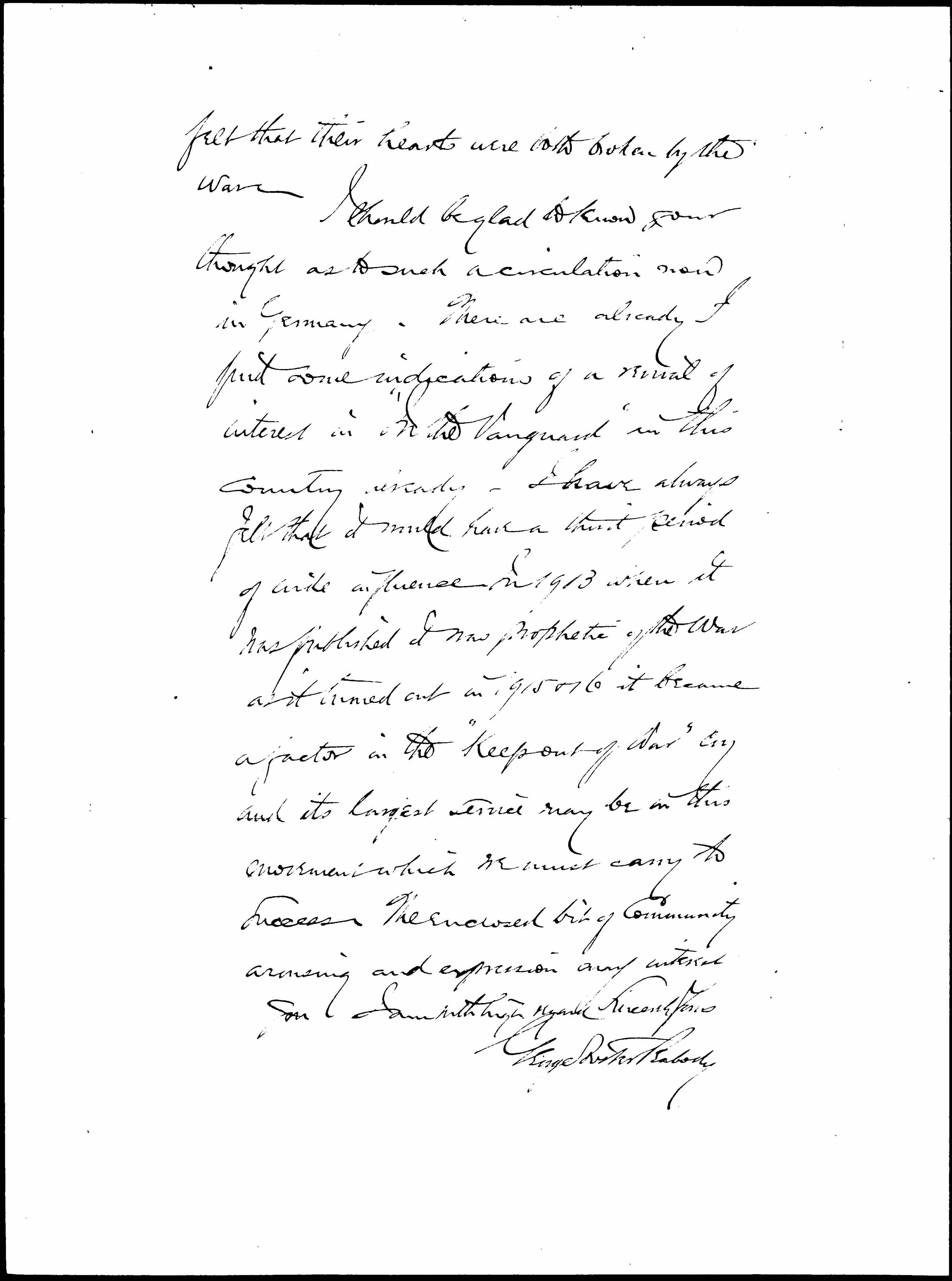 I should be glad to know your thought as to such a circulation now in Germany. There are already I find some indications of a revival of interest in "In the Vanguard" in this country already. I have always felt that it would have a third period of wide influence. In 1913 when it was published it was prophetic of the war as it turned out in 1915 & 16 it became a factor in the "Keep out of War" cry and its largest service may be in this movement which we must carry to success. The enclosed bit of Community arousing and expression may interest you. I am with high regard Sincerely Yours