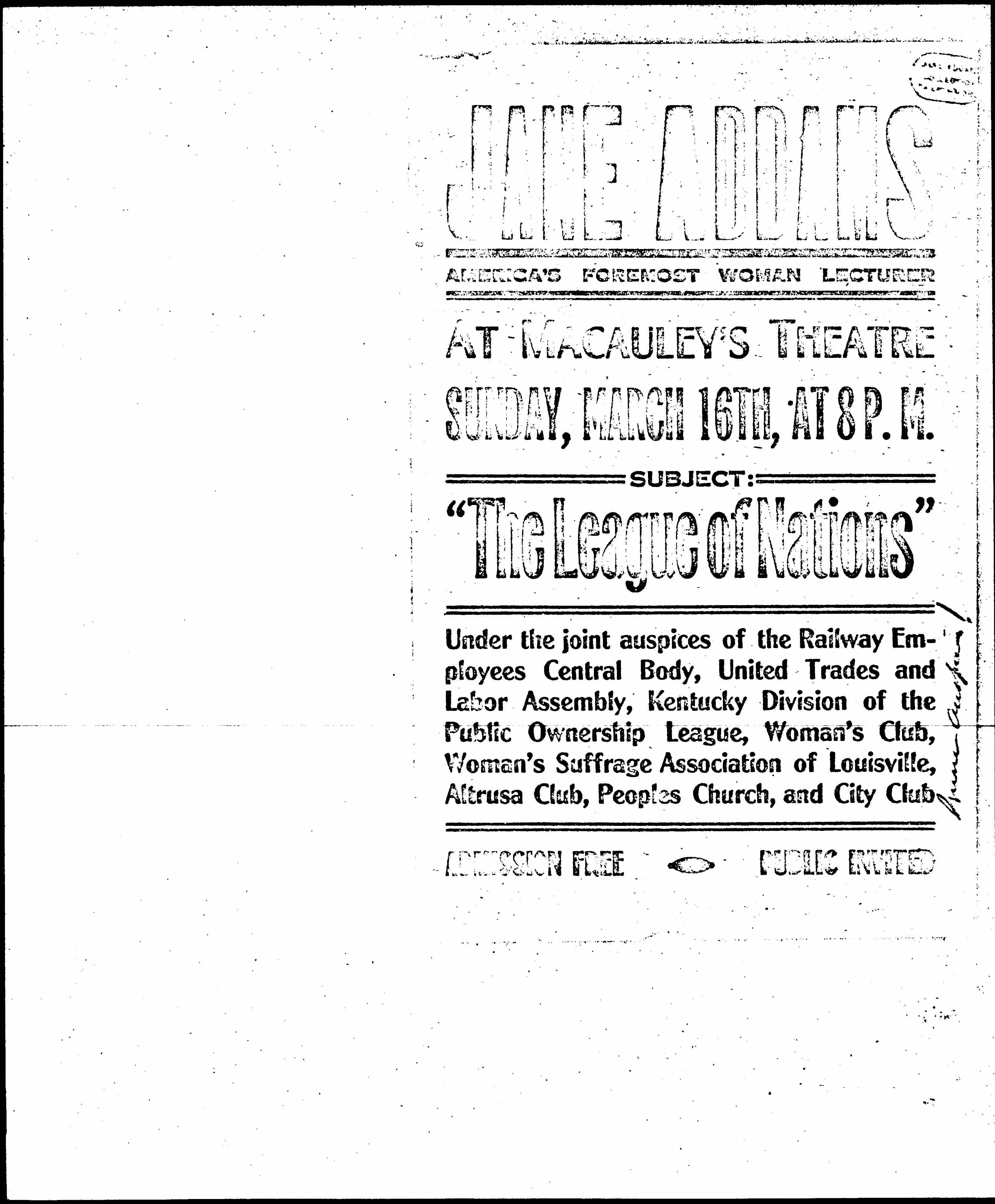 Under the joint auspices of the Railway Employees Central Body, United Trades and Labor Assembly, Kentucky Division of the Public Ownership League, Woman's Club, Woman's Suffrage Association of Louisville, Altrusa Club, Peoples Church, and City Club