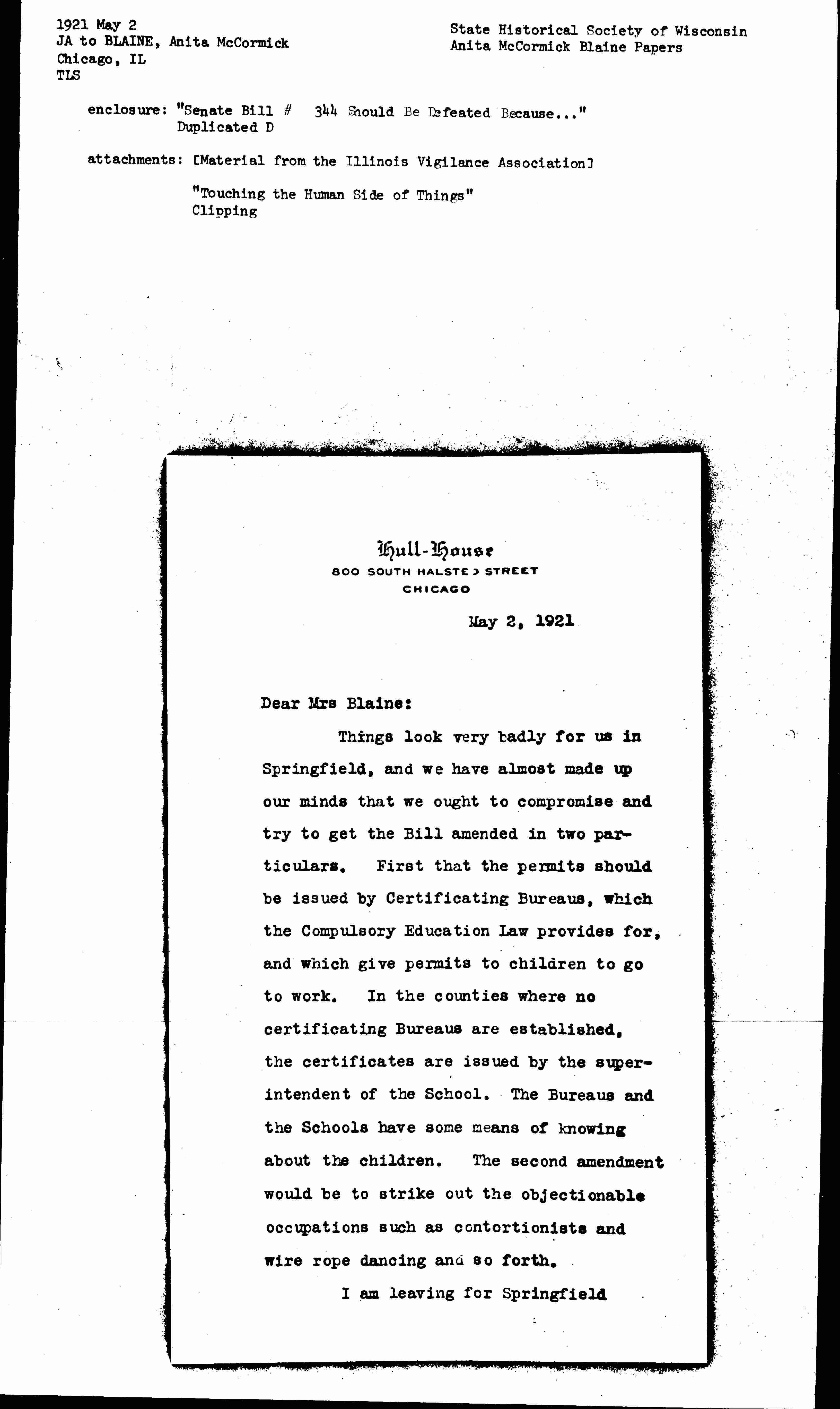 Things look very badly for us in Springfield, and we have almost made up our minds that we ought to compromise and try to get the Bill amended in two particulars. First that the permits should be issued by Certificating Bureaus, which the Compulsory Education Law provides for, and which give permits to children to go to work. In the counties where no certificating Bureaus are established, the certificates are issued by the superintendent of the School. The Bureaus and the Schools have some means of knowing about the children. The second amendment would be to strike out the objectionable occupations such as contortionists and wire rope dancing and so forth.