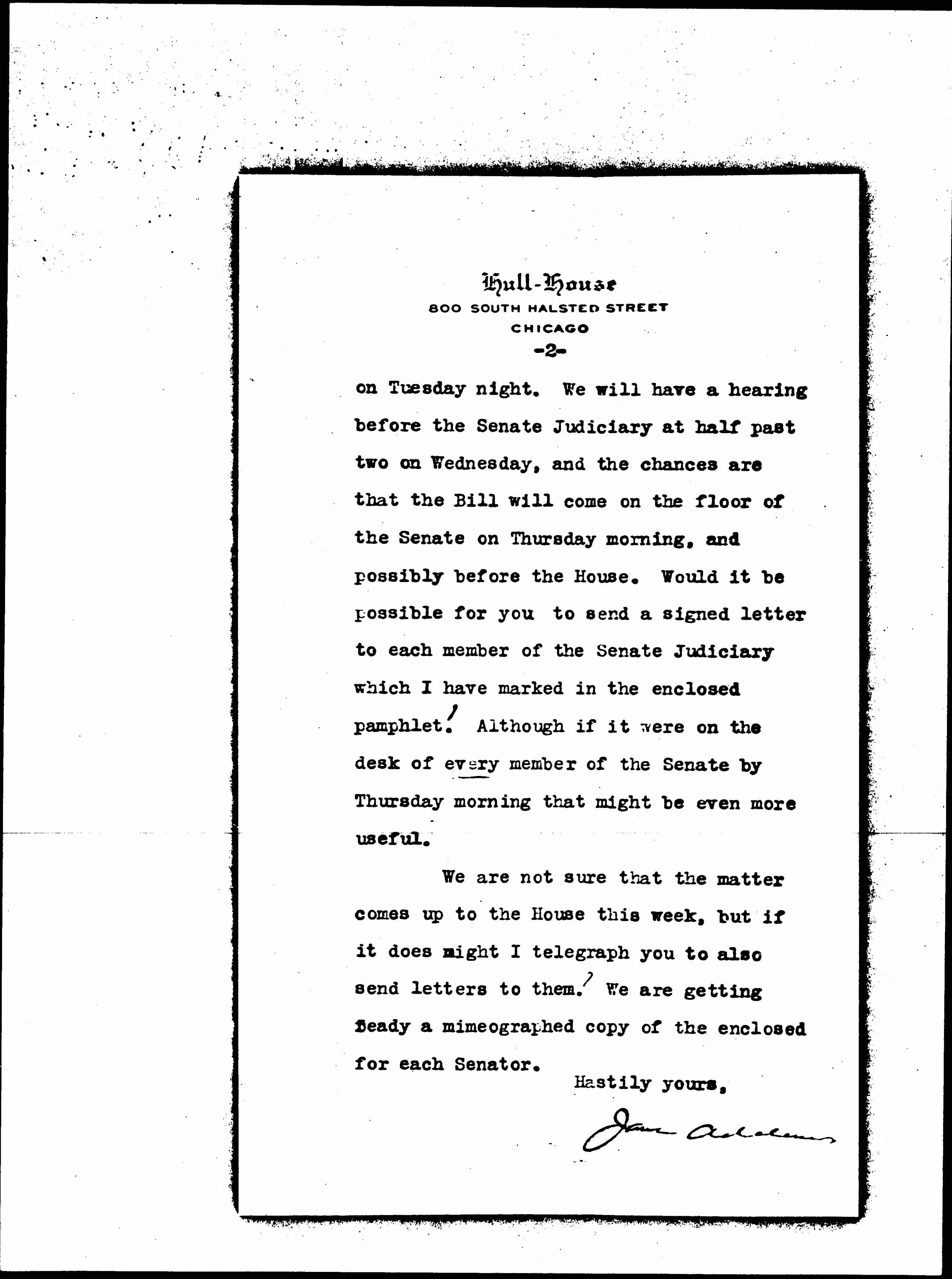 I am leaving for Springfield [page 2] on Tuesday night. We will have a hearing before the Senate Judiciary at half past two on Wednesday, and the chances are that the Bill will come on the floor of the Senate on Thursday morning, and possibly before the House. Would it be possible for you to send a signed letter to each member of the senate Judiciary which I have marked in the enclosed pamphlet? Although if it were on the desk of every member of the Senate by Thursday morning that might be even more useful.