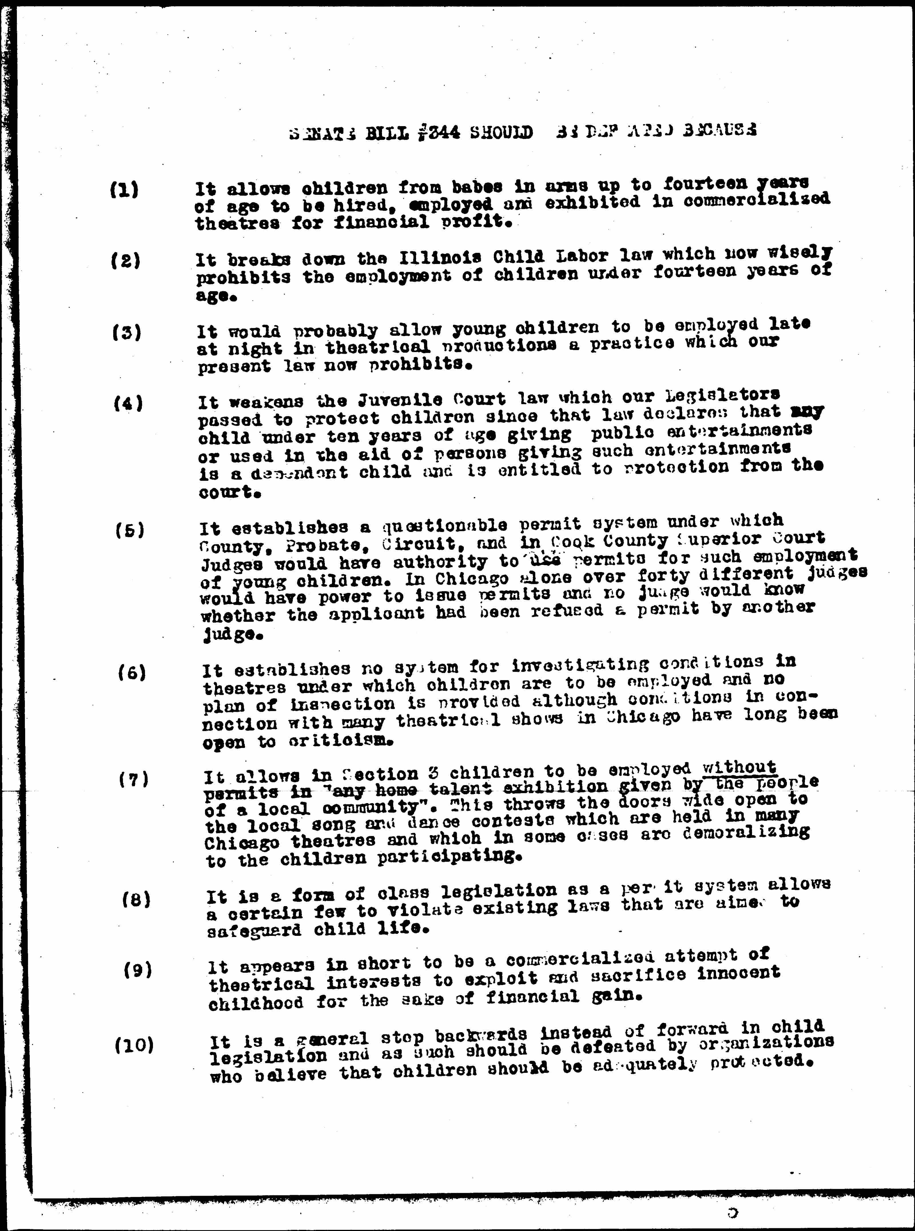(10) It is a general step backwards instead of forward in child legislation and as such should be defeated by organizations who believe that children should be adequately protected.