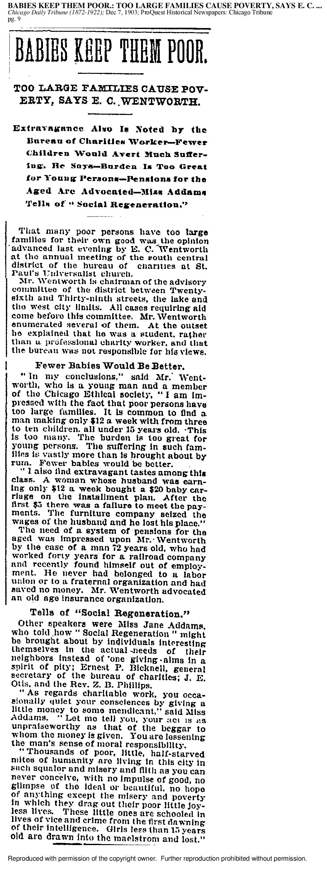 "As regards charitable work, you occasionally quiet your consciences by giving a little money to some mendicant," said Miss Addams. "Let me tell you, your act is as unpraiseworthy as that of the beggar to whom the money is given. You are lessening the man's sense of moral responsibility.