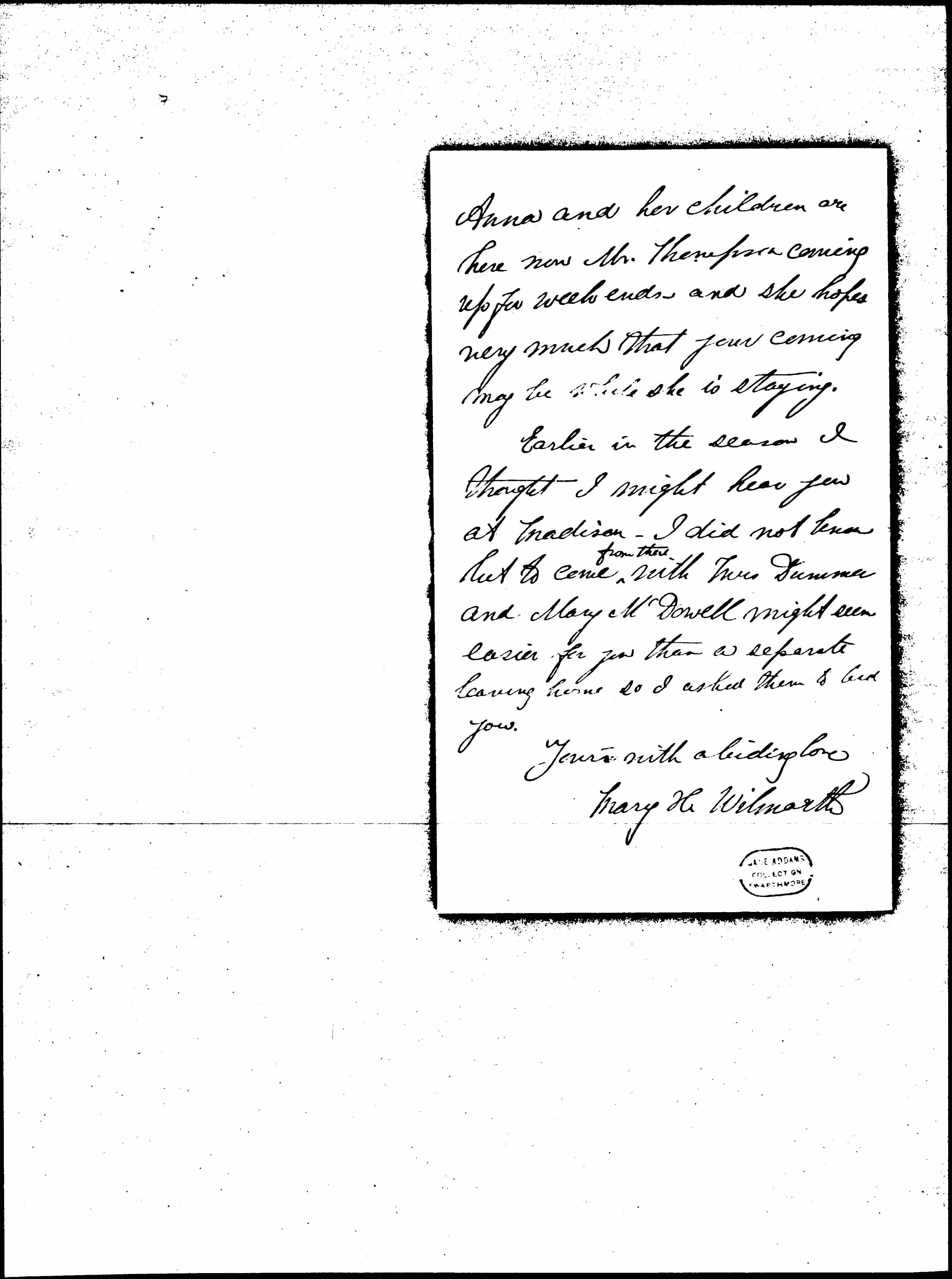 If you will come to us here if will be a blessing for us. If there comes a time when the quiet, the space, the verdure call you, above the noise of the streets and the clamor of those who like wayside beggars call to you -- do know there will always be the room -- not a servant in the house but would be enkindled if I should say: "Miss Addams is coming." [page 4] Anna and her children are here now Mr Thompson coming up for [weekends], and she hopes very much that your coming may be while she is staying.