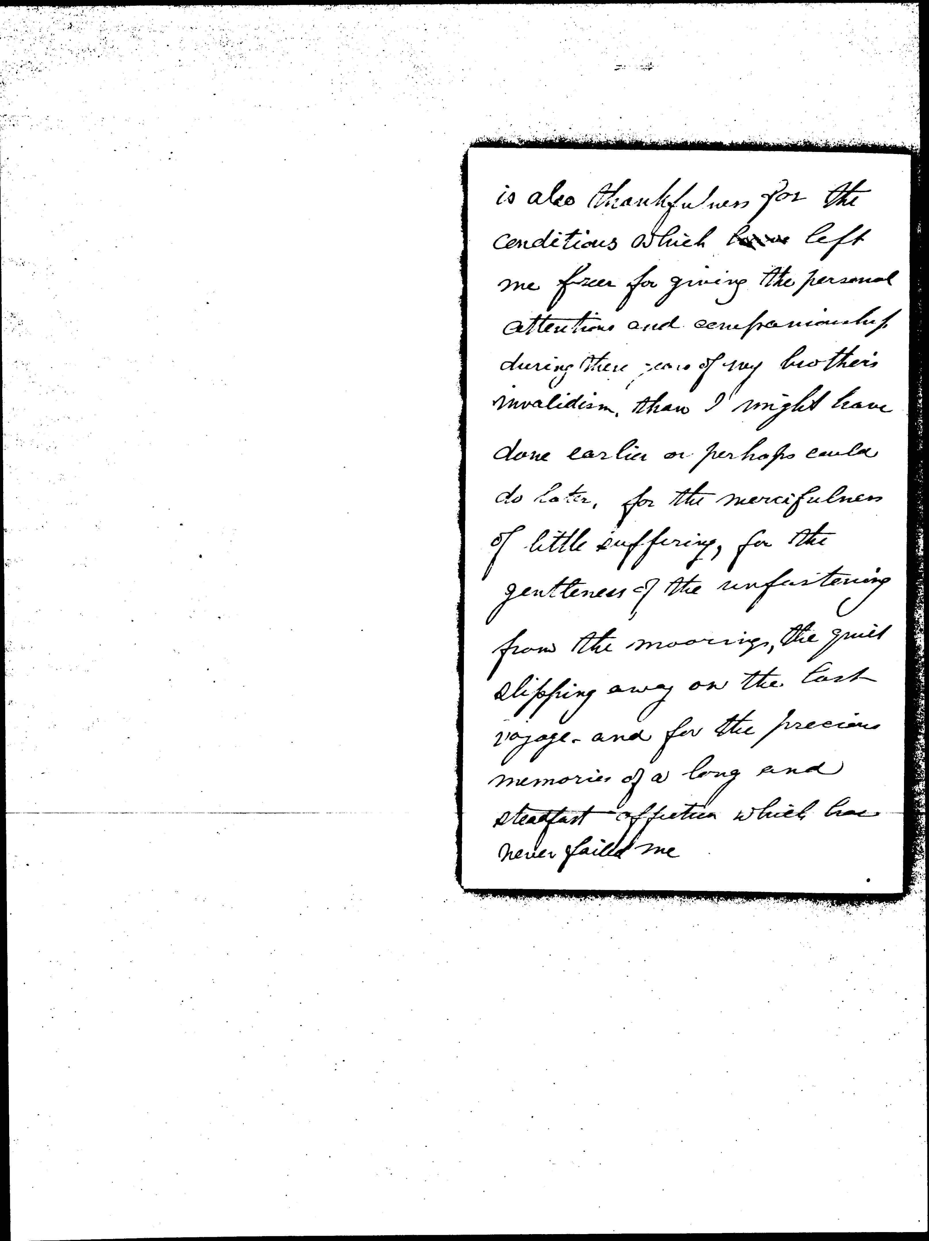 The inevitable sadness which lies in my heart is not without recognition of the kindliness of Death. When no other remedy can avail, there [page 2] is also thankfulness for the conditions which have left me freer for giving the personal attention and companionship during these years of my brother's invalidation, than I might have done earlier or perhaps could do later, for the mercifulness of little suffering, for the gentleness of the unfastening from the mornings, the quiet slipping away on the last voyage, and for the precious memories of a long and steadfast affection which has never failed me. [page 3]