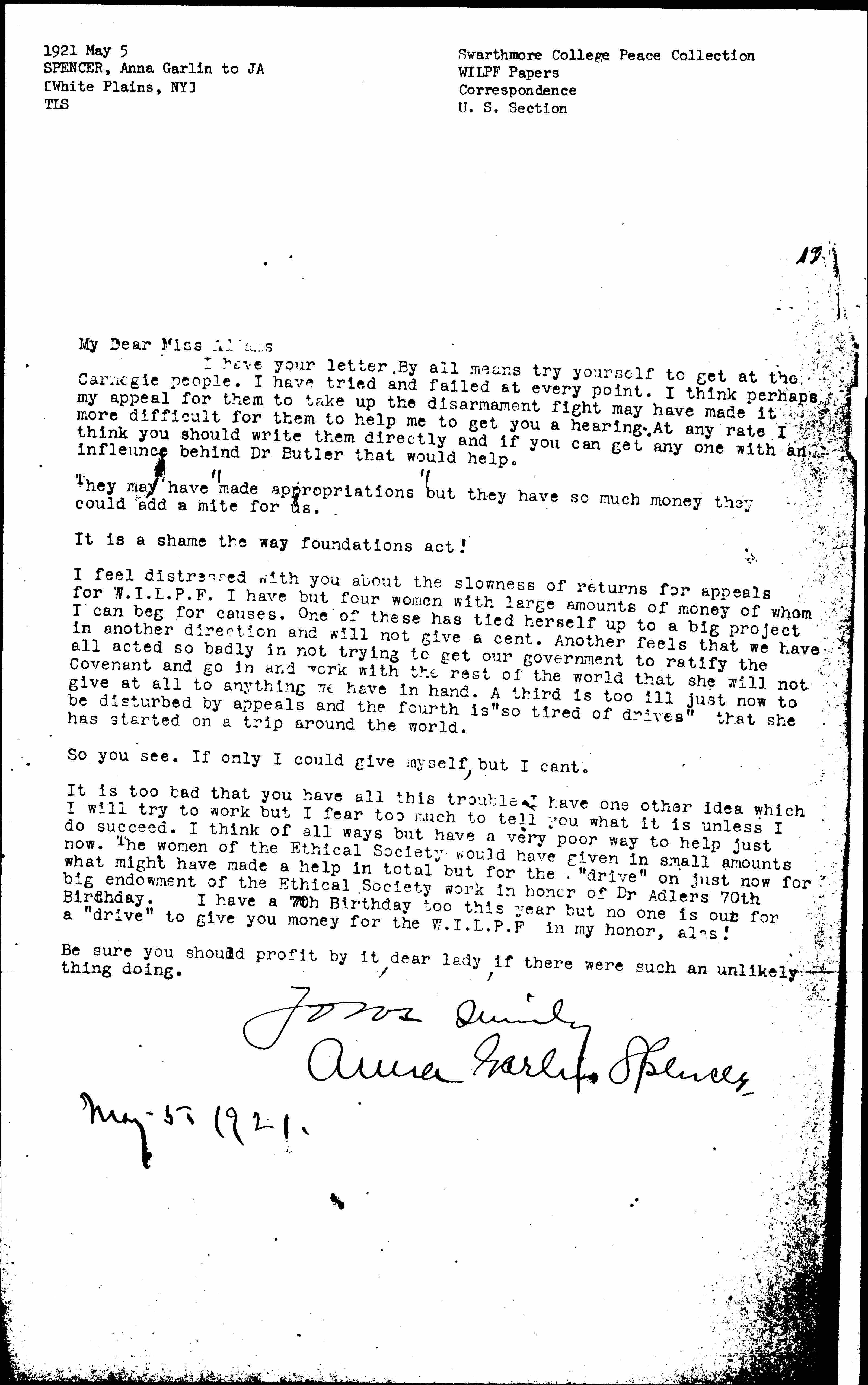 I feel distressed with you about the slowness of returns for appeals for W.I.L.P.F. I have but four women with large amounts of money of whom I can beg for causes. One of these has tied herself up to a big project in another direction and will not give a cent. Another feels that we have all acted so badly in not trying to get our government to ratify the Covenant and go in and work with the rest of the world that she will not give at all to anything we have in hand. A third is too ill just now to be disturbed by appeals and the fourth is "so tired of drives" that she has started on a trip around the world.