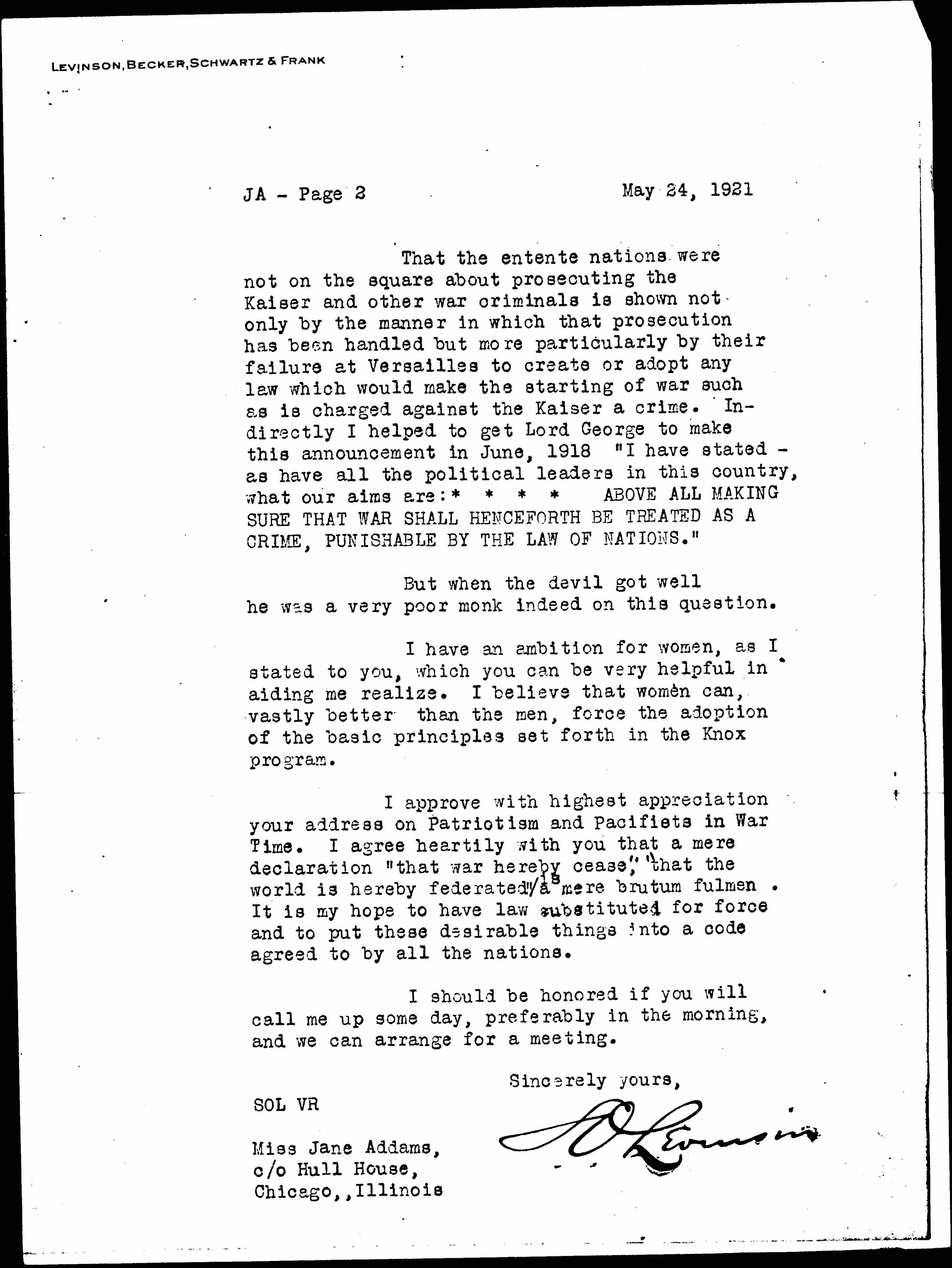 It has been my attempt to follow the evolution of civilization along the lines of law and away from the state of nature representing force and power. It has seemed to me -- That war being legal and being the only known method of enforcing the settlement of international disputes it has been open to ambitious men, kings and what-not, to avail themselves of this legal instrument for purposes of aggrandizement, the fulfillment of ambition and the satisfaction of the love of power, which as Ruskin says, is the greatest motive in the world. I want to de-throne war. I want to reduce it to the basis of [dueling], piracy and murder in the eyes of the law. I want to prevent the next Napoleon or the next Kaiser from being able to deceive his people to the end of war. I have been one of those who, while always against the Kaiser and his myrmidons, have not blamed the Kaiser so much as the war system itself. [page 2]