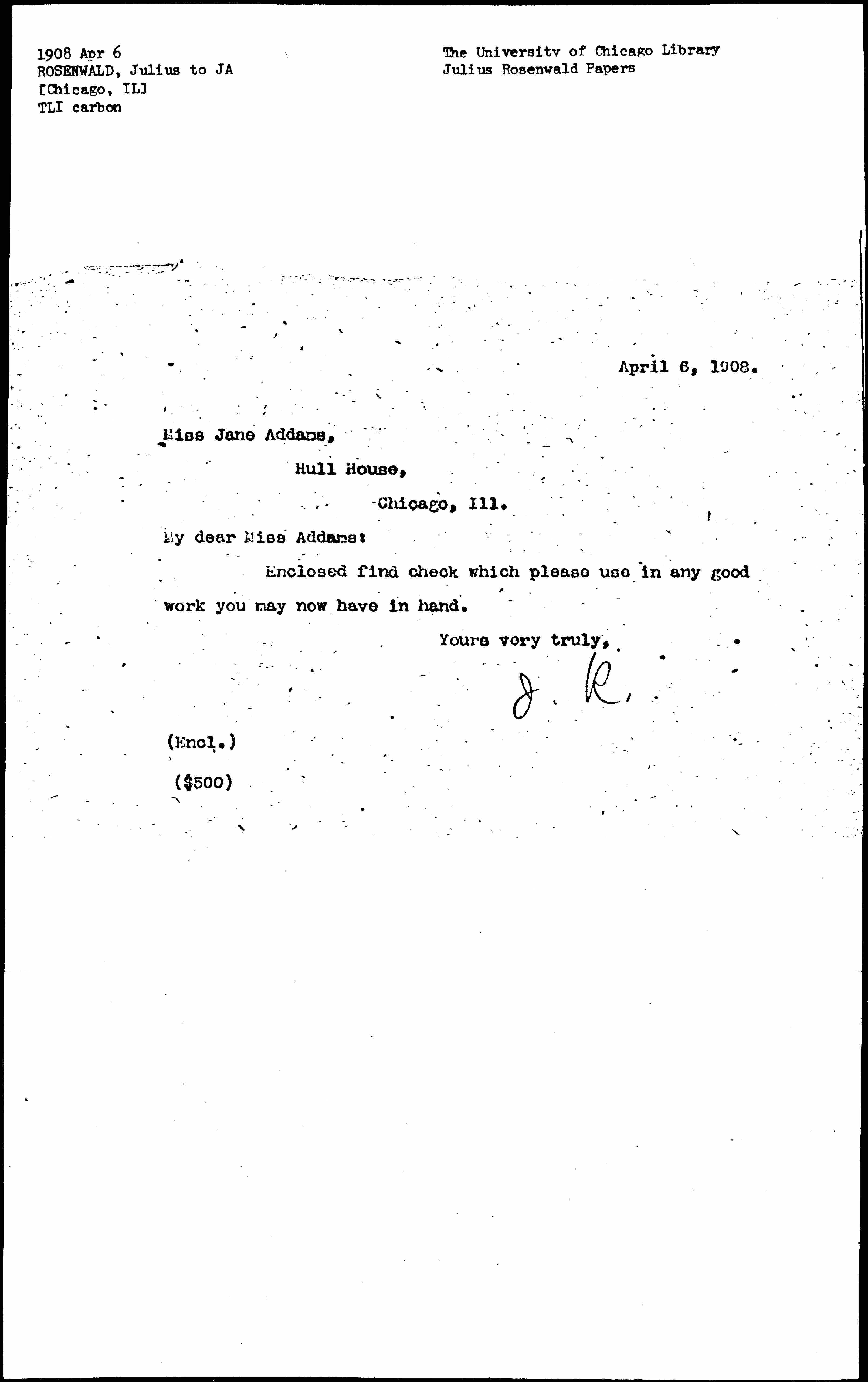 Julius Rosenwald to Jane Addams, April 6, 1908