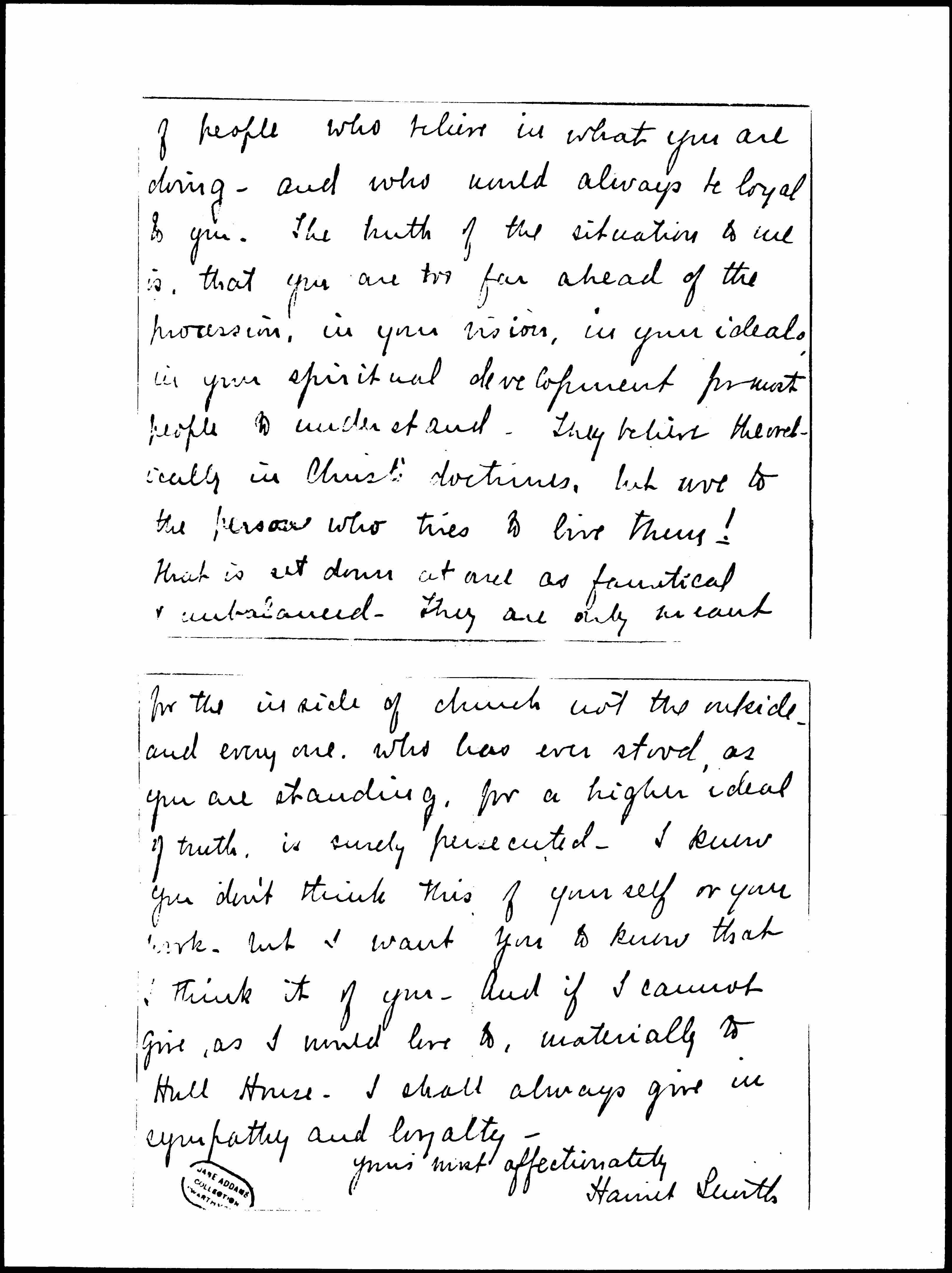 I am going to send Mr McCormick's letter over to you by Miss Bowen on Wednesday. I really hate to let it go even for a short time, as I carry it around with me as a kind of armor, so that I may bring it out if the reason should arise. You [page 2] will be interested to know that Mrs McCormick asked me herself to read it to a number of women at a luncheon yesterday. And said she hoped I would circulate it as much as I could, and I certainly shall. I hope you know, when all this disagreeable newspaper talk and misunderstanding is going on, that there are hosts [page 3] of people who believe in what you are doing, and who would always be loyal to you. The truth of the situation to me is, that you are too far ahead of the procession, in your vision, in your ideals, in your spiritual development for most people to understand. They believe theoretically in Christ's doctrines, but woe to the person who tries to live them! That is set down at once as fanatical & unbalanced. They are only meant [page 4] for the inside of church not the outside, and every one who has ever stood, as you are standing, for a higher ideal of truth, is surely persecuted. I know you don't think this of yourself or your work, but I want you to know that I think it of you. And if I cannot give, as I would love to, materially to Hull House, I shall always give in sympathy and loyalty.