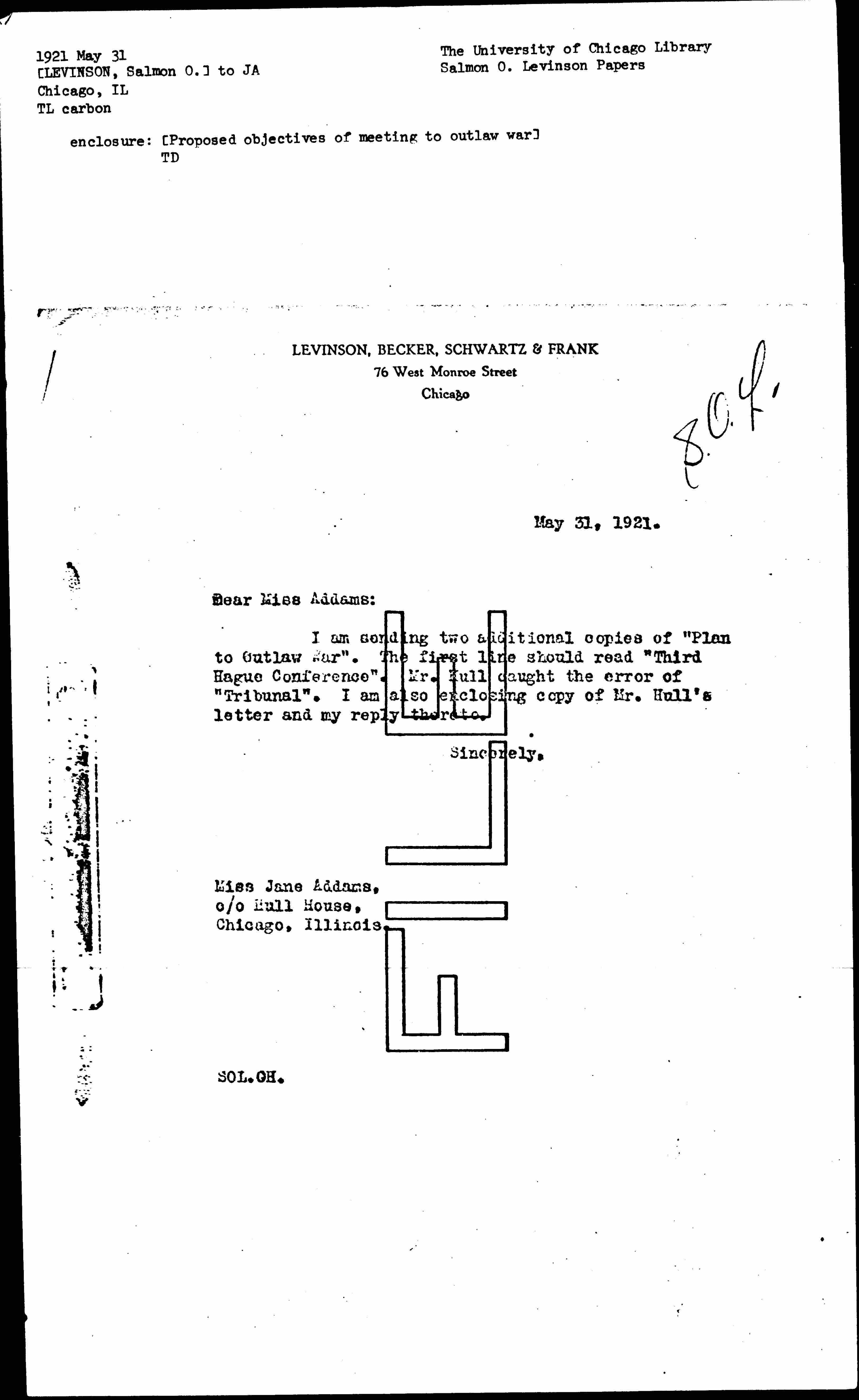 I am sending two additional copies of "Plan to Outlaw War". The first line should read "Third Hague Conference". Mr. Hull caught the error of "Tribunal". I am also enclosing copy of Mr. Hull's letter and my reply thereto.