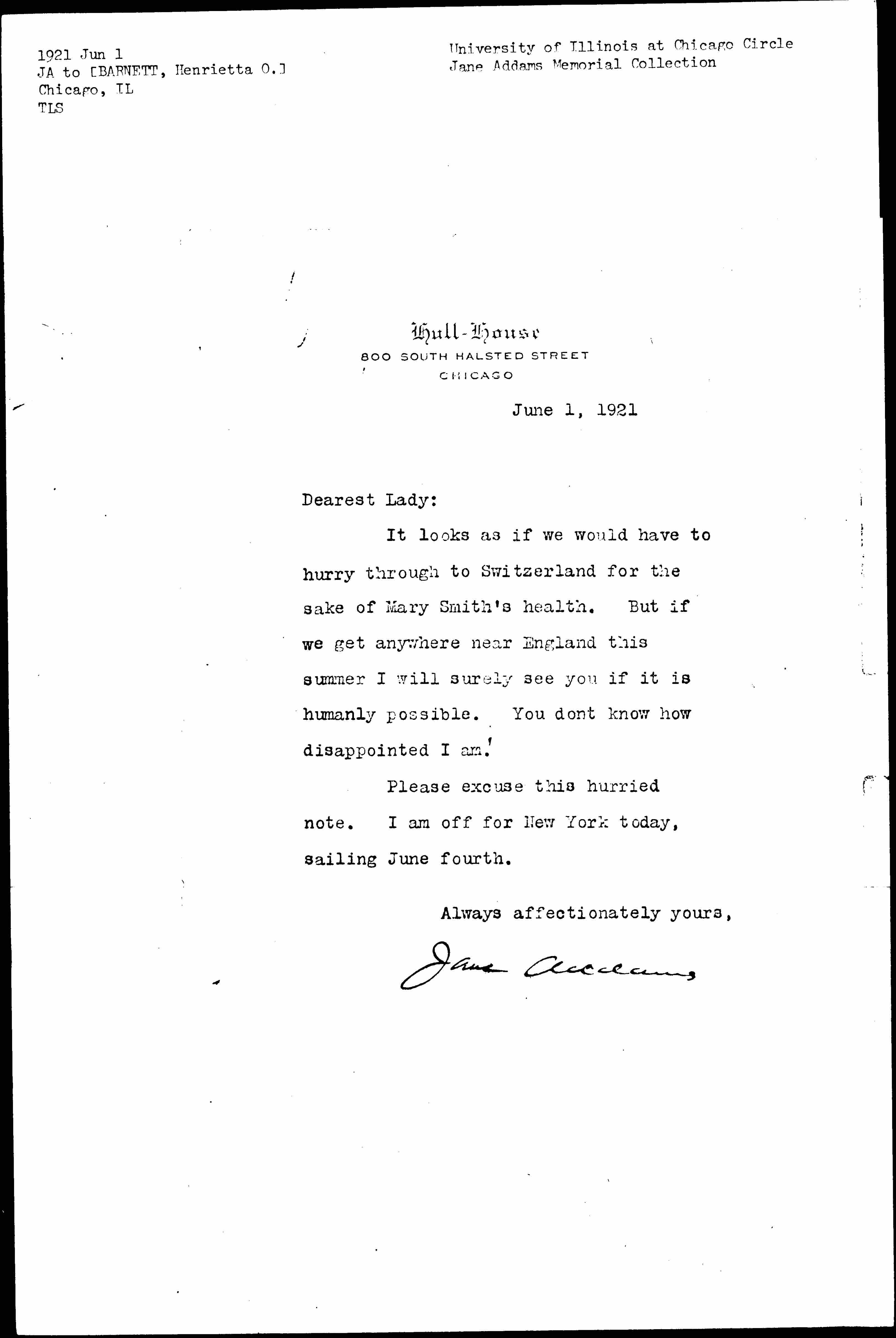 It looks as if we would have to hurry through to Switzerland for the sake of Mary Smith's health. But if we get anywhere near England this summer I will surely see you if it is humanly possible. You don't know how disappointed I am!