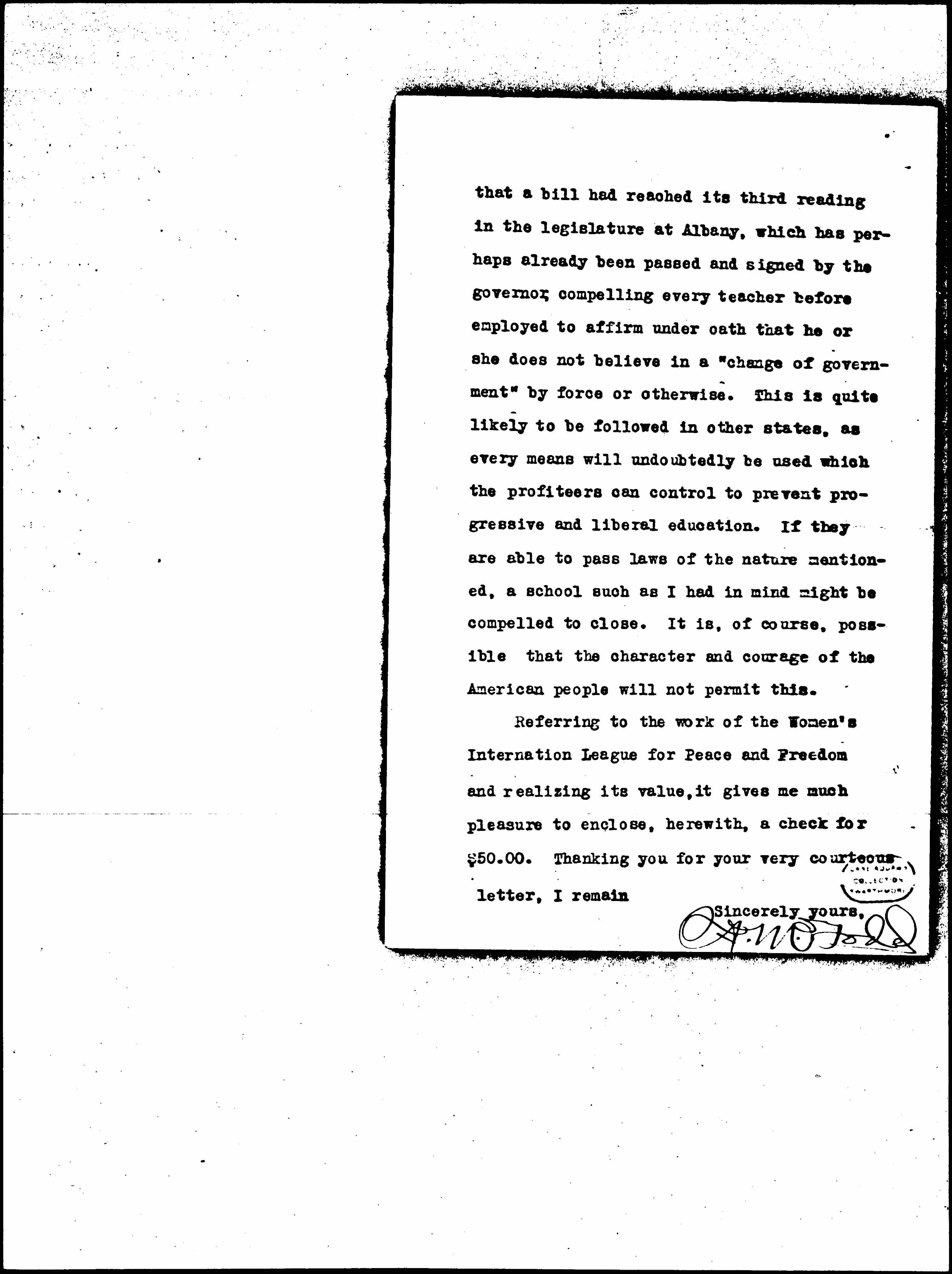 Referring to the work of the Women's [International] League for Peace and Freedom and realizing its value, it gives me much pleasure to enclose, herewith, a check for $50.00. Thanking you for your courteous letter, I remain