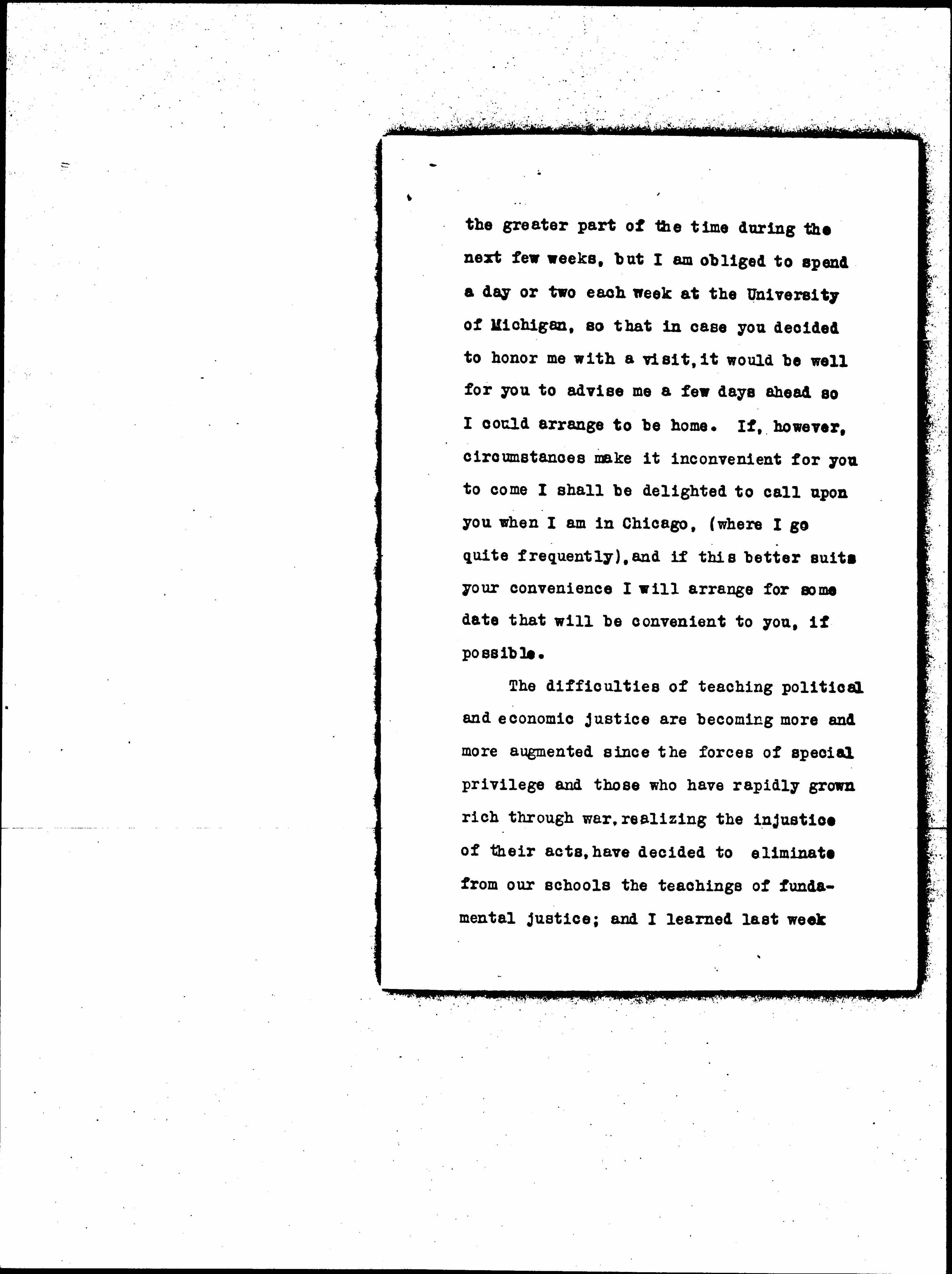 Regarding your very kind suggestion that you would like to come to Kalamazoo to talk over the subject with me, you certainly need not apologize as intimated in your letter, for I should feel highly honored by a visit from you. It is needless to say that I have for many years watched with great interest the valuable work for humanity which you have been doing, and I have had the privilege of visiting Hull-House, but unfortunately on occasions when you were not present. I expect to be home [page 3] the greater part of the time during the next few weeks, but I am obliged to spend a day or two each week at the University of Michigan, so that in case you decided to honor me with a visit, it would be well for you to advise me a few days ahead so I could arrange to be home. If, however, circumstances make it inconvenient for you to come I shall be delighted to call upon you when I am in Chicago, (where I go quite frequently), and if this better suits your convenience I will arrange for some date that will be convenient to you, if possible.