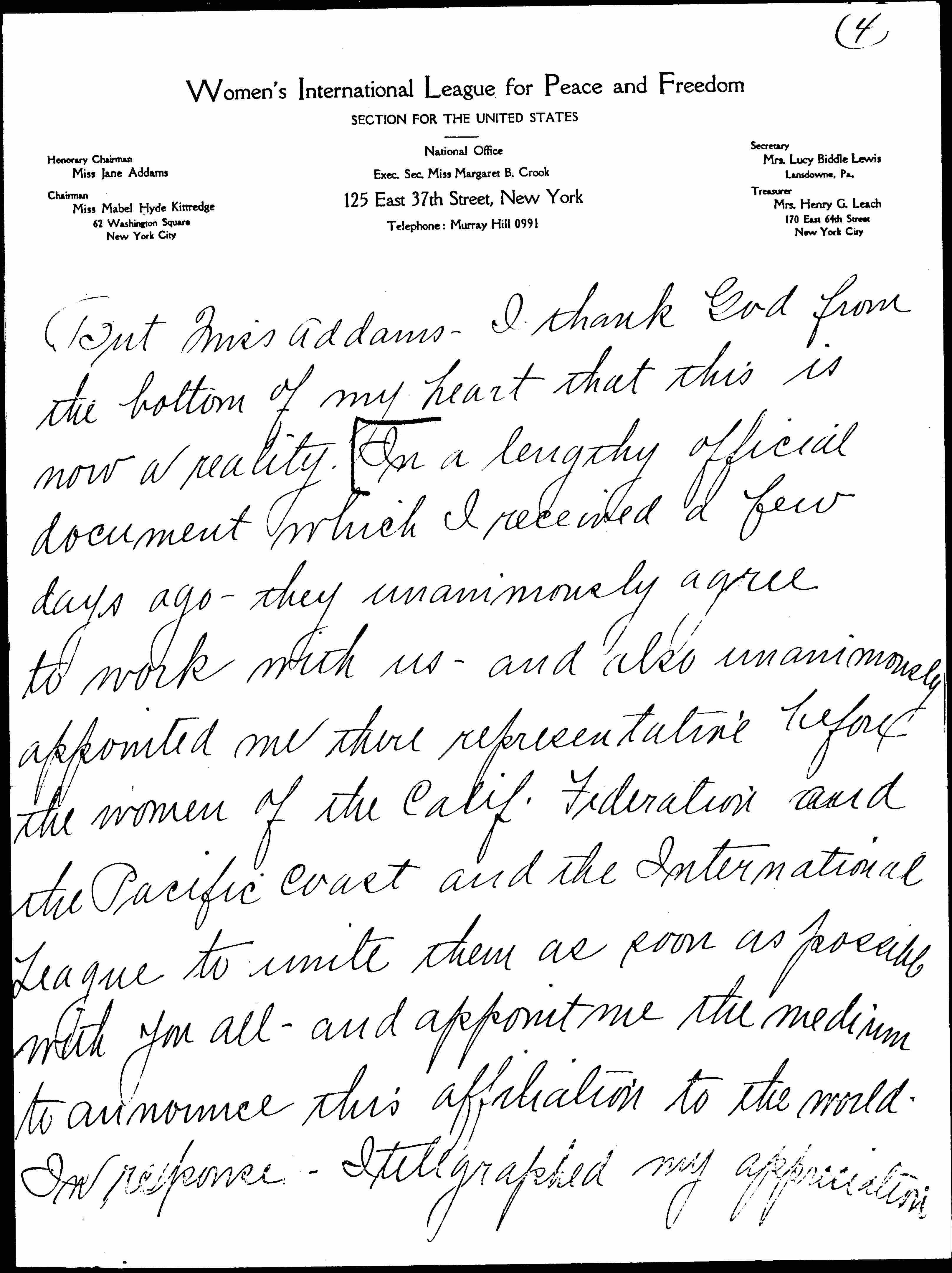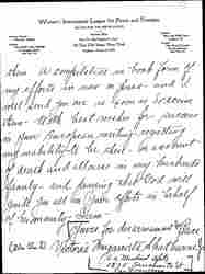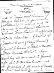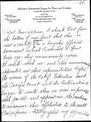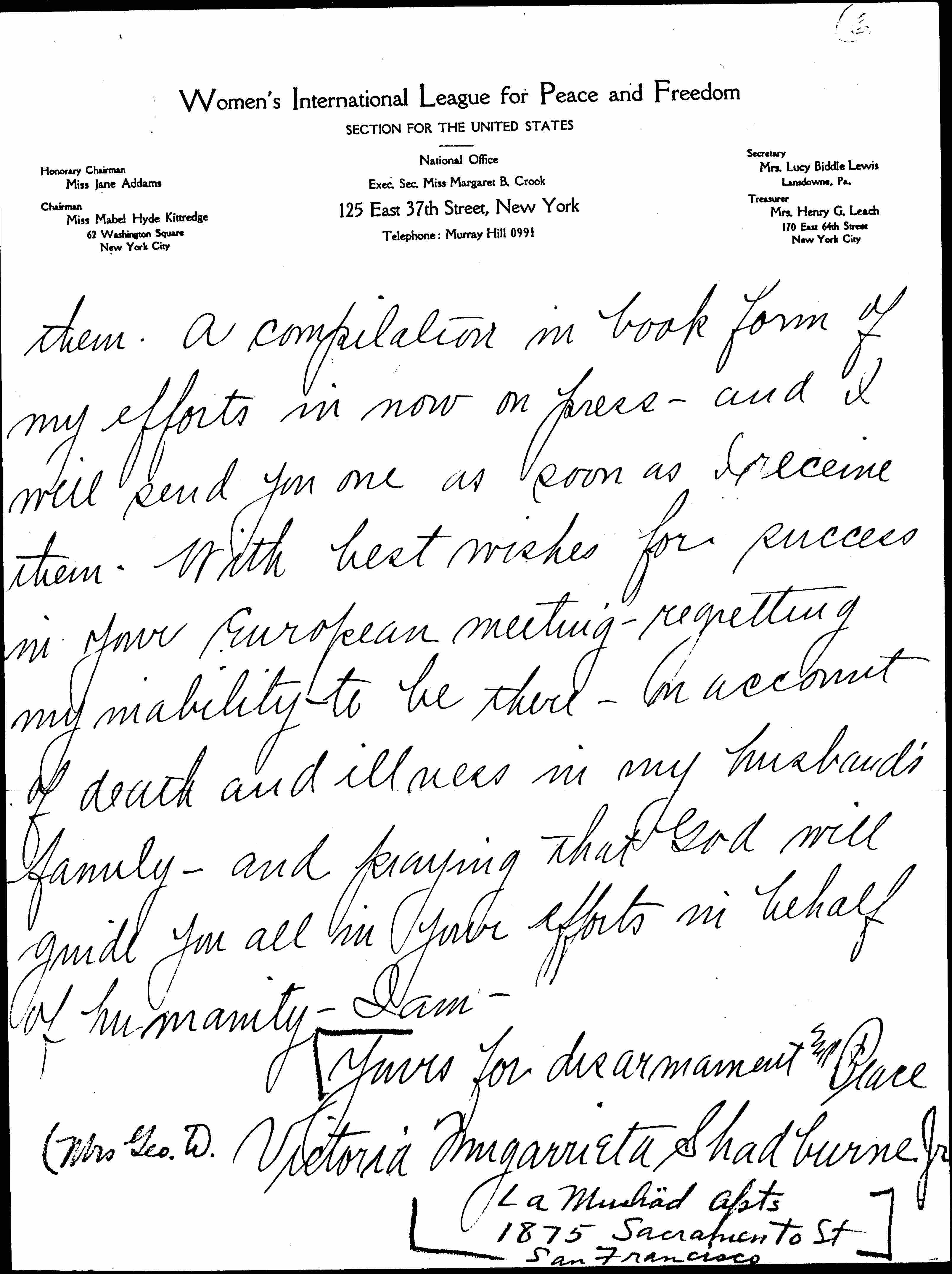 But Miss Addams -- I thank God from the bottom of my heart that this is now a reality. In a lengthy official document which I received a few days ago -- they unanimously agree to work with us -- and also unanimously appointed me [their] representative before the women of the Calif. Federation and the Pacific Coast and the International League to unite them as soon as possible with you all -- and appoint me the medium to announce this affiliation to the world. In response -- I telegraphed my appreciation [page 6] and as Pacific Coast Chairman of Mexican Relations -- in your name, as our International President and in the name of our Regional Chairman [Katherine] Cumberson -- I appointed Señorita Elena Torres -- (President of Secretaria General of Consejo Femenino) Regional Chairman of Mexico -- Mexican section -- Women's I.L.P.F. -- I am translating all documents to forward to you and to Mrs. Cumberson -- and am forwarding to you names of committee to assist Miss Torres -- as soon as I [receive] [page 7] them. A compilation in book form of my efforts is now on press -- and I will send you one as soon as I receive them. With best wishes for success in your European meeting -- regretting my inability to be there -- on account of death and illness in my husband's family -- and praying that God will guide you in your efforts in behalf of humanity -- I am --