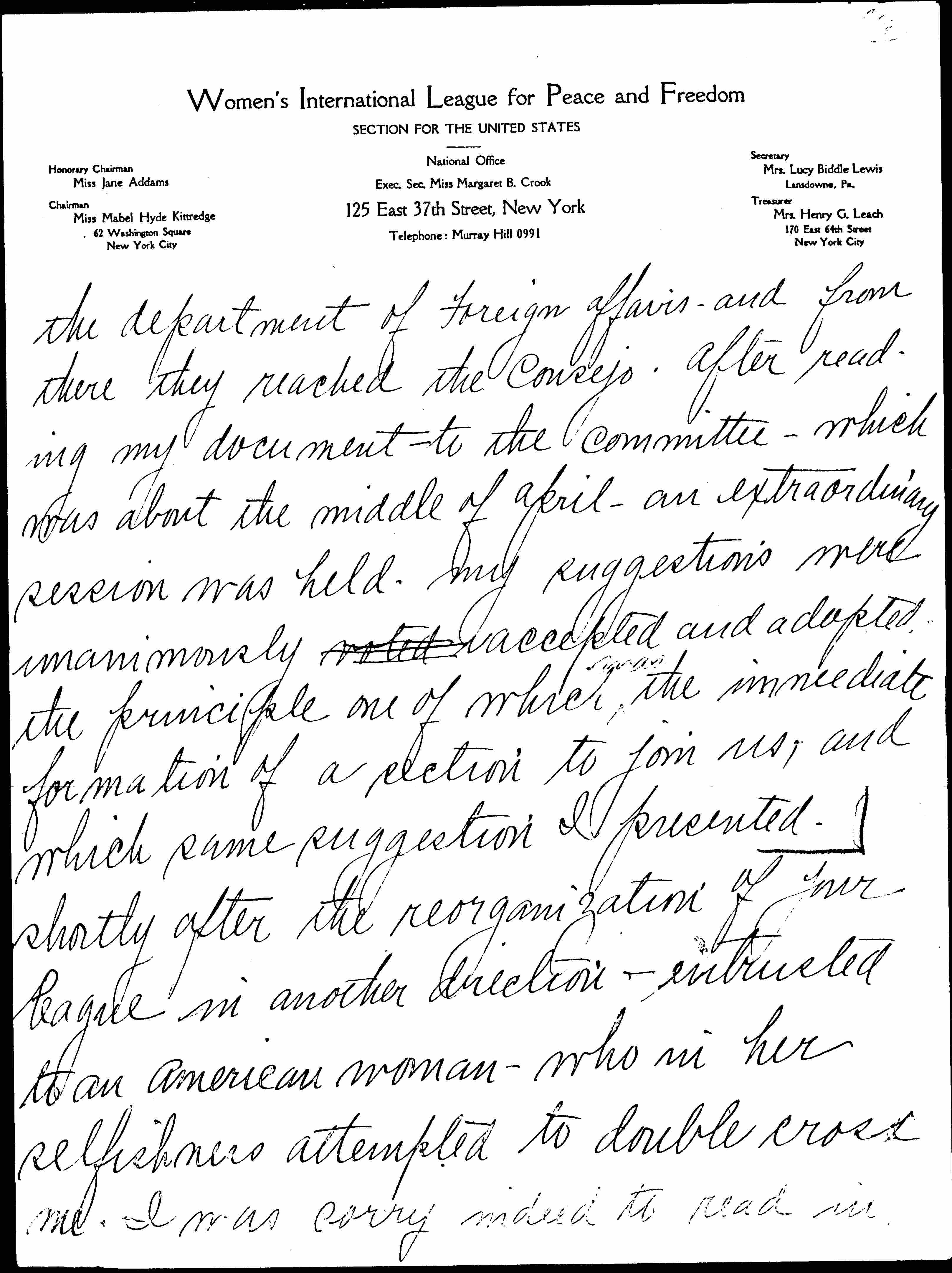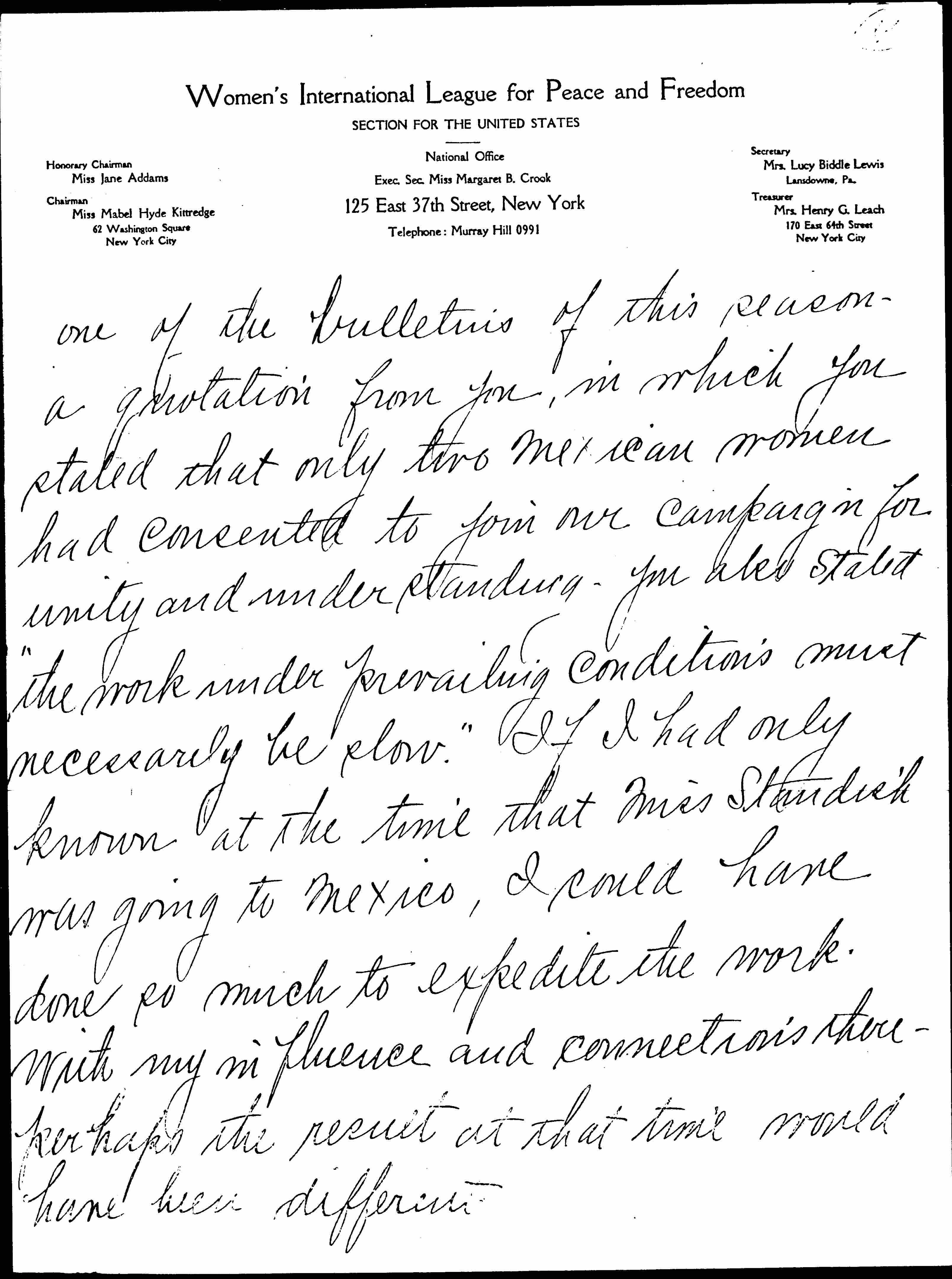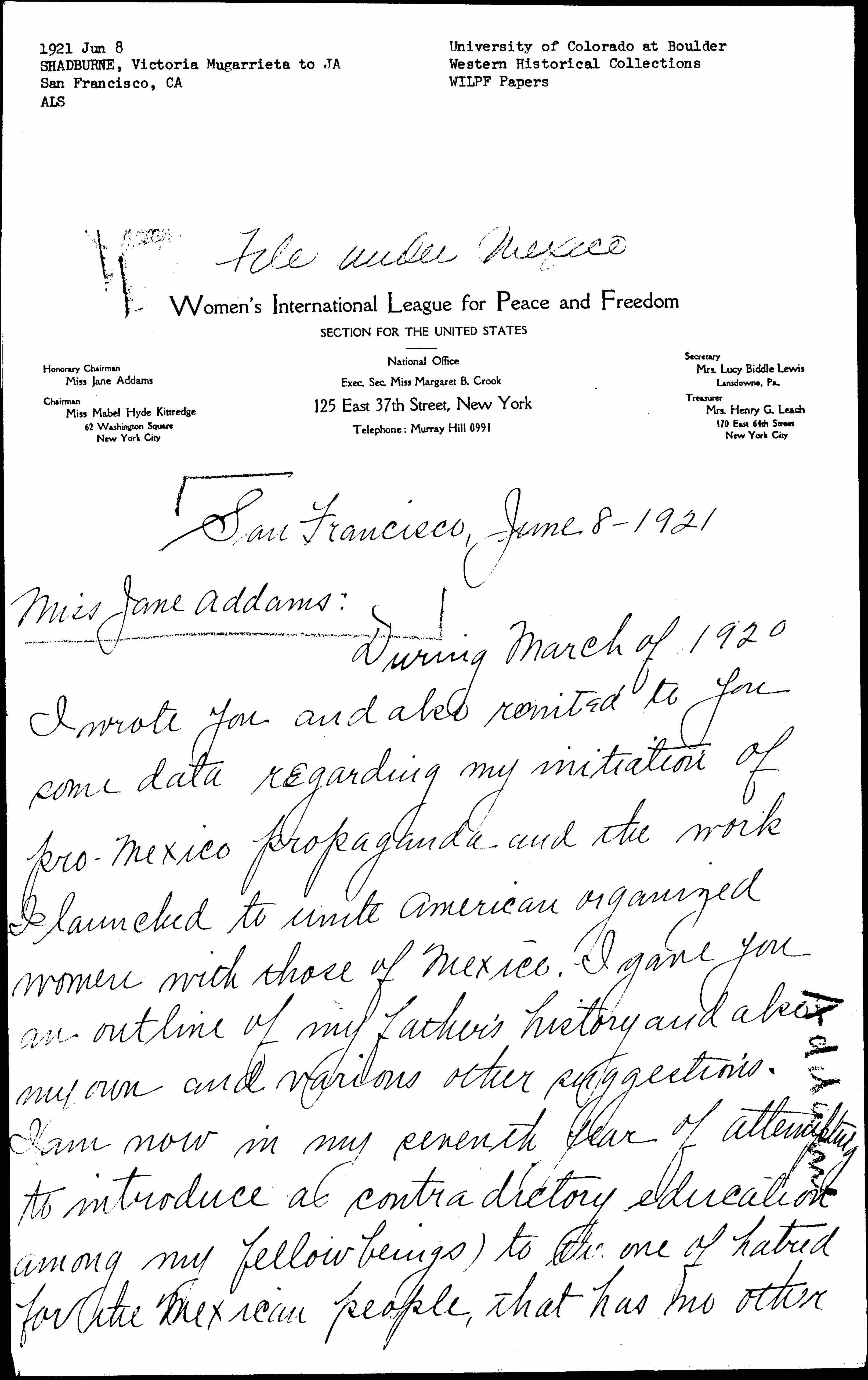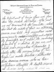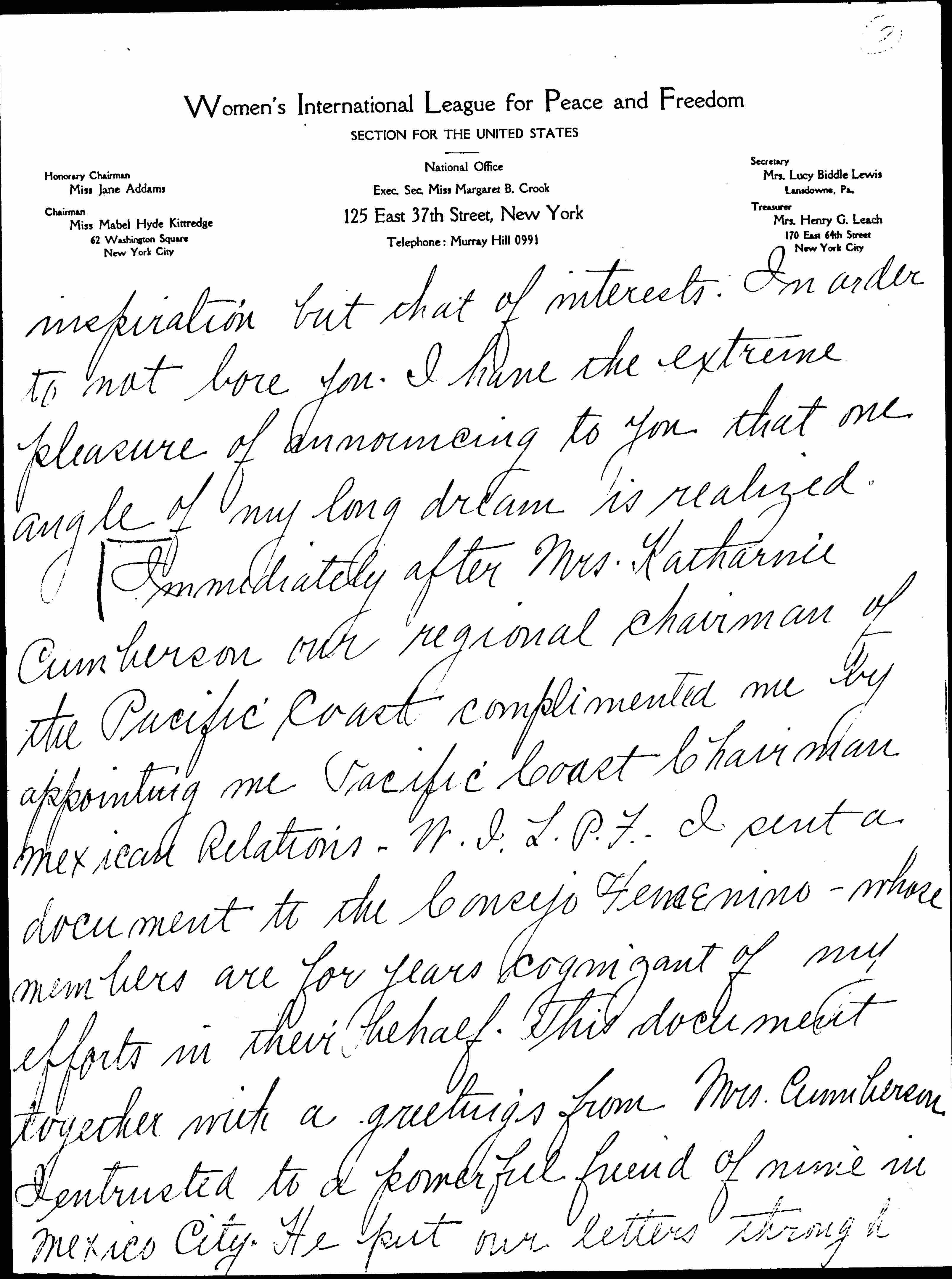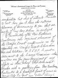 Immediately after Mrs. [Katherine] Cumberson our regional chairman of the Pacific Coast complimented me by appointing me Pacific Coast Chairman Mexican Relations -- W.I.L.P.F. I sent a document to the Consejo Femenino -- whose members are for years cognizant of my efforts in their behalf. This document together with a greetings from Mrs. Cumberson I entrusted to a powerful friend of mine in Mexico City. He put our letters through [page 3] the department of foreign affairs -- and from there they reached the Consejo. After reading my document to the committee -- which was about the middle of April -- an extraordinary session was held. My suggestions were unanimously voted ↑accepted↓ and adopted, the principle one of which ↑was↓ the immediate formation of a section to join us, and which same suggestion I presented shortly after the reorganization of your league in another direction -- entrusted to an American woman -- who in her selfishness attempted to double cross me. I was sorry indeed to read in [page 4] one of the bulletins of this season a quotation from you, in which you stated that only two Mexican women had consented to join our campaign for unity and understanding. You also stated "the work under prevailing conditions must necessarily be slow." If I had only known at the time that Miss Standish was going to Mexico, I could have done so much to expedite the work. With my influence and connections there -- perhaps the result at that time would have been different. [page 5]