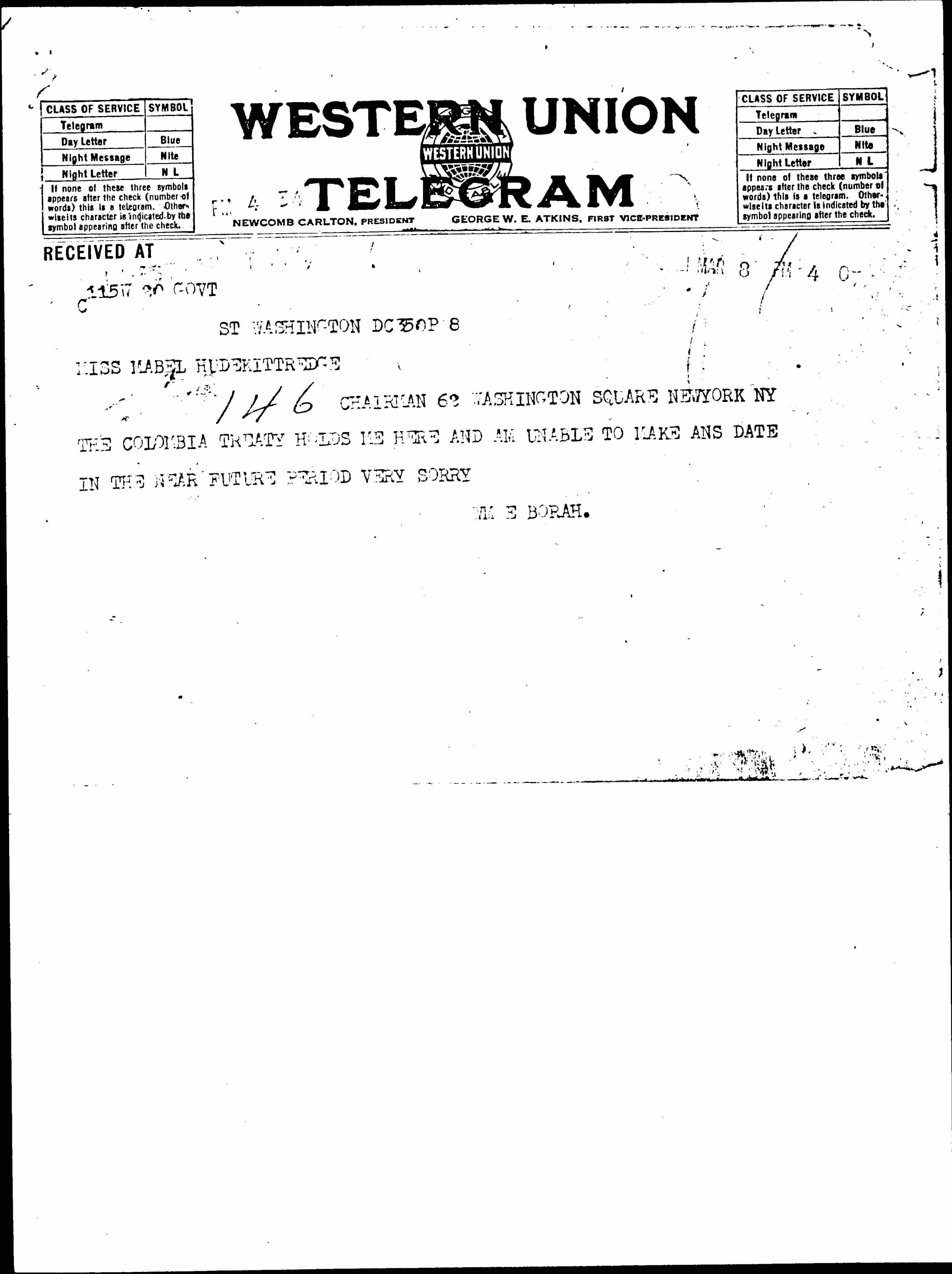 CHAIRMAN 62 WASHINGTON SQUARE NEW YORK NY THE COLOMBIA TREATY HOLDS ME HERE AND AM UNABLE TO MAKE [ANY] DATE IN THE NEAR FUTURE PERIOD VERY SORRY