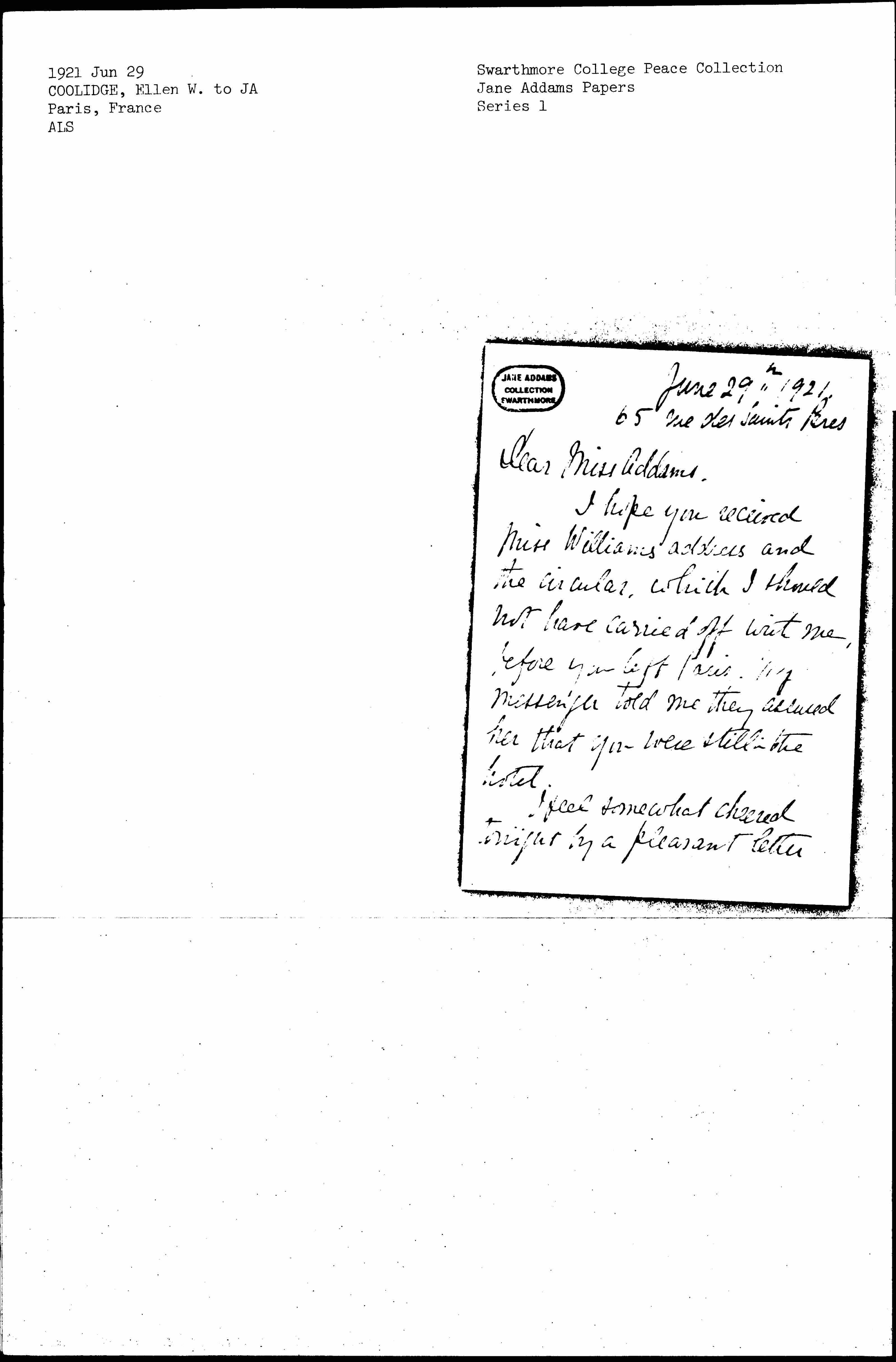I hope you received Miss Williams address and the circular, which I should not have carried off with me, before you left Paris. My messenger told me they assured her that you were still in the hotel.