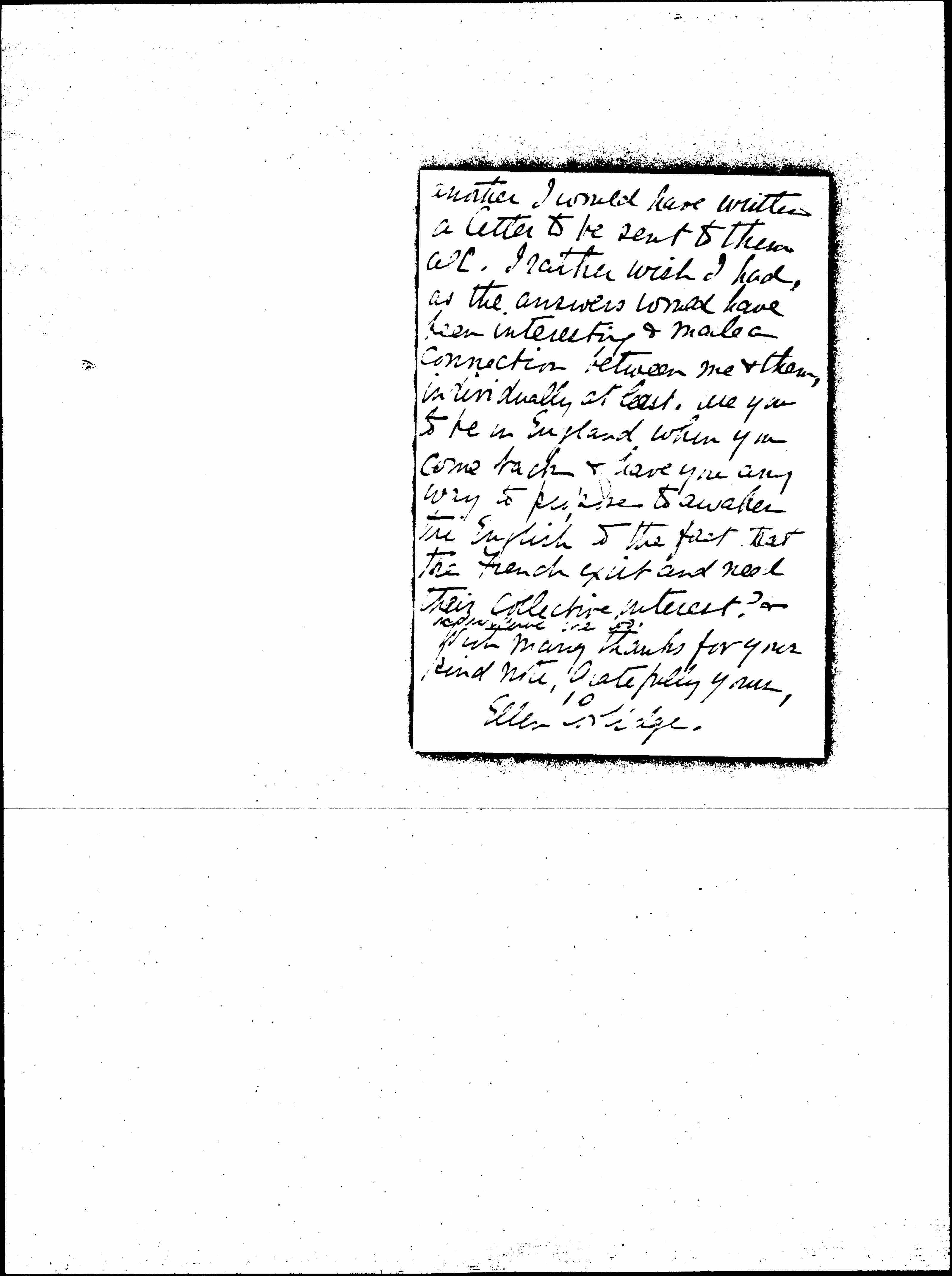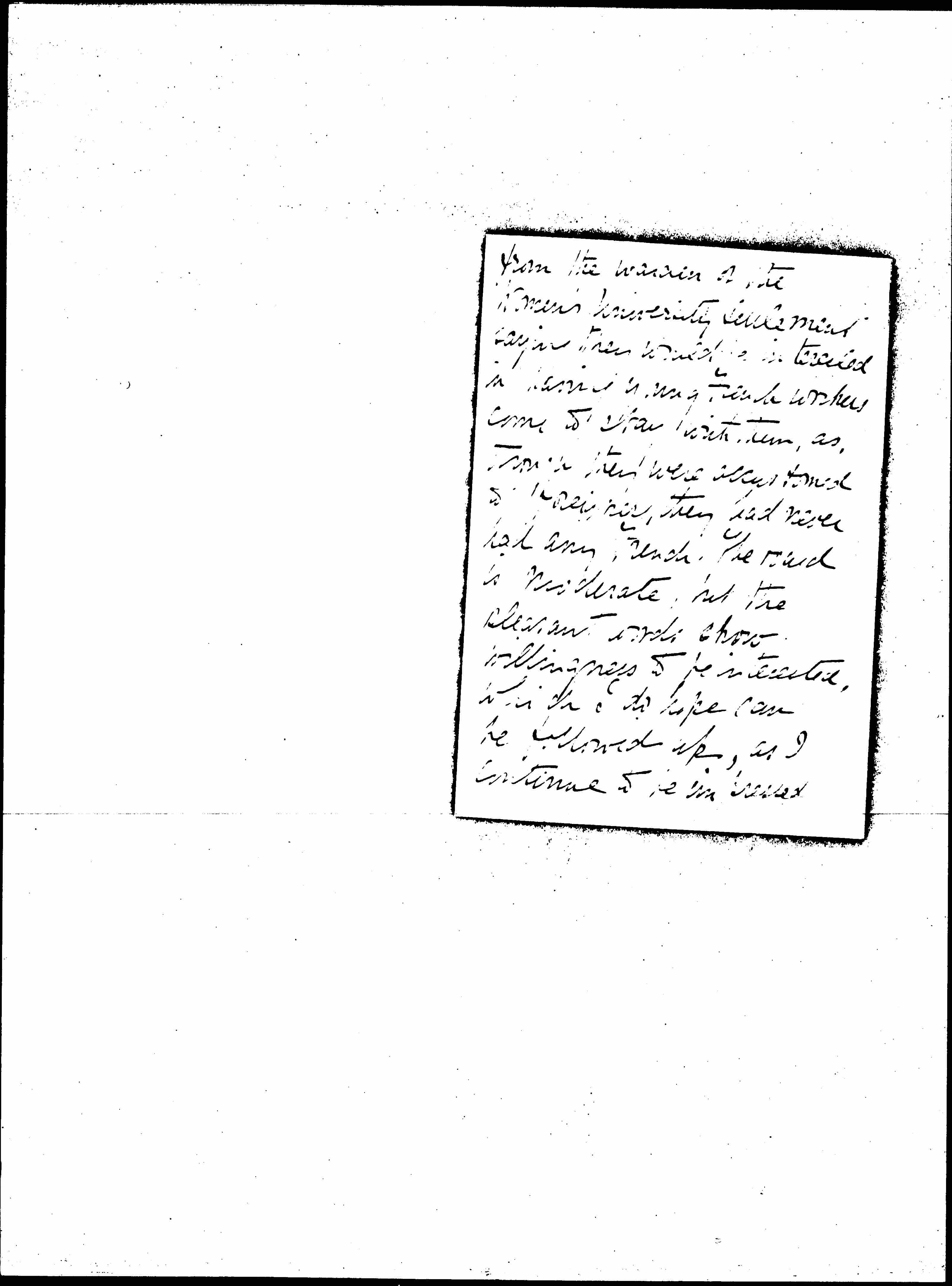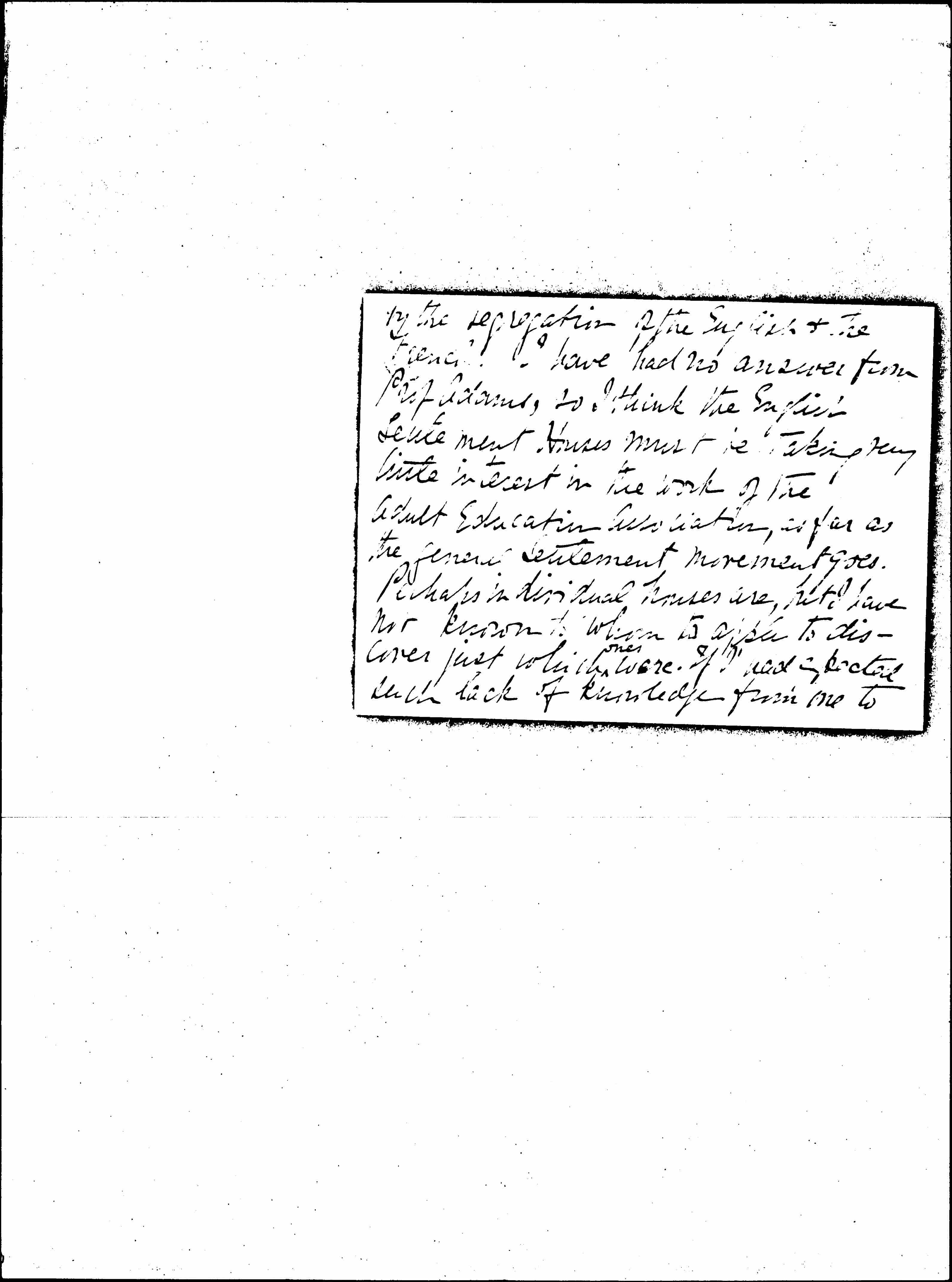 I feel somewhat cheered tonight by a pleasant letter [page 2] from the women of the Women's University Settlement saying they would be interested in having young French workers come to stay with them, as, though they were accustomed to foreigners, they had never had any French. The [board] is moderate, but the [pleasant] words show willingness to be interested, which I do hope can be followed up, as I continue to be impressed [page 3] by the segregation of the English & the French. I have had no answer from Prof. Adams, so I think the English Settlement Houses must be taking very little interest in the work of the Adult Education Association, as far as the general Settlement movement goes. Perhaps individual houses are, but I have not known to whom to [apply] to discover just which ↑ones↓ were. If I had expected such lack of knowledge from one to [page 4] another I would have written a letter to be sent to them all. I rather wish I had, as the answers would have been interesting & made a connection between me & them, individually at least. Are you to be in England when you come back & have you any way to propose to awaken the English to the fact that the French exist and need their collective interest? or ↑[individual] one too.↓
