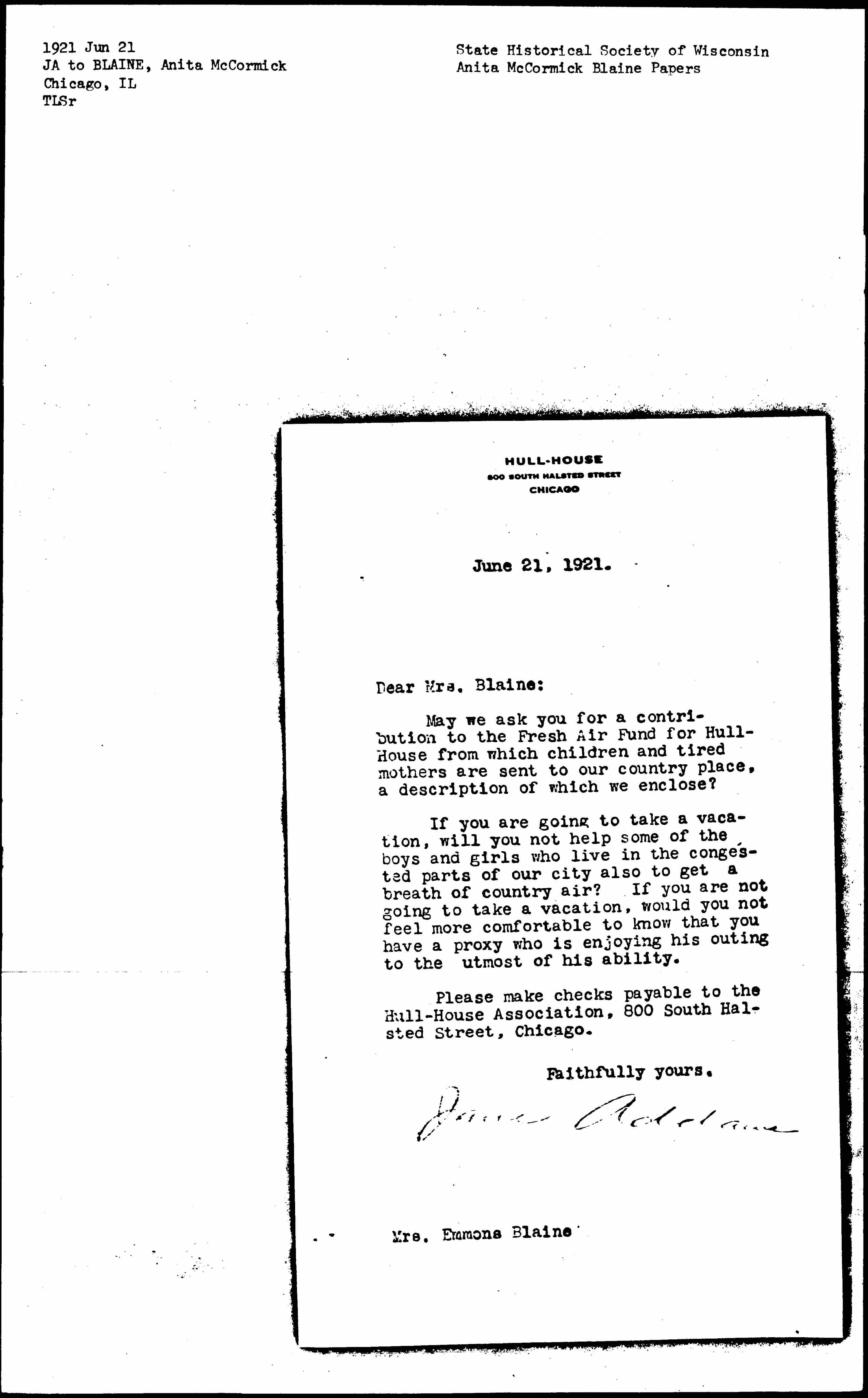 May we ask you for a contribution to the Fresh Air Fund for Hull-House from which children and tired mothers are sent to our country place, a description of which we enclose?