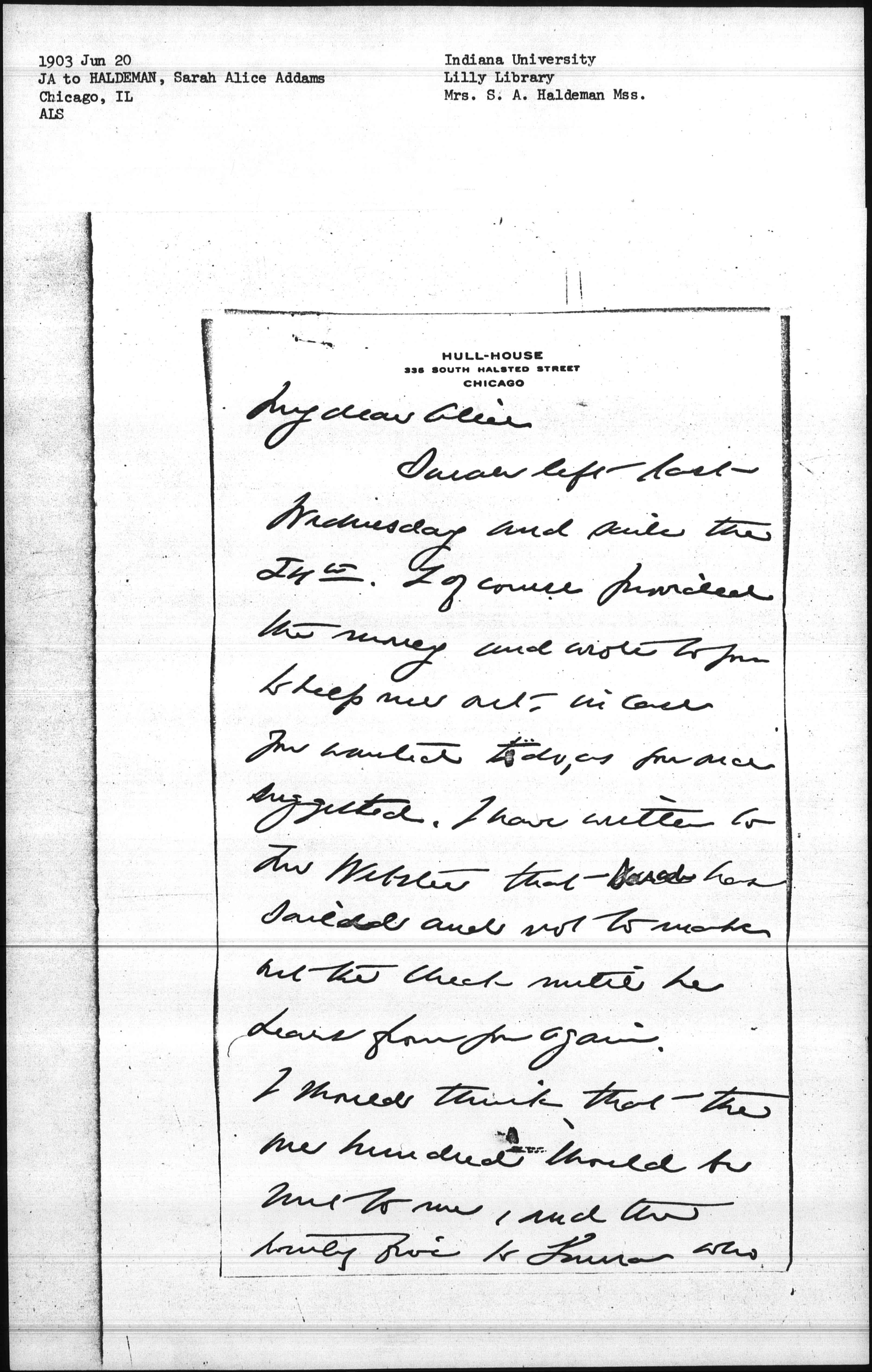 Sarah left last Wednesday and sails the 24th. I of course provided the money and wrote to you to help me out, in case you wanted to do, as you once suggested. I have written to Mr Webster that Sarah has sailed and not to make out the check until he hears from you again.