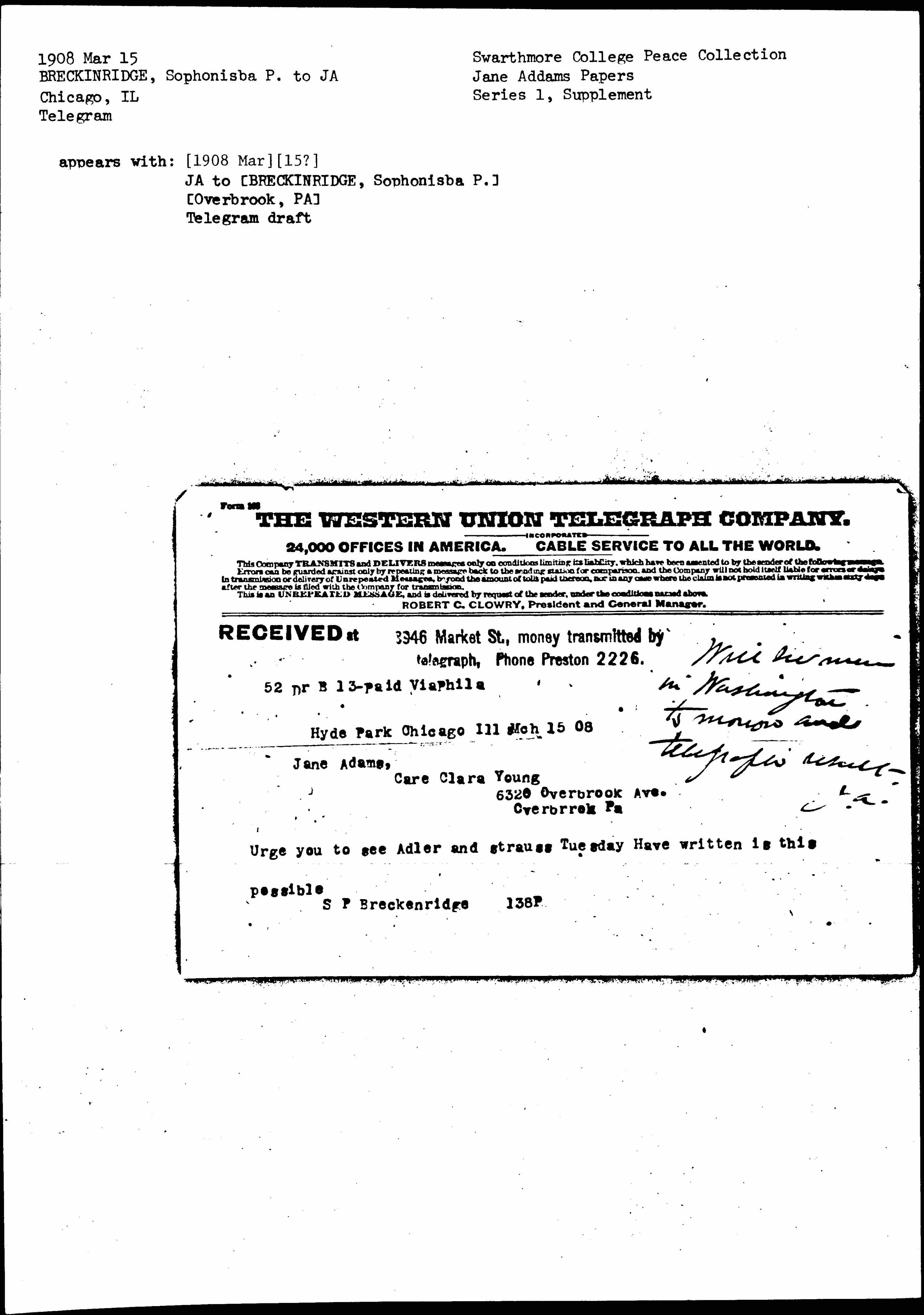 RECEIVED at [3]946 Market St.,Hyde Park Chicago Ill Mch 15 08