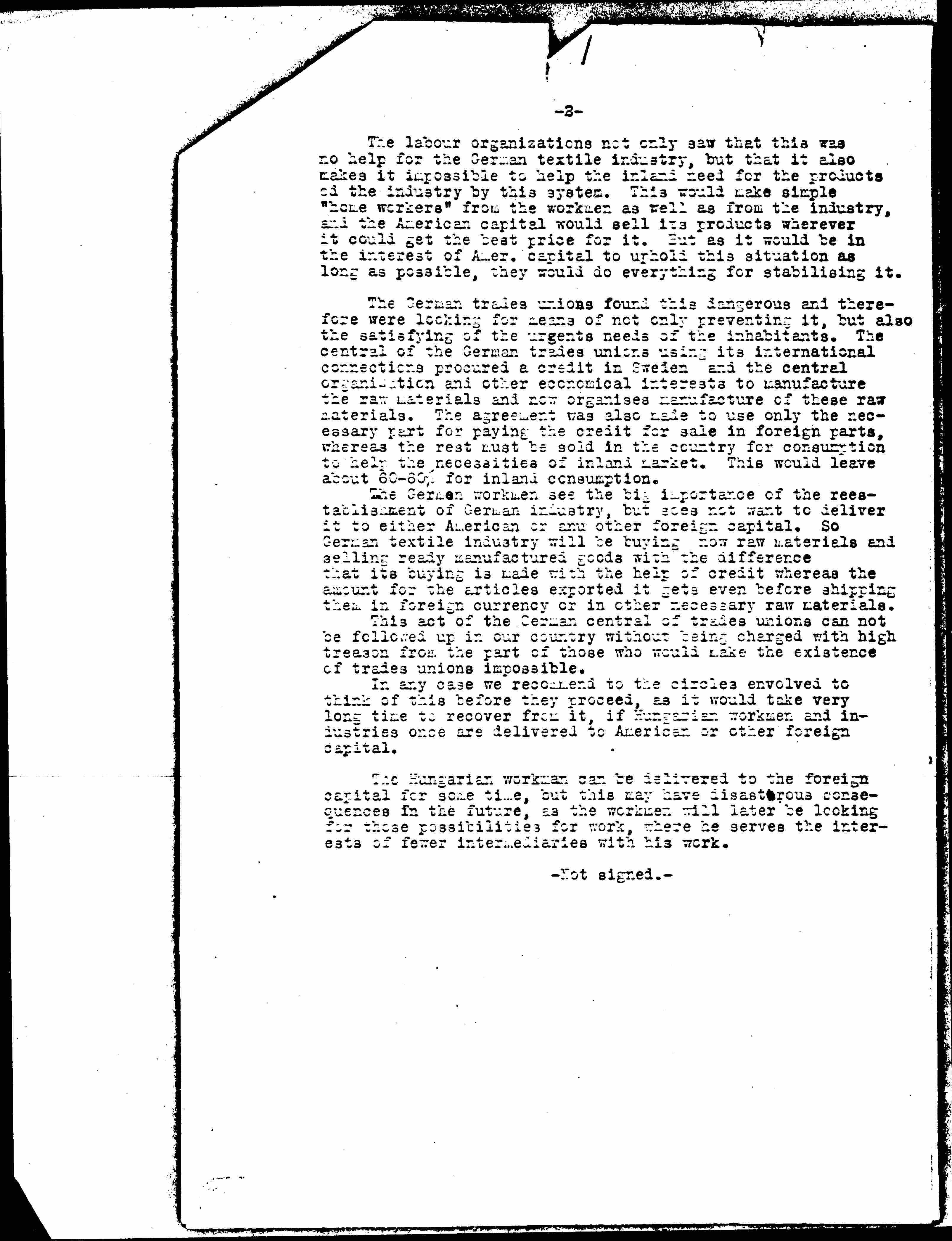 The [labor] organizations not only saw that this was no help for the German textile industry, but that it also makes it impossible to help the inland need for the products [of] the industry by this system. This would make simple "home workers" from the workmen as well as from the industry, and the American capital would sell its products wherever it could get the best price for it. But as it would be in the interest of Amer. capital to uphold this situation as long as possible, they would do everything for [stabilizing] it.