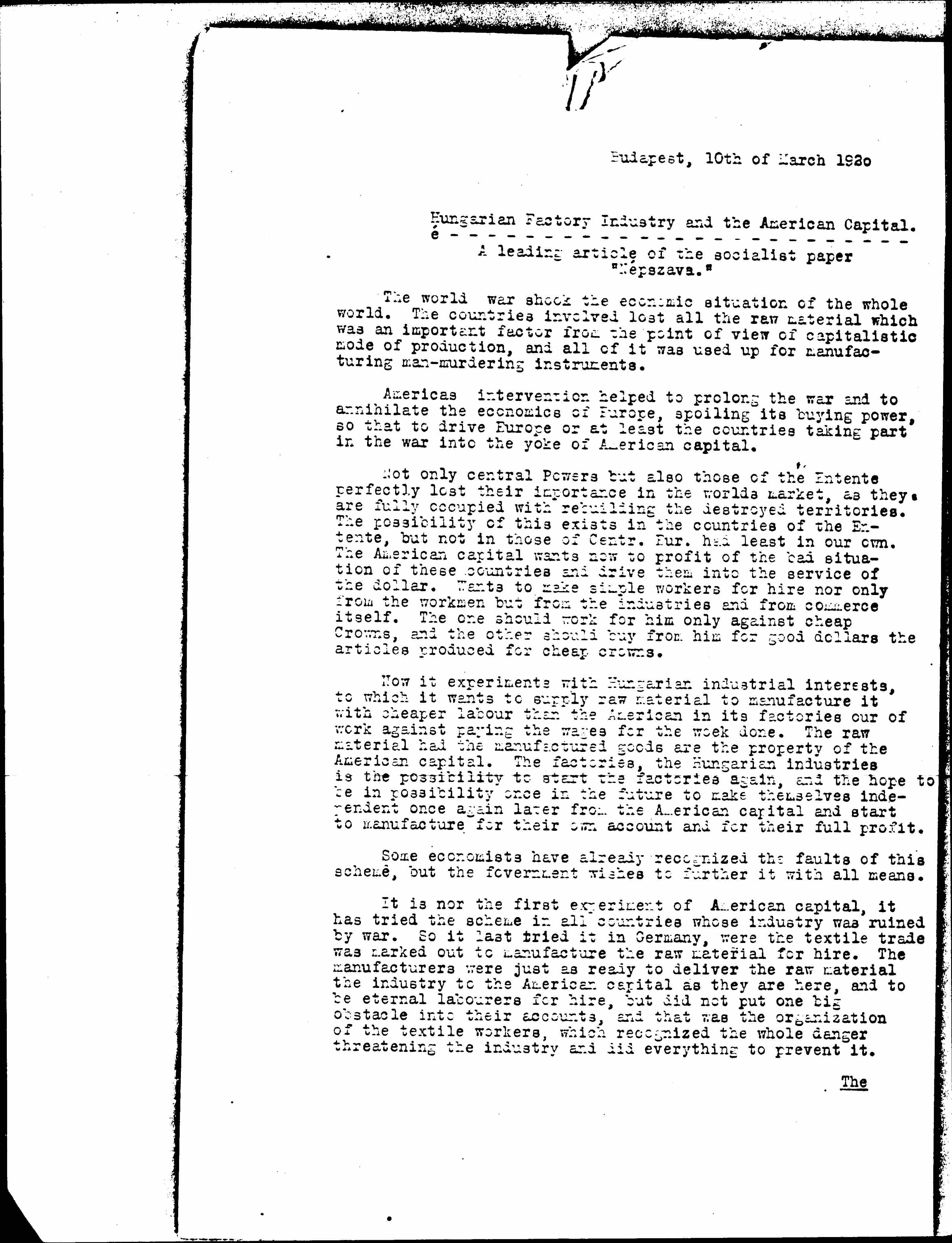 Now it experiments with Hungarian industrial interests, to which it wants to supply raw material to manufacture it with cheaper [labor] than the American in its factories our of work against paying the wages for the work done. The raw material had the manufactured goods are the property of the American capital. The factories, the Hungarian industries is the possibility to start the factories again, and the hope to be in possibility once in the future to make themselves independent once again later from the American capital and start to manufacture for their own account and for their full profit.
