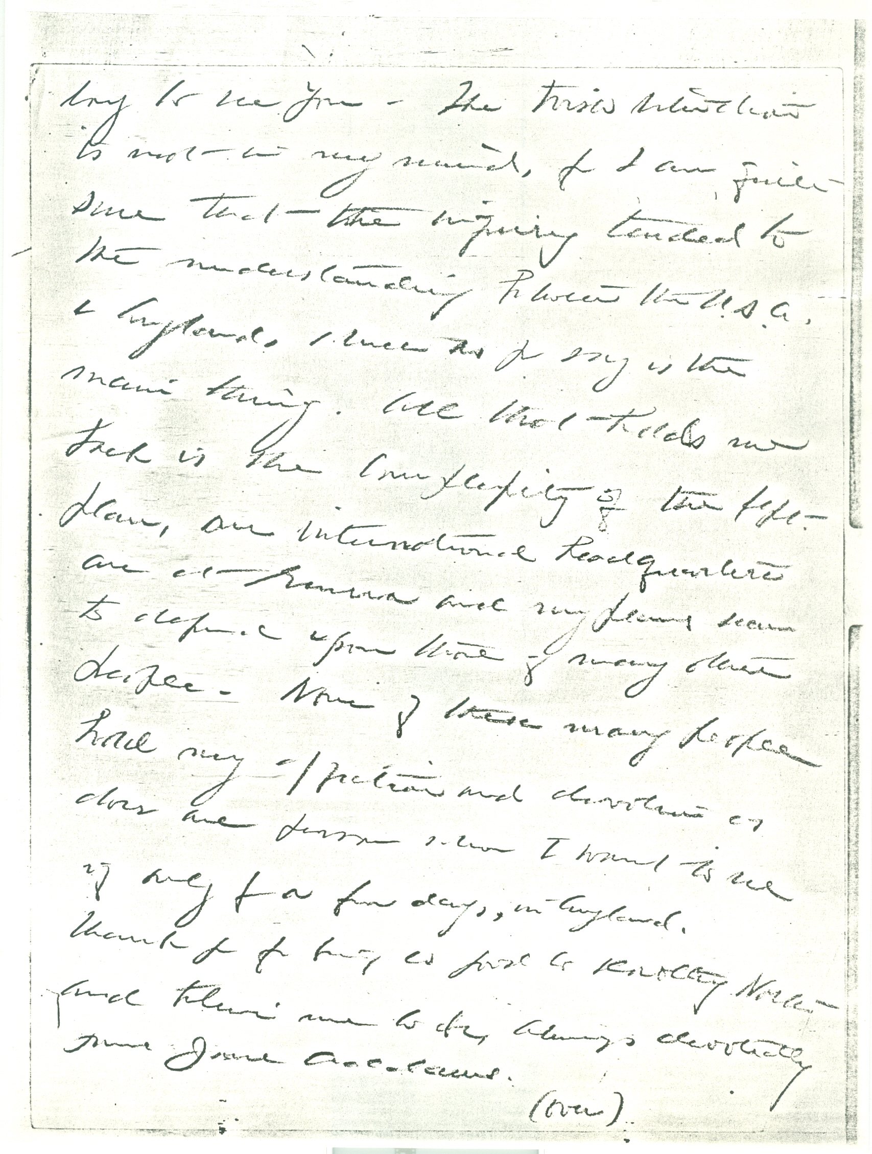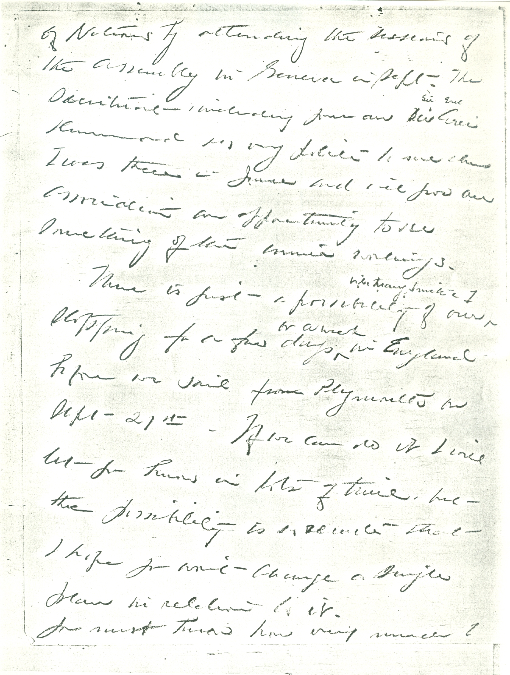 There is just a possibility of our ↑[with] Mary Smith & I↓ stopping for a few days ↑or a week↓ in England before we sail from Plymouth on Sept 21st. If we can do it I will let you know in lots of time, but the possibility is so [illegible] that I hope you won't change a single plan in relation to it.