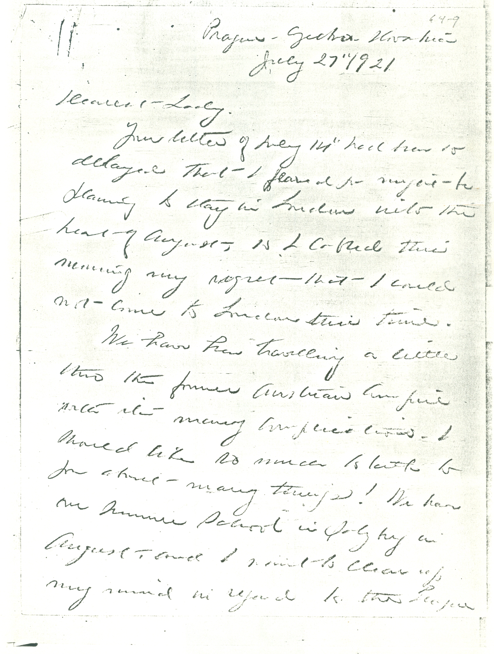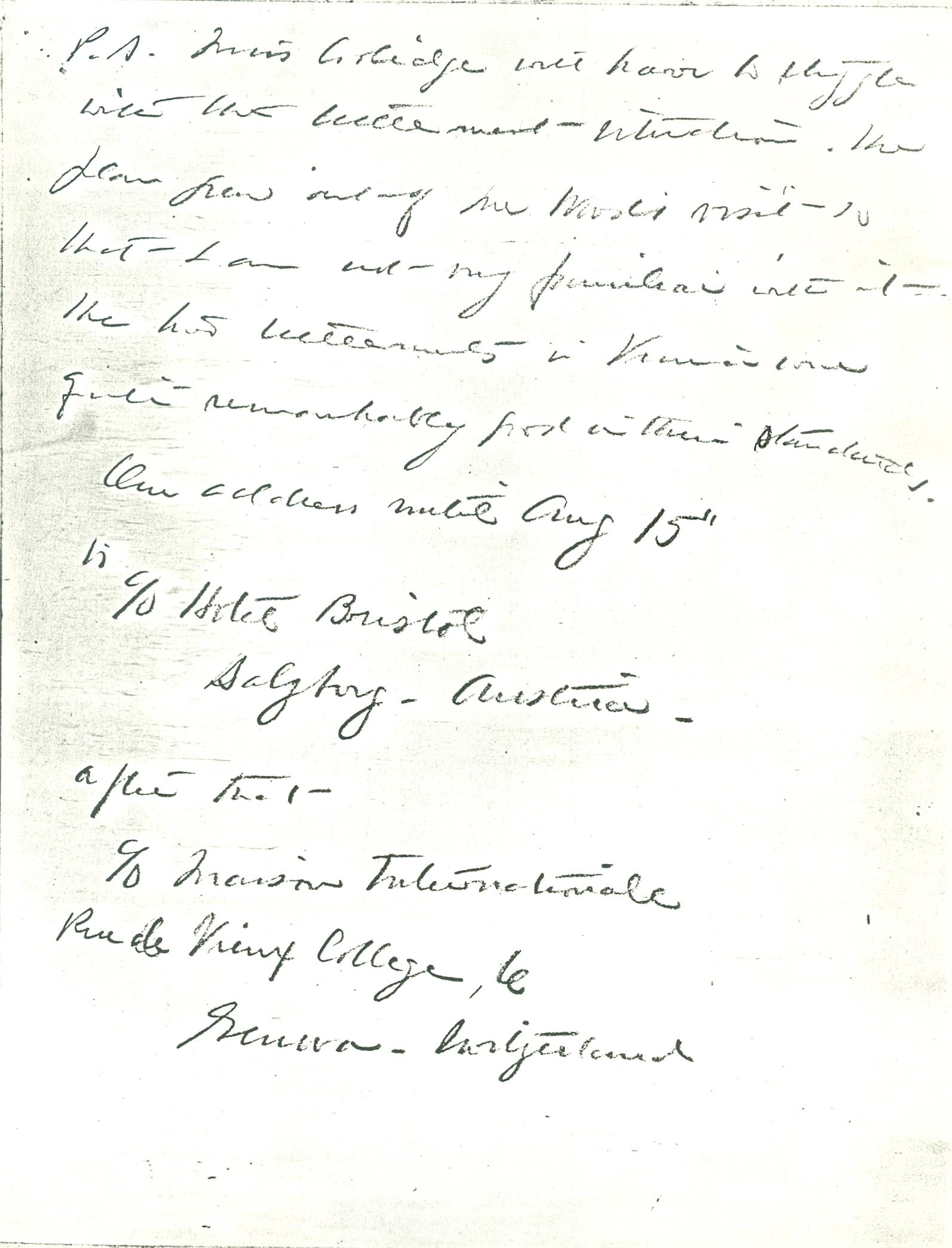 We have been [traveling] a little [through] the former Austrian Empire with its many complications. I should like so much to talk to you about many things! We have our Summer School in Salzburg in August, and I want to clear up my mind in regard to the League [page 2] of Nations by attending the sessions of the assembly in Geneva in Sept. The Secretariat including your own Sir Eric Drummond was very polite to me when I was there in June and will give an Association an opportunity to see something of the inner workings.