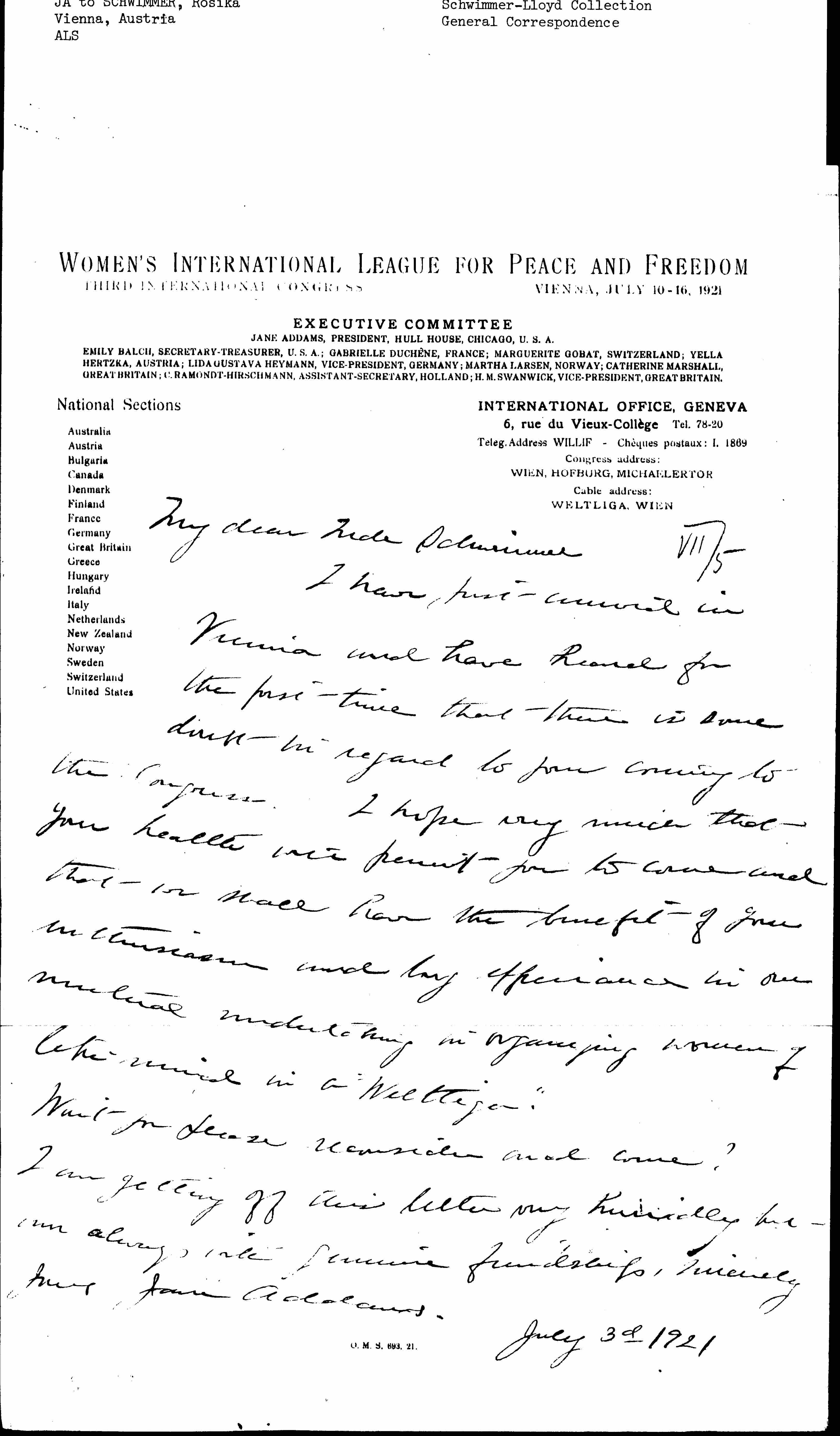 I have just arrived in Vienna and have heard for the first time that there is some doubt in regard to your coming to the Congress. I hope very much that your health will permit you to come and that we shall have the benefit of your enthusiasm and long experience in our mutual undertaking in organizing women of like mind in a "Weltliga."