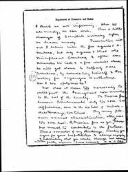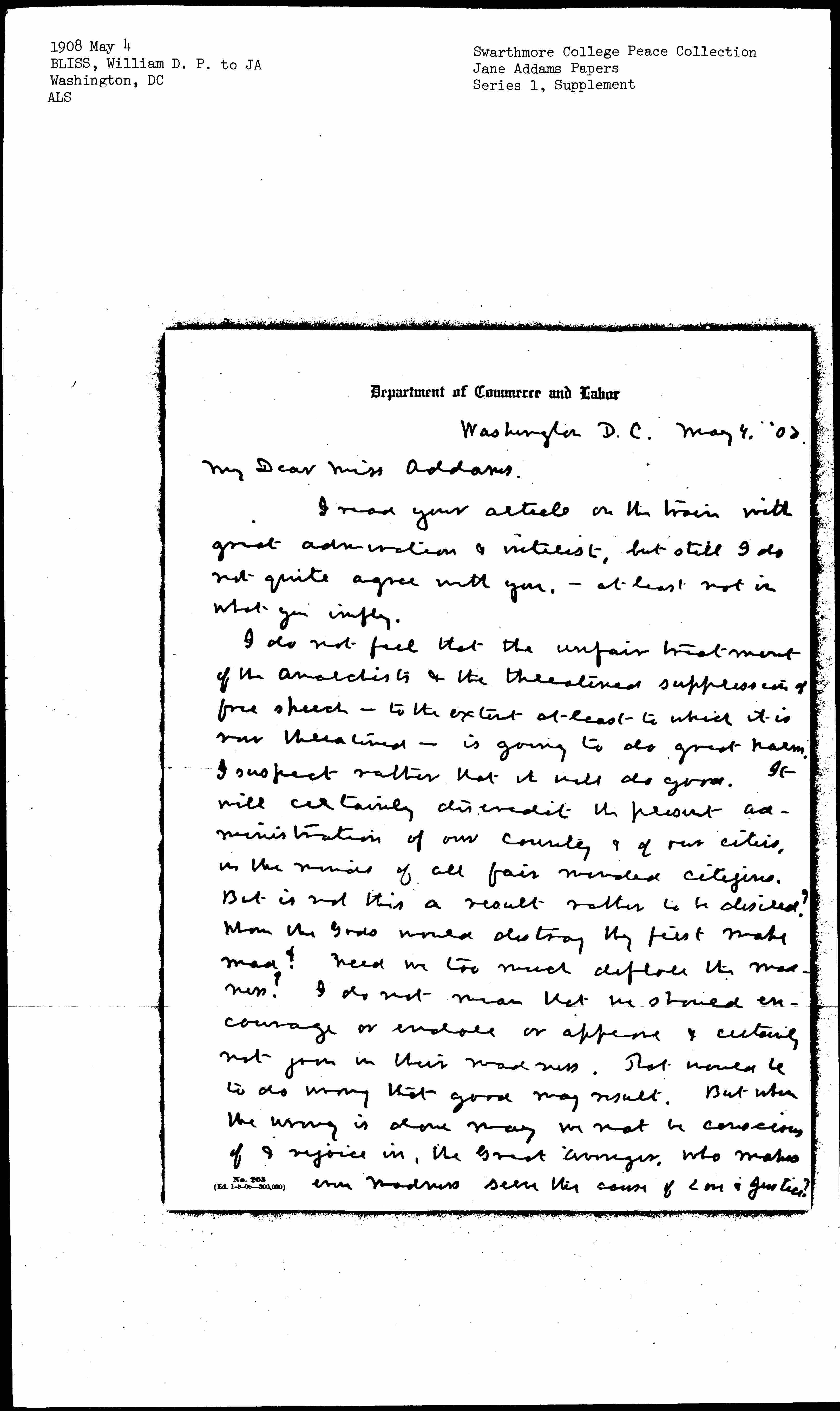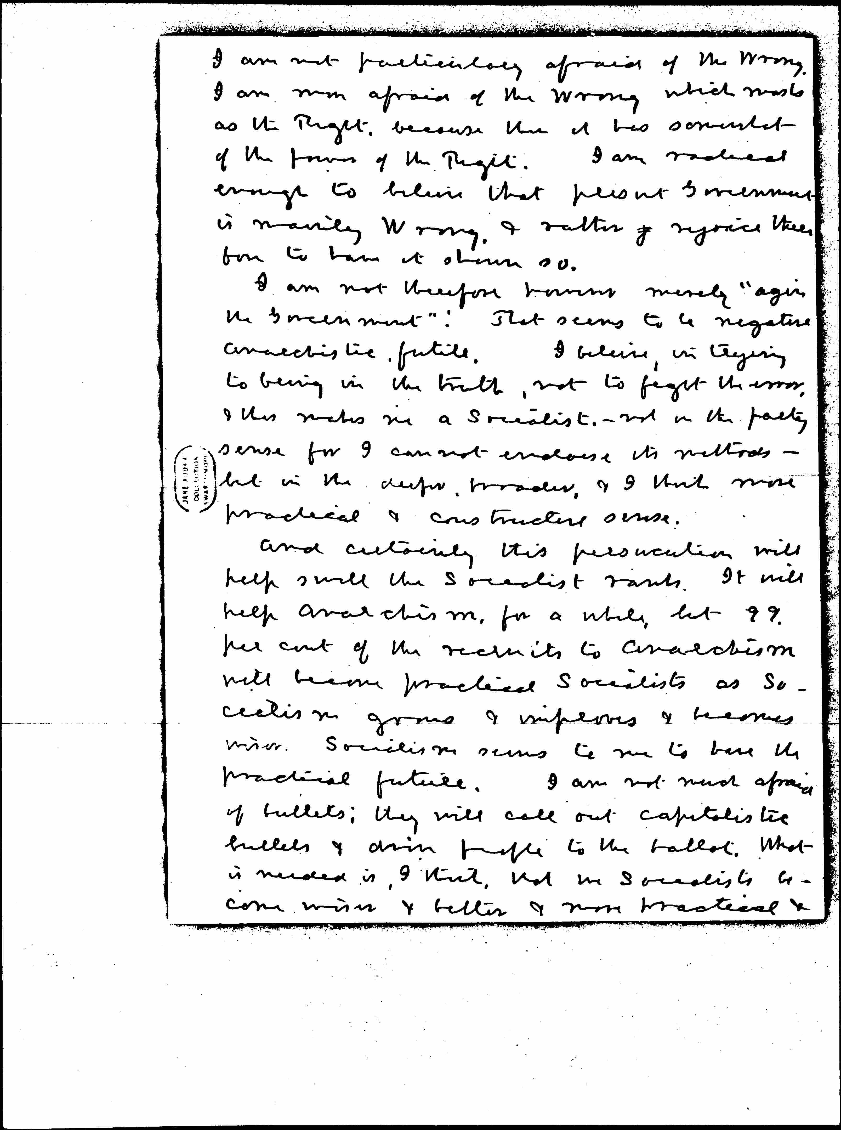 I do not feel that the unfair treatment of the anarchists & the threatened suppression of free speech -- to the extent at least to which it is now threatened -- is going to do great harm. I suspect rather that it will do good. It will certainly discredit the present administration of our county & of our cities, in the minds of all fair minded citizens. But is not this a result rather to be desired? Whom the Gods would destroy they first make mad? Need we too much deplore the madness? I do not mean that we should encourage or endorse or appease & certainly not join in their madness. That would be to do wrong that good may result. But when the wrong is done may we not be conscious of & rejoice in, the Great Avenger, who makes even madness seem the cause of [Law] & Justice? [page 2] I am not particularly afraid of the wrong. I am more afraid of the wrong which masks as the Right, because then it has somewhat of the fervor of the Right. I am radical enough to believe that present Government is mainly Wrong, & rather rejoice therefore to have it shown so.
