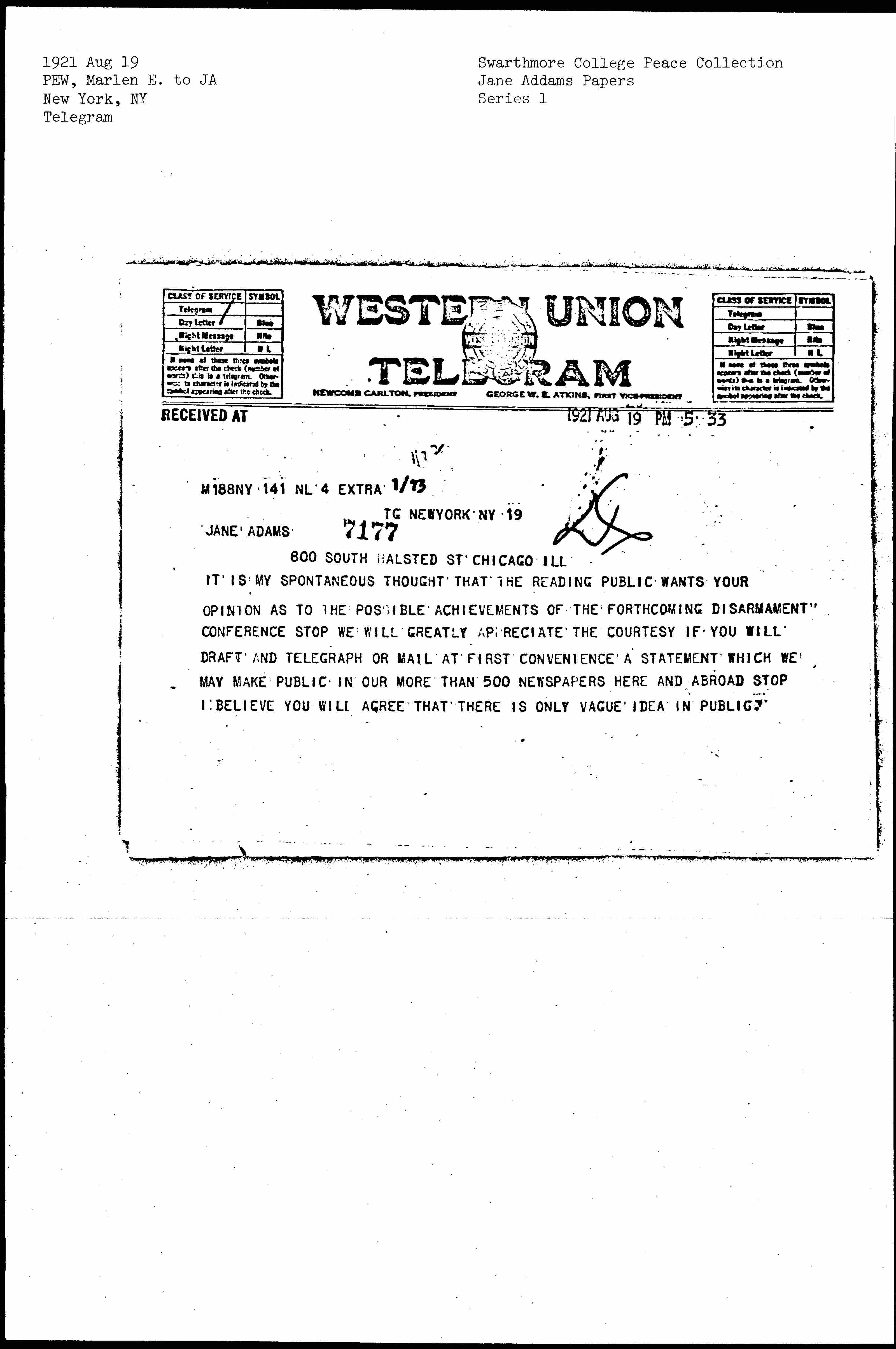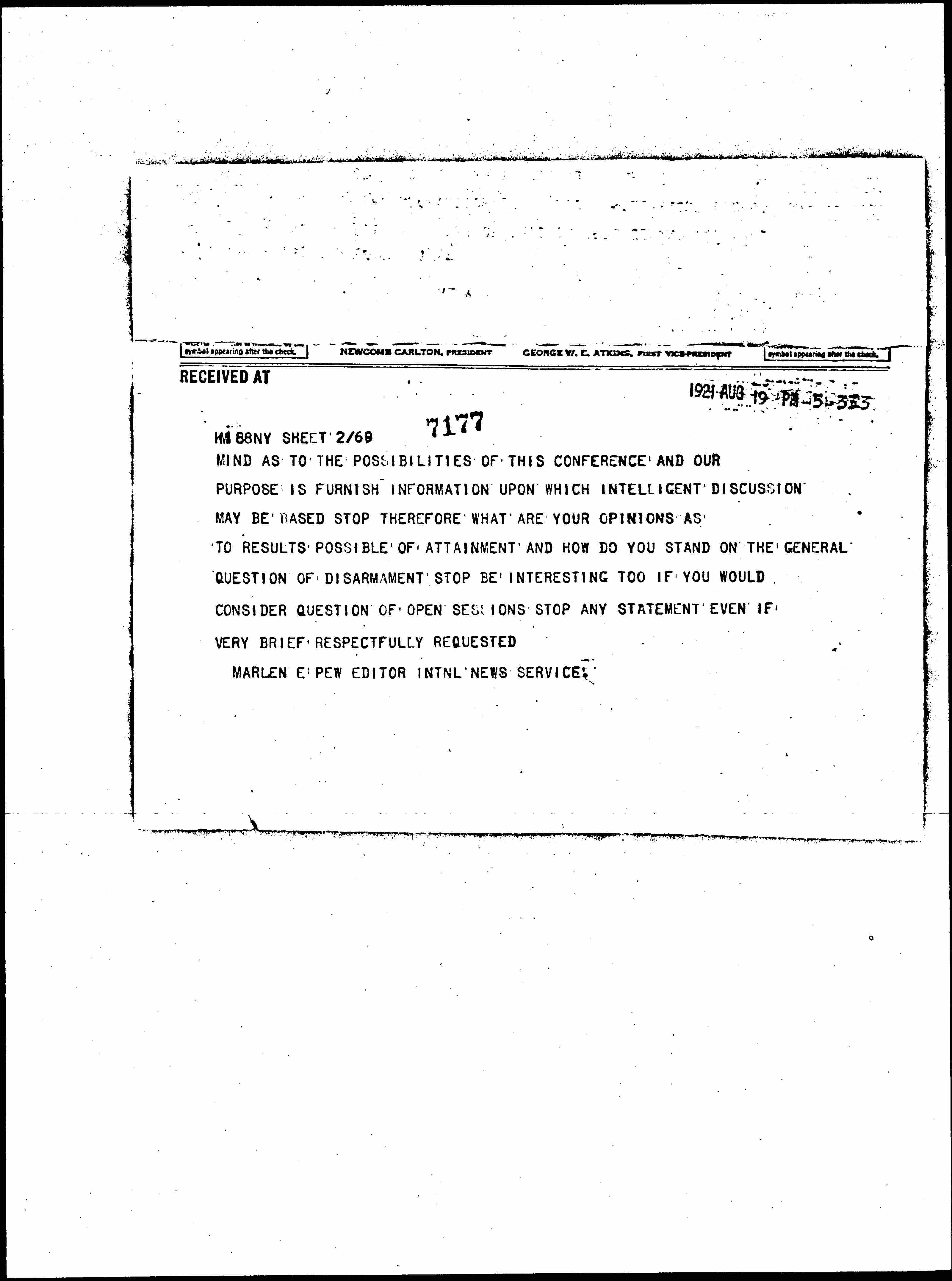 IT IS MY SPONTANEOUS THOUGHT THAT THE READING PUBLIC WANTS YOUR OPINION AS TO THE POSSIBLE ACHIEVEMENTS OF THE FORTHCOMING DISARMAMENT CONFERENCE. WE WILL GREATLY APPRECIATE THE COURTESY IF YOU WILL DRAFT AND TELEGRAPH OR MAIL AT FIRST CONVENIENCE A STATEMENT WHICH WE MAY MAKE PUBLIC IN OUR MORE THAN 500 NEWSPAPERS HERE AND ABROAD. I BELIEVE YOU WILL AGREE THAT THERE IS ONLY VAGUE IDEA IN PUBLIC [PAGE 2] MIND AS TO THE POSSIBILITIES OF THIS CONFERENCE AND OUR PURPOSE IS FURNISH INFORMATION UPON WHICH INTELLIGENT DISCUSSION MAY BE BASED. THEREFORE WHAT ARE YOUR OPINIONS AS TO RESULTS POSSIBLE OF ATTAINMENT AND HOW DO YOU STAND ON THE GENERAL QUESTION OF DISARMAMENT. BE INTERESTING TOO IF YOU WOULD CONSIDER QUESTION OF OPEN SESSIONS. ANY STATEMENT EVEN IF VERY BRIEF RESPECTFULLY REQUESTED