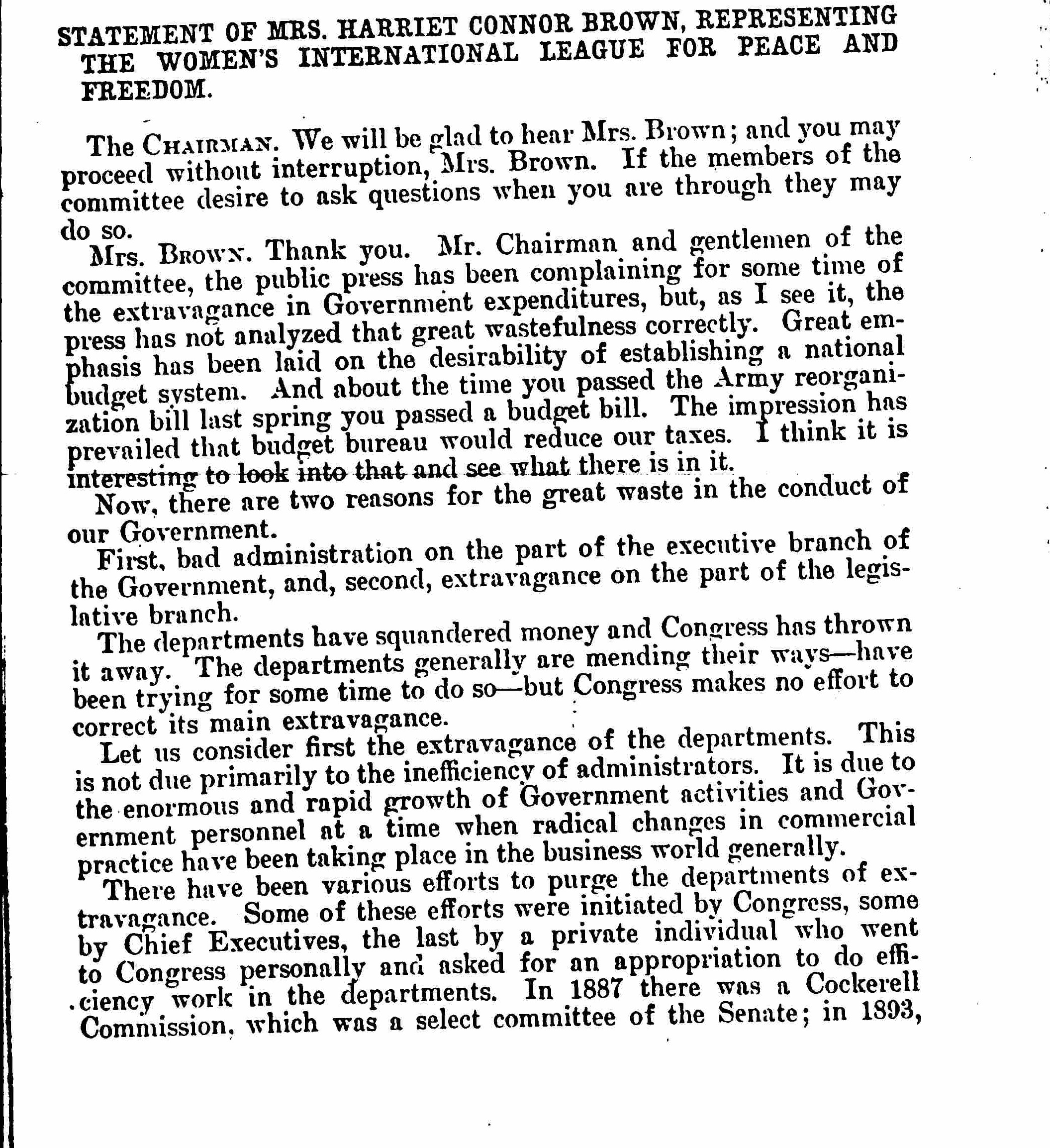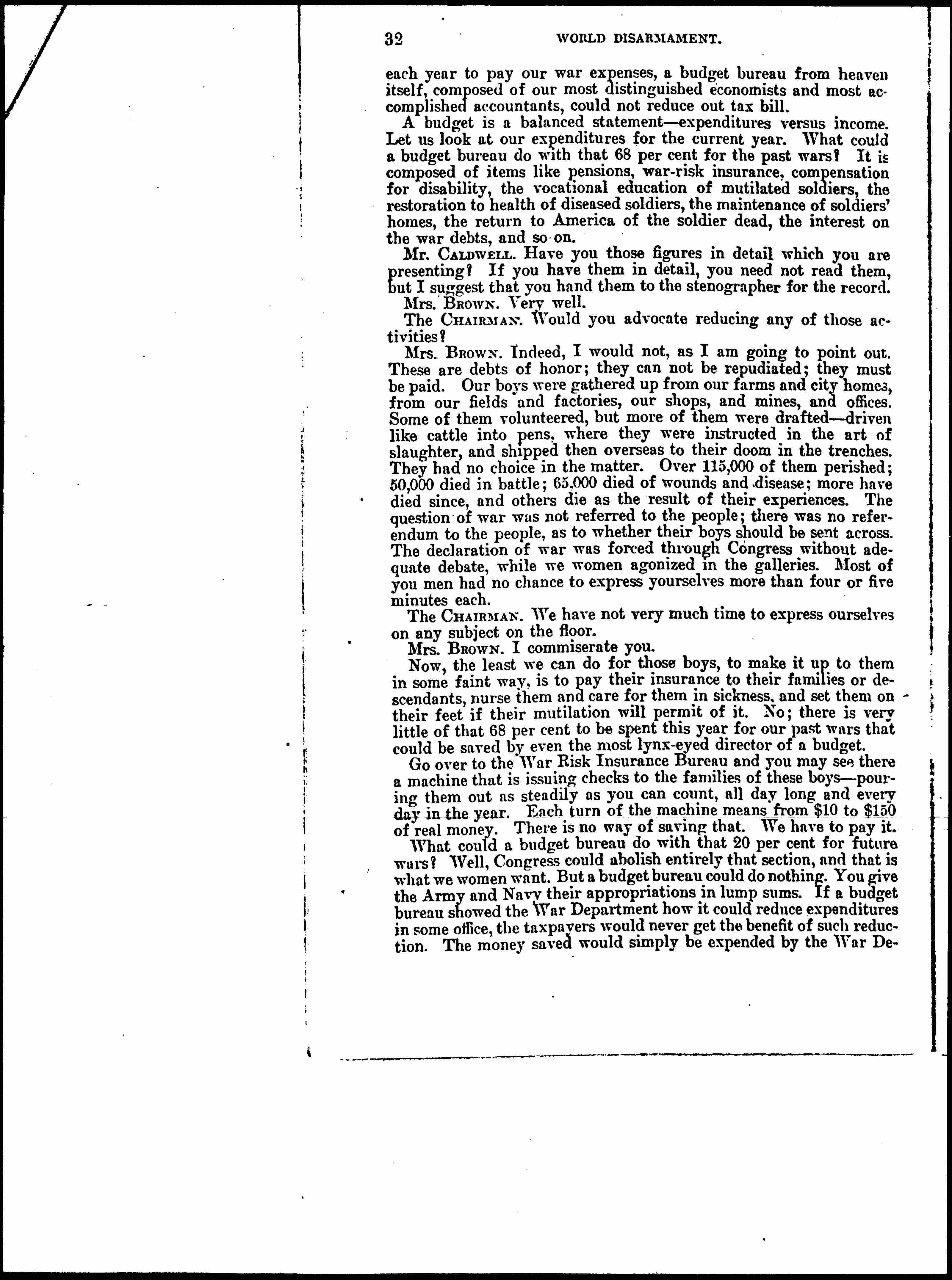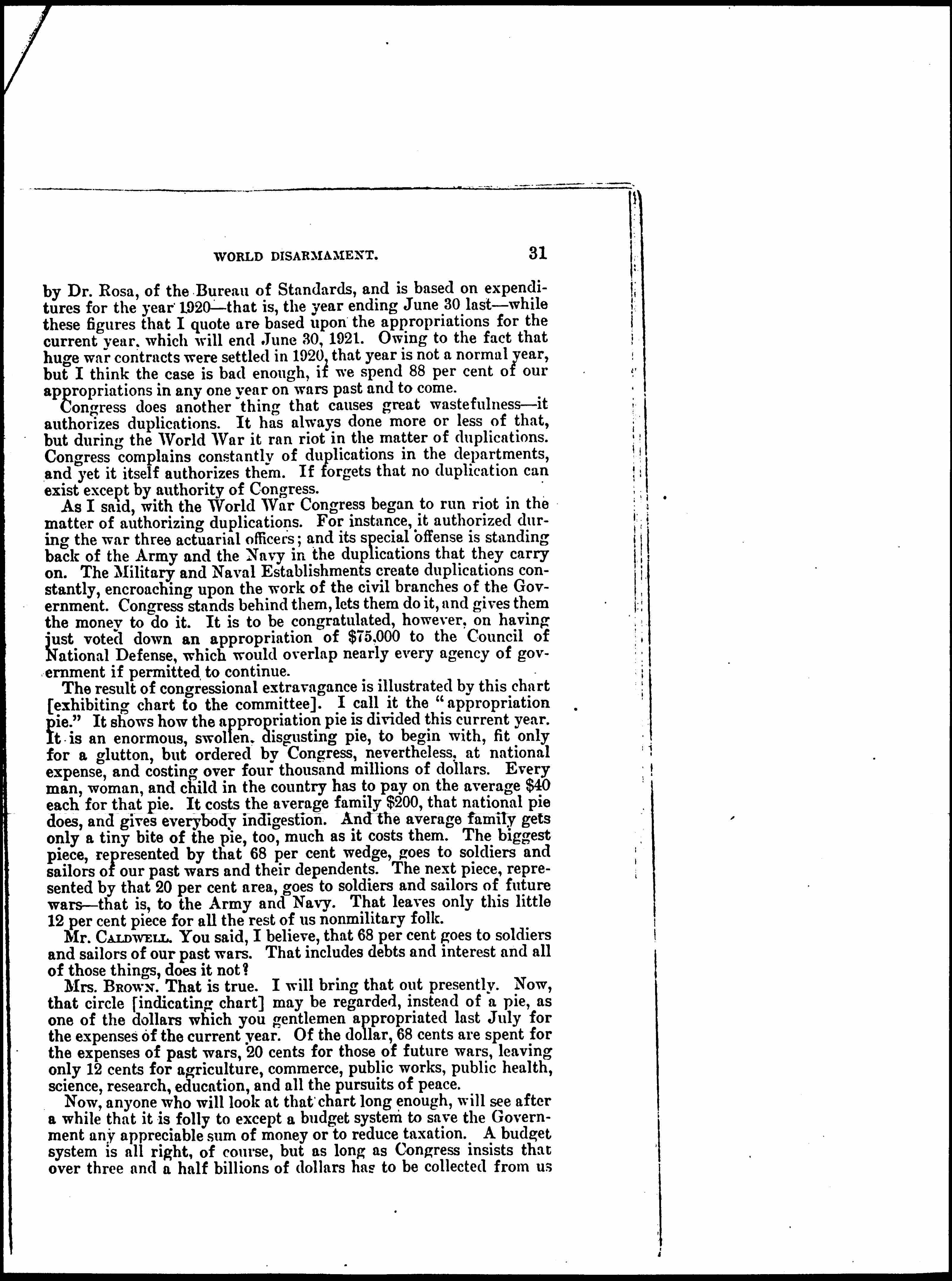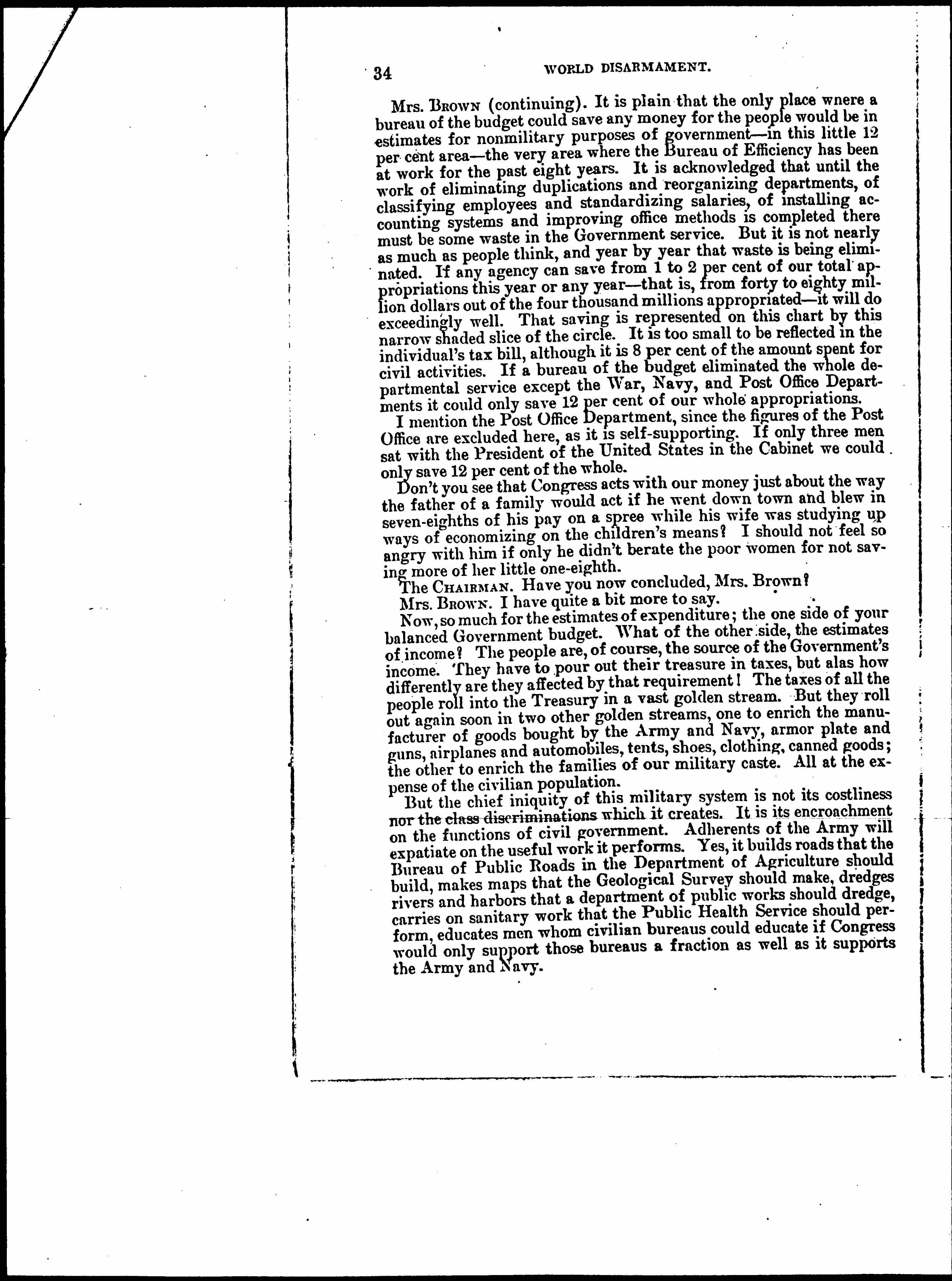 What could a budget bureau do with that 20 [percent] for future wars? Well, Congress could abolish entirely that section, and that is what we women want. But a budget bureau could do nothing. You give the Army and Navy their appropriations in lump sums. If a budget bureau showed the War Department how it could reduce expenditures in some office, the taxpayers would never get the benefit of such reduction. The money saved would simply be expended by the War Department [page 5] in some new war work. A new batch of contractors might be made happy. Or a few more [prerequisites] might be granted officers -- additional automobiles or launches or [wagonettes] or heaven knows what to make life easier for them. I happen to know that the Bureau of Efficiency saved a quarter of a million dollars last year by simplifying routine jobs in a certain division of the War Department, but it is impossible to find that the estimates were correspondingly reduced. The only way to reduce expenditures in the War and Navy Departments is to reduce the size of the lumps you give them. That is what we want you to do until you give them nothing or practically nothing. At least, you can go back to the prewar basis and do it now.