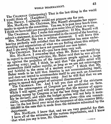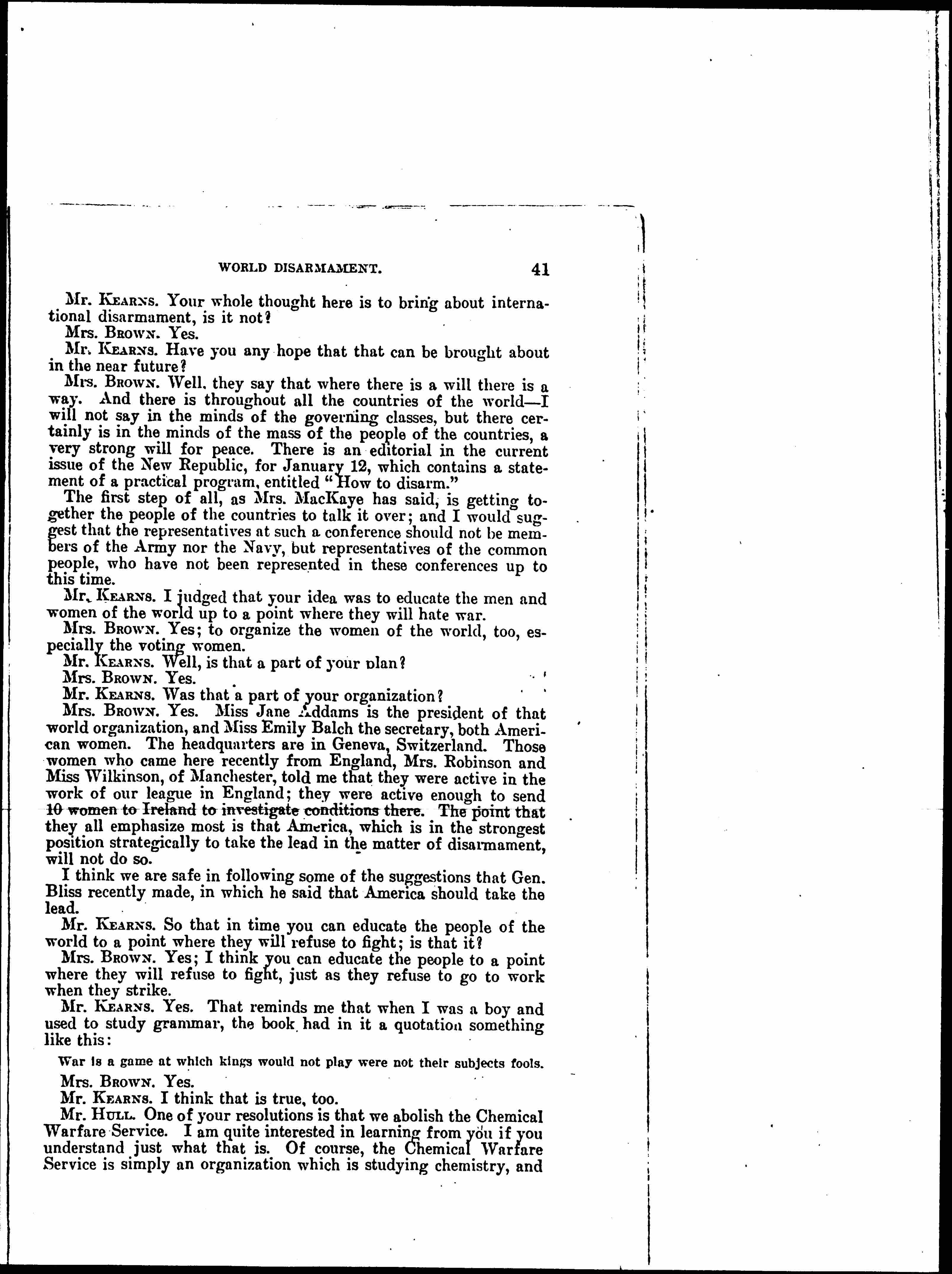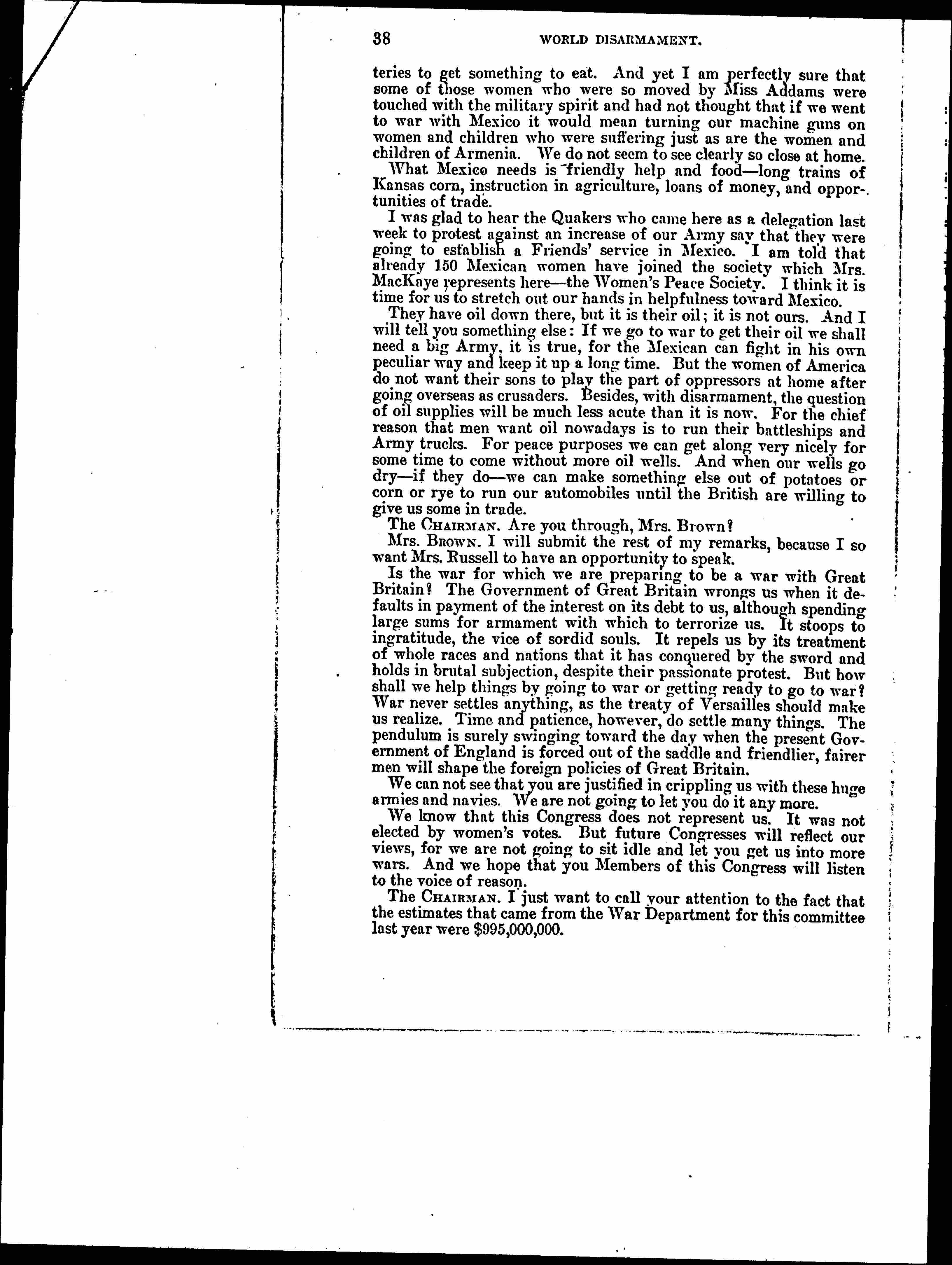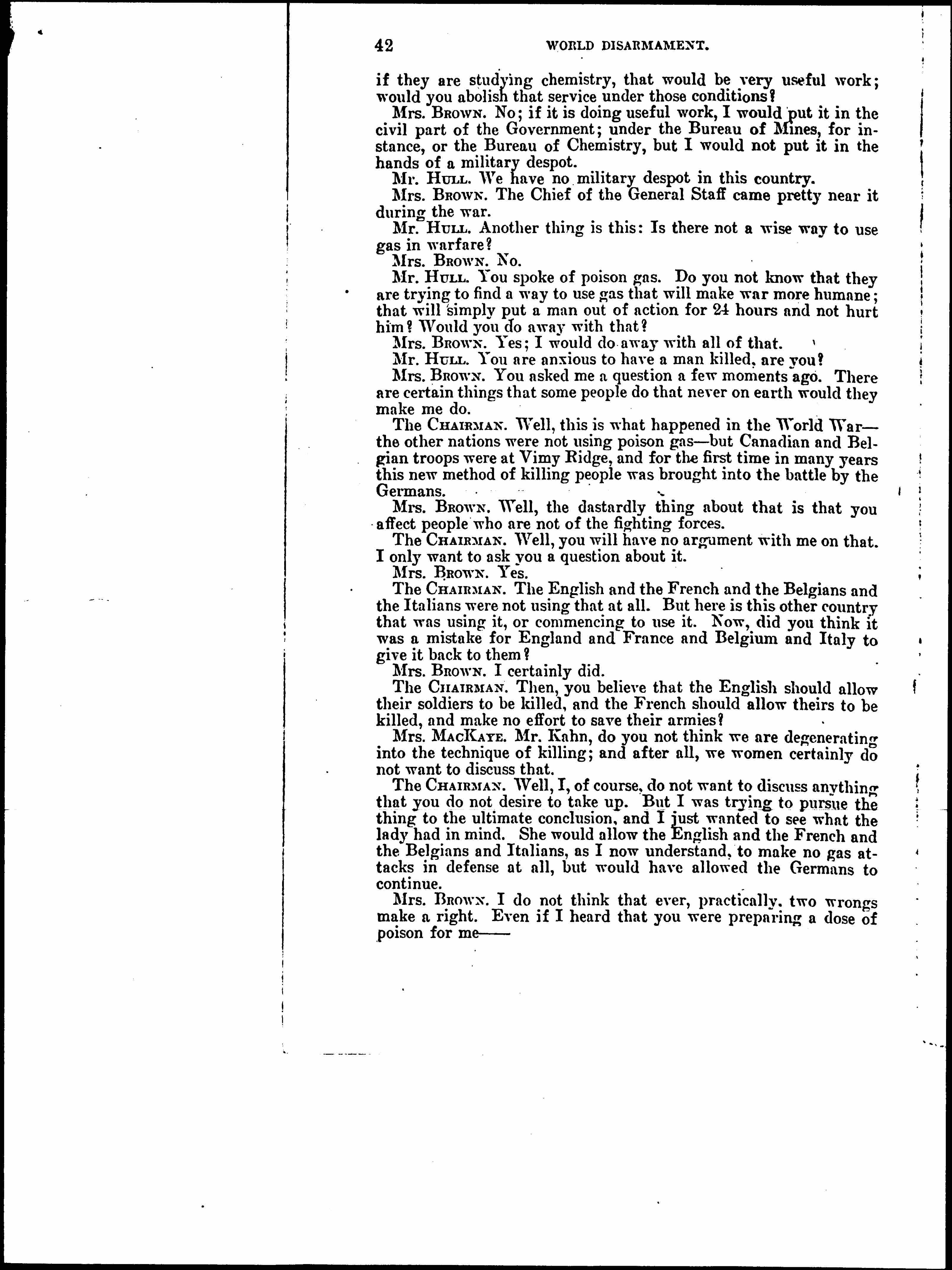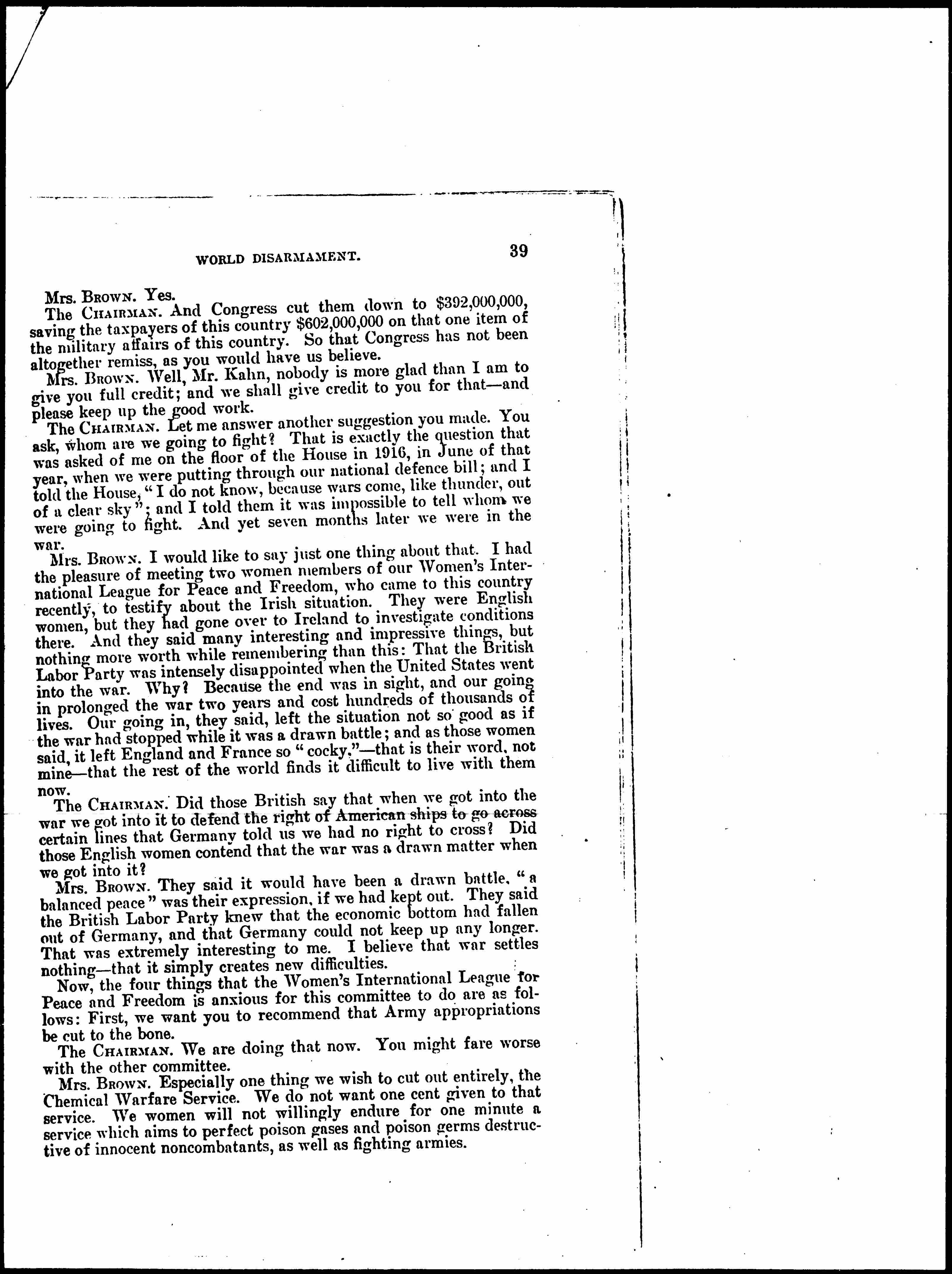 Mrs. BROWN. Especially one thing we wish to cut out entirely, the Chemical Warfare Service. We do not want one cent given to that service. We women will not willingly endure for one minute a service which aims to perfect poison gases and poison germs destructive to innocent noncombatants, as well as fighting armies. [page 12]