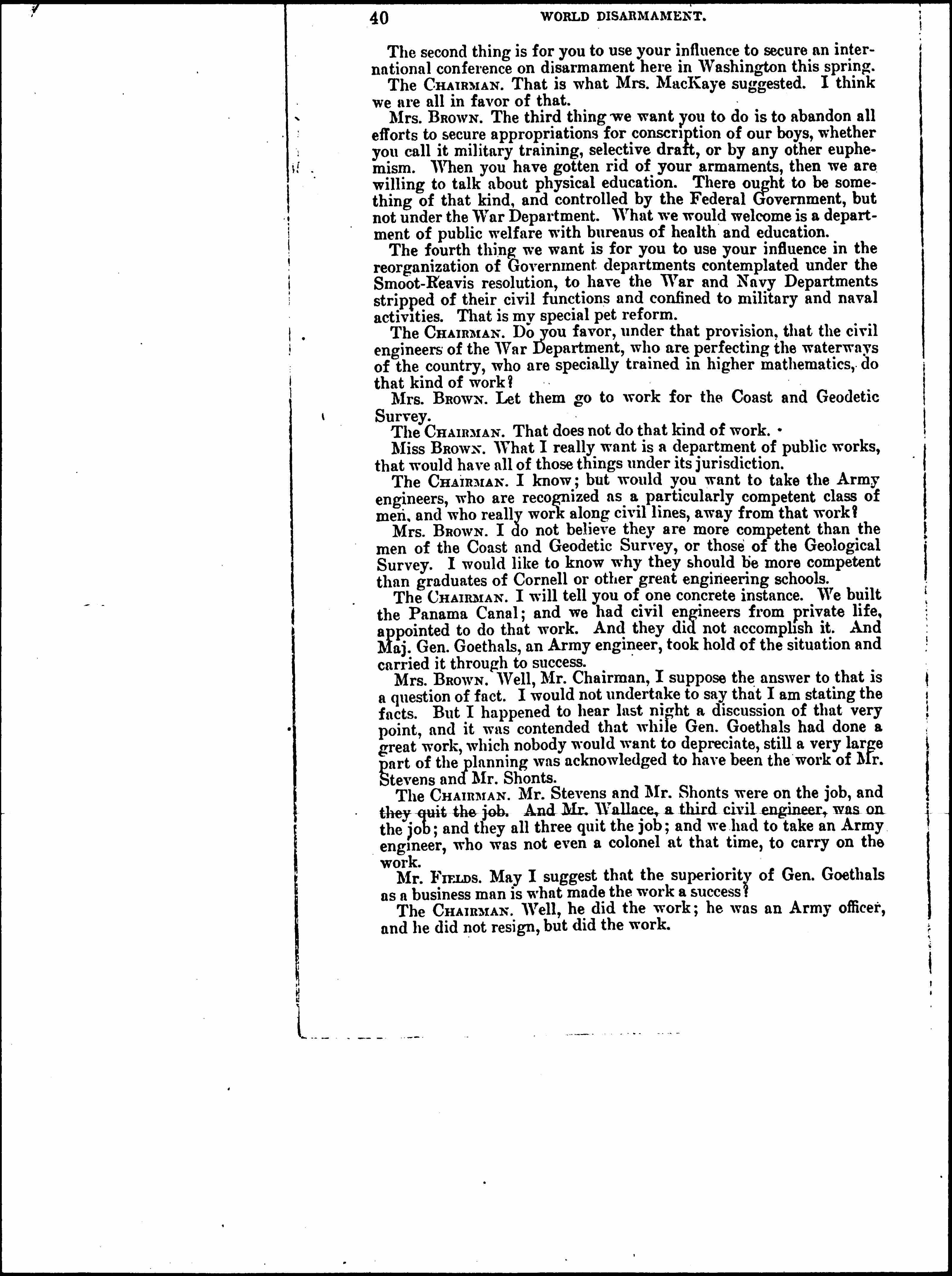 Mrs. BROWN. Well, Mr. Chairman, I suppose the answer to that is a question of fact. I would not undertake to say that I am stating the facts. But I happened to hear last night a discussion of that very point, and it was contended that while Gen. Goethals had done a great work, which nobody would want to depreciate, still a very large part of the planning was acknowledged to have been the work of Mr. Stevens and Mr. Shonts.