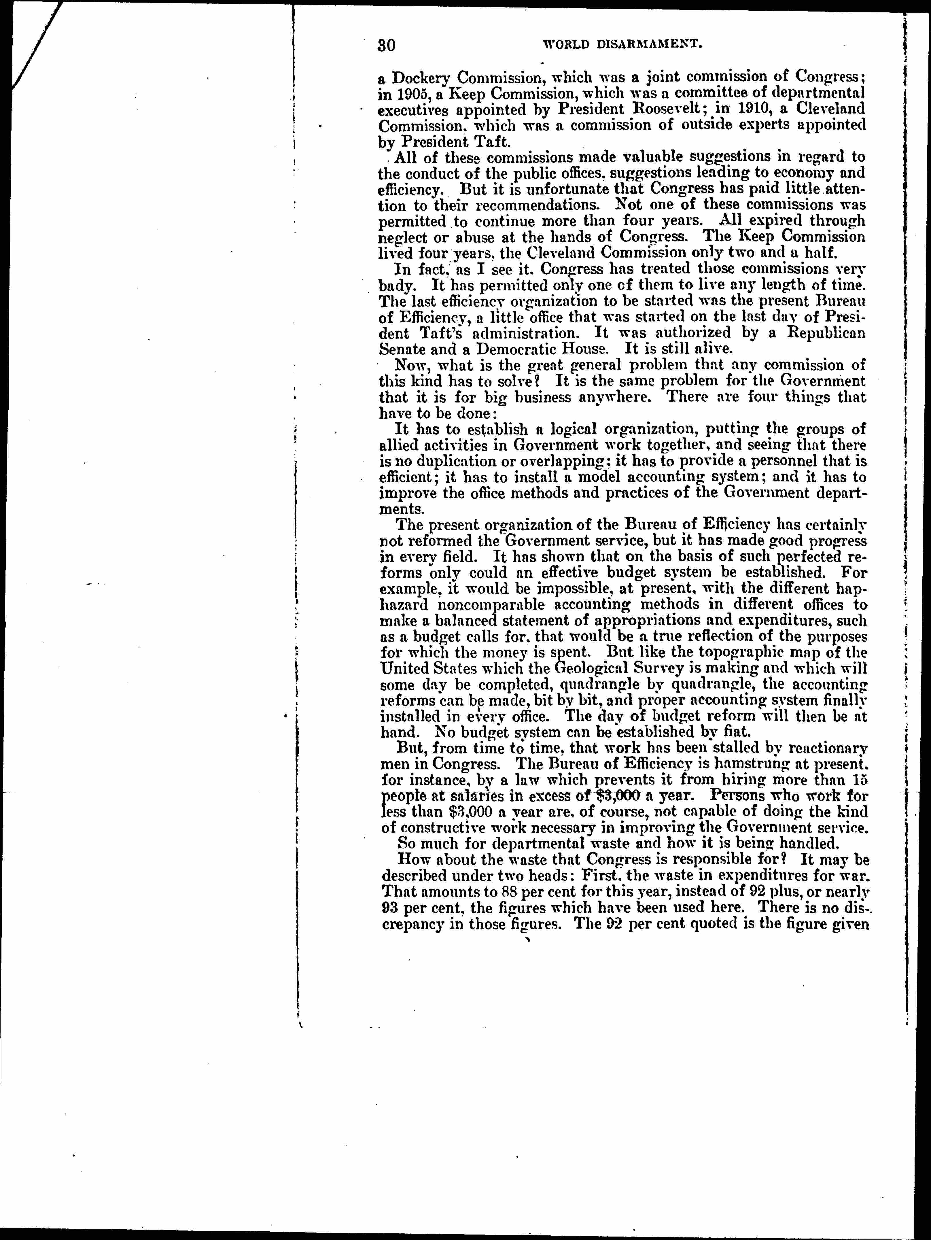 There have been various efforts to purge the departments of extravagance. Some of these efforts were initiated by Congress, some by Chief Executives, the last by a private individual who went to Congress personally and asked for an appropriation to do efficiency work in the departments. In 1887 there was a Cockerell Commission, which was a select committee of the Senate; in 1893, [page 2] a Dockery Commission, which was a joint commission of Congress; in 1905, a Keep Commission, which was a committee of departmental executives appointed by President Roosevelt; in 1910, a Cleveland Commission, which was a commission of outside experts appointed by President Taft.