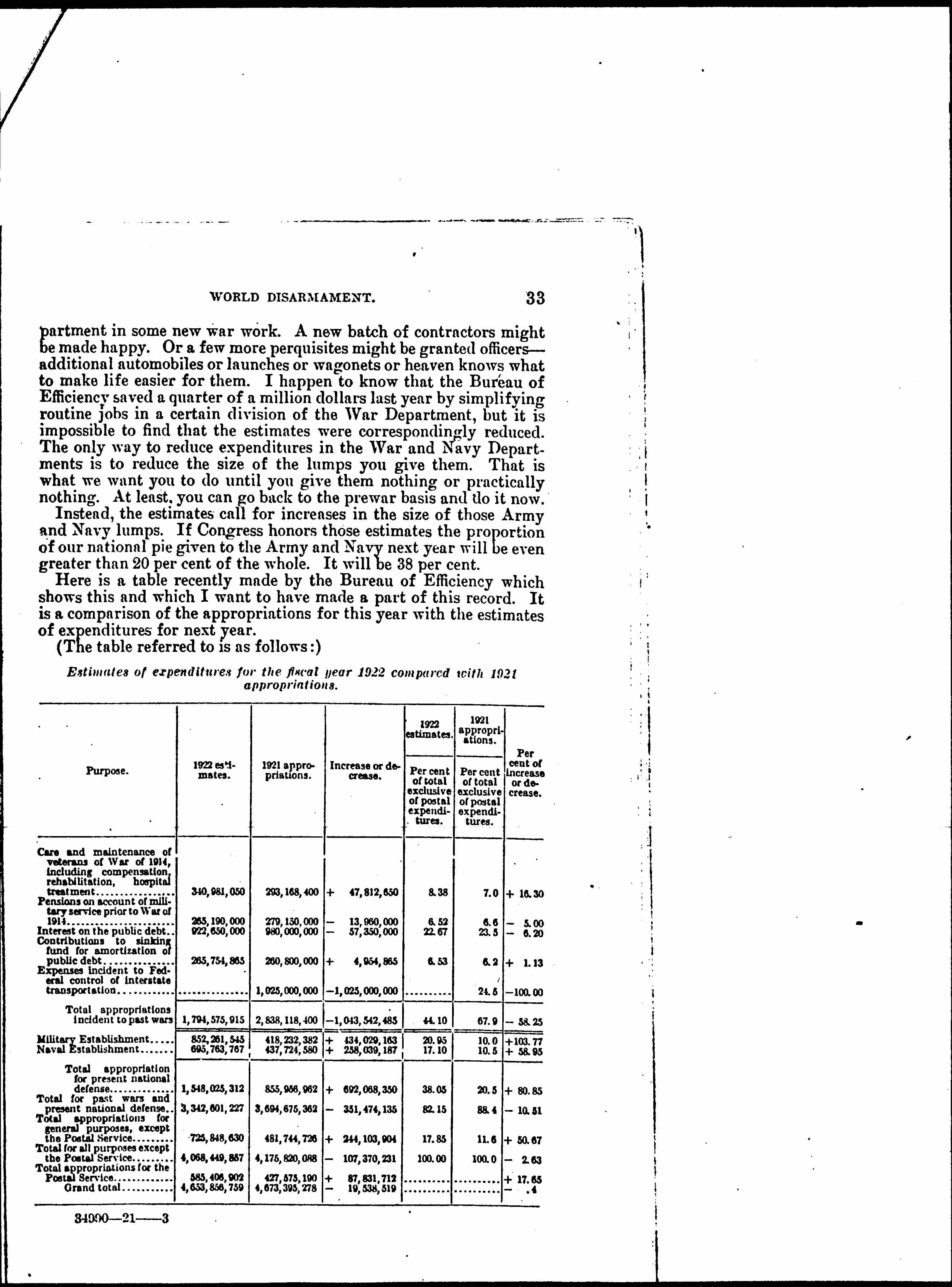 How about the waste that Congress is responsible for? It may be described under two heads: First, the waste in expenditures for war. That amounts to 88 [percent] for this year, instead of 92 plus, or nearly 93 [percent], the figures which have been used here. There is no discrepancy in those figures. The 92 [percent] quoted is the figure given [page 3] by Dr. Rosa, of the Bureau of Standards, and is based on expenditures for the year 1920 -- that is, the year ending June 30 last -- while these figures that I quote are based upon the appropriations for the current year, which will end June 30, 1921. Owing to the fact that huge war contracts were settled in 1920, that year is not a normal year, but I think the case is bad enough, if we spend 88 [percent] of our appropriations in any one year on wars past and to come.
